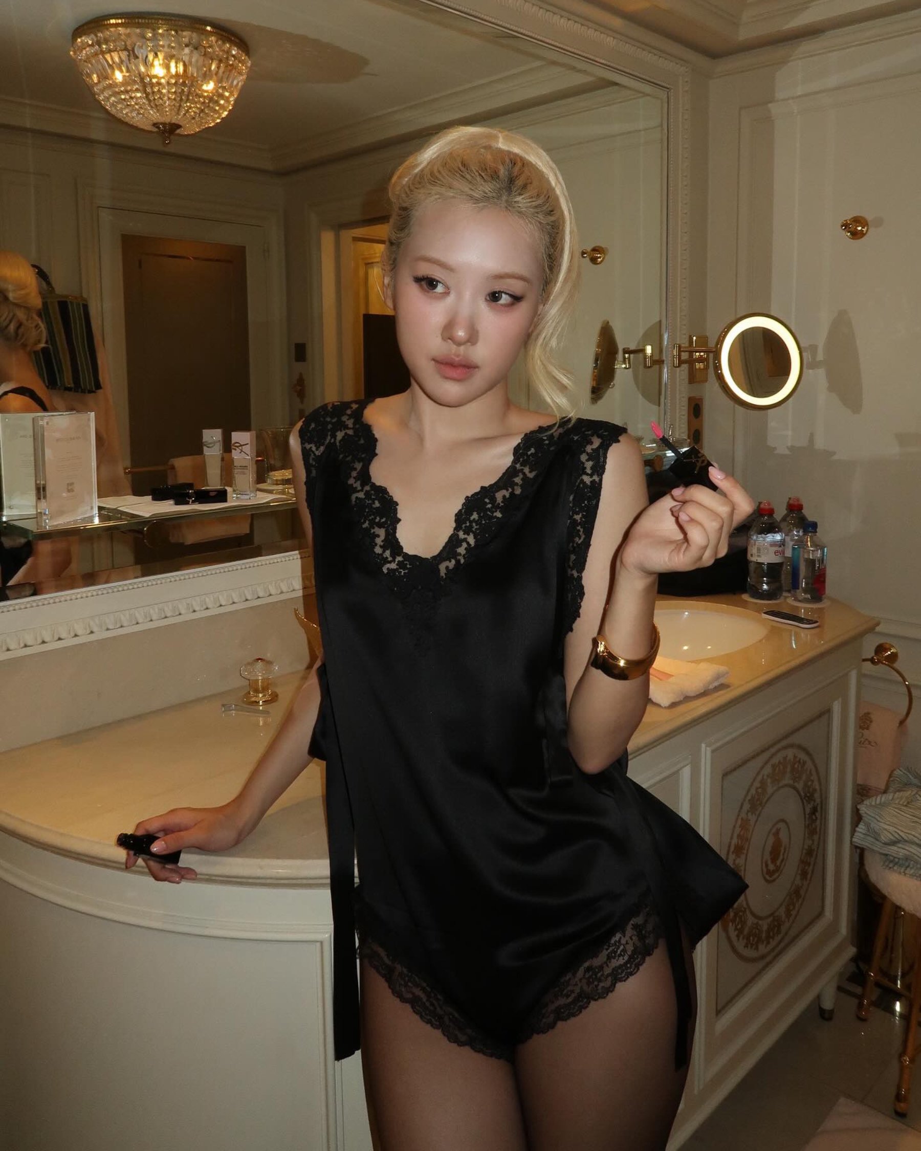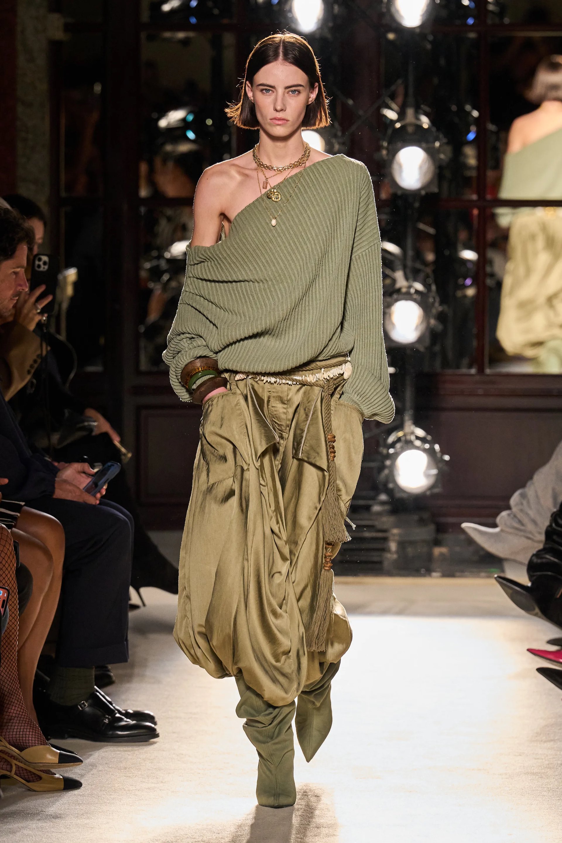 Quay trở lại ngày đầu tiên bắt đầu Tuần lễ Thời trang được chờ đợi nhất năm, Saint Laurent khiến giới mộ điệu đứng ngồi không yên khi cùng dàn đại sứ và khách mời lăng xê thời trang đồ ngủ. Trong khi Đại sứ Toàn cầu Rosé tiếp tục trở thành tâm điểm chú ý khi xuất hiện trong romper xanh pastel mang cảm hứng nội y, vừa thanh lịch vừa gợi cảm thì dàn khách mời như: Hailey Bieber, Zoë Kravitz, Charli XCX hay nàng tân binh Annie Moon (AllDay Project) lại ghi điểm với muôn vàn bản phối khác nhau cùng váy ngủ lụa, satin. Và tất nhiên, quý cô Kim Trendy không thể nằm ngoài cuộc chơi xu hướng, khi khép lại "chuỗi diện đồ ngủ tại fashion show" với thiết kế màu xanh xám ánh bạc nằm trong BST Xuân hè 2026, áo hai dây dáng suông phối cùng chân váy midi lệch hông.