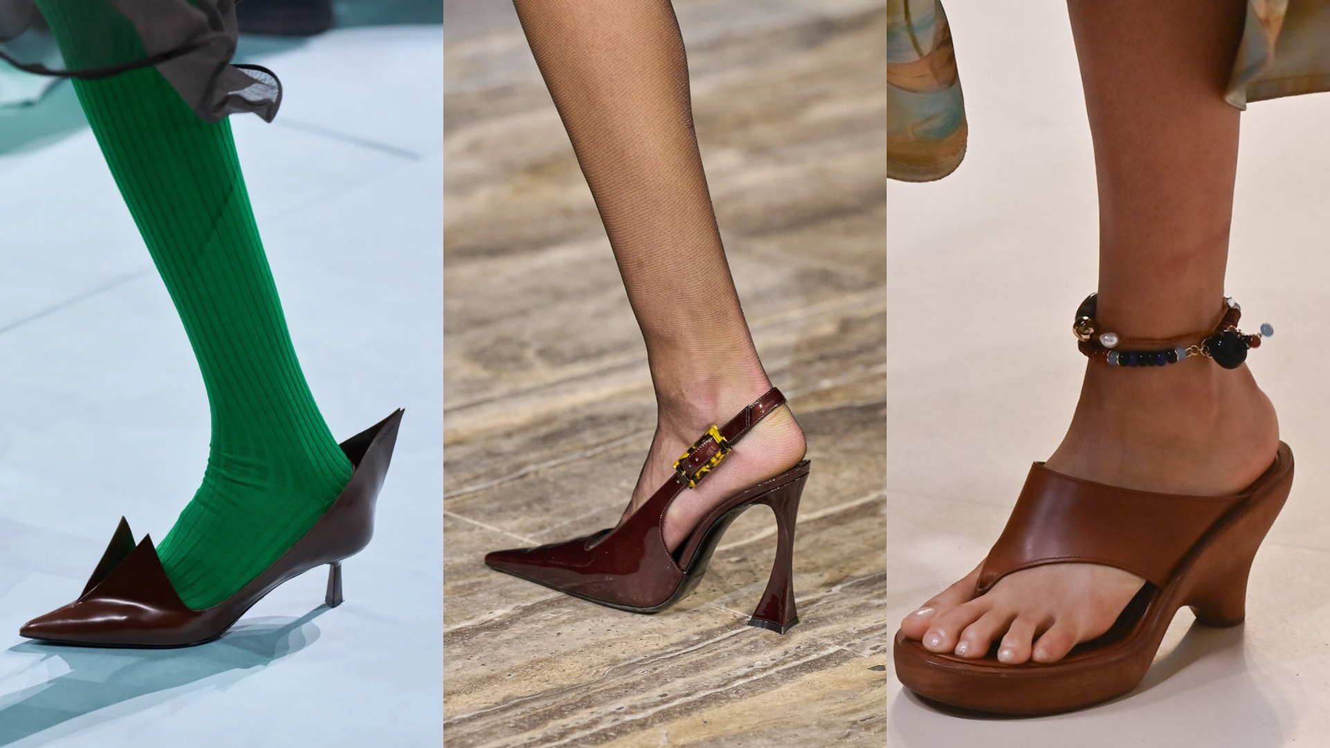 Miuccia Prada luôn biết cách gây chú ý, lần này là bằng màn ra mắt đôi giày cao gót hở mũi gây tranh cãi, được tạo kiểu với một đôi tất “tí hon” chỉ vừa một phần bàn chân, có đóng nhãn Miu Miu, cùng chi tiết quai ngang từ giày Mary Janes. Trong khi đó, Dior thách thức khả năng chịu nóng của người mang khi tích hợp phần dép xỏ ngón với phần thân là bốt gối.