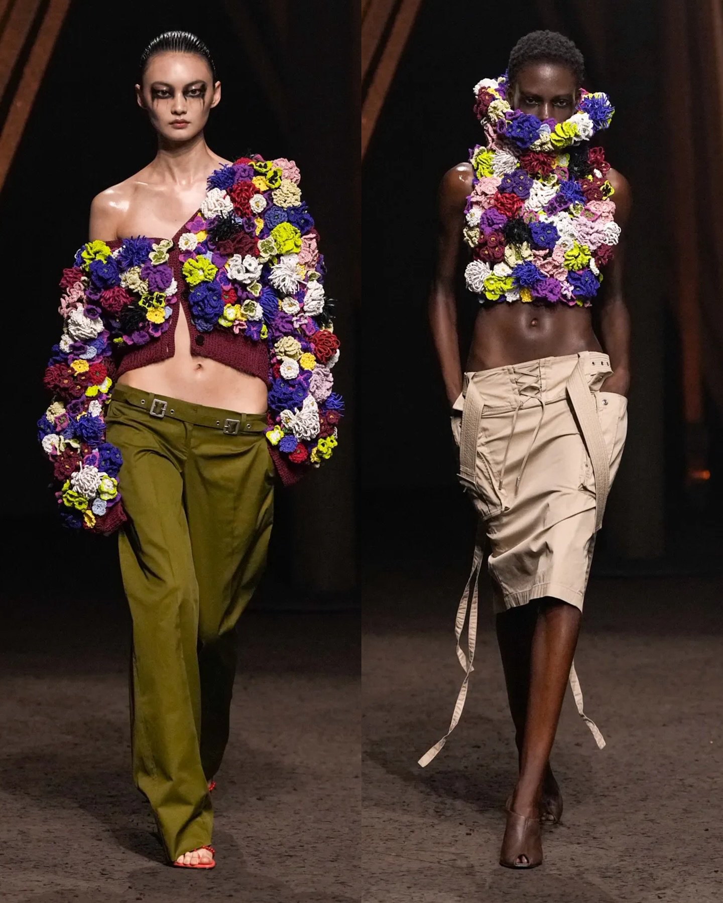 Ở vài thiết kế, McGirr cho dựng hẳn những khối 3D mô phỏng một vườn hoa bằng len, hay cụm tua rua như nhụy nở như thể cơ thể người đang được bao phủ bởi lớp vỏ thực vật sống. Mọi thứ đều sinh sôi, tràn lan, thiếu kiểm soát như khu rừng vừa vượt qua mùa mưa.