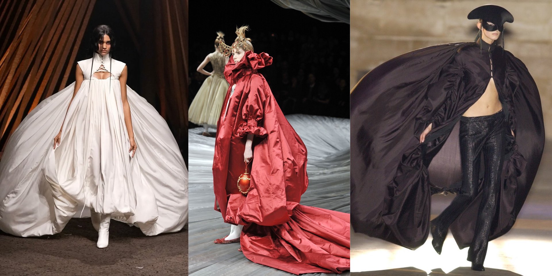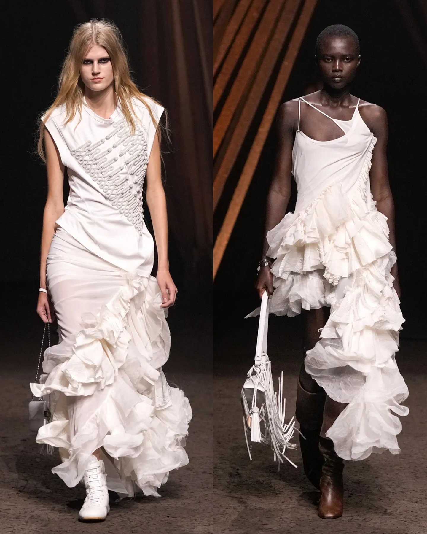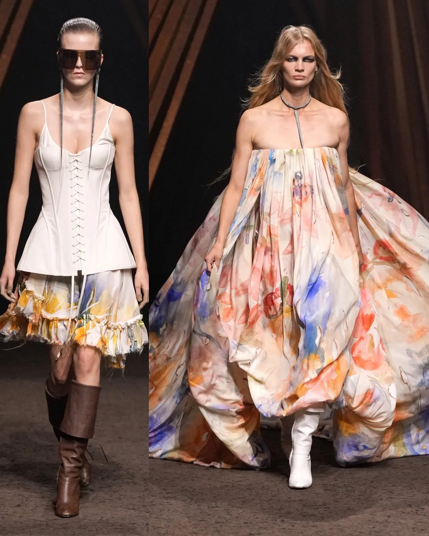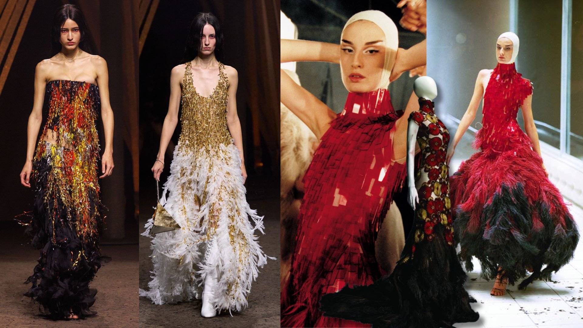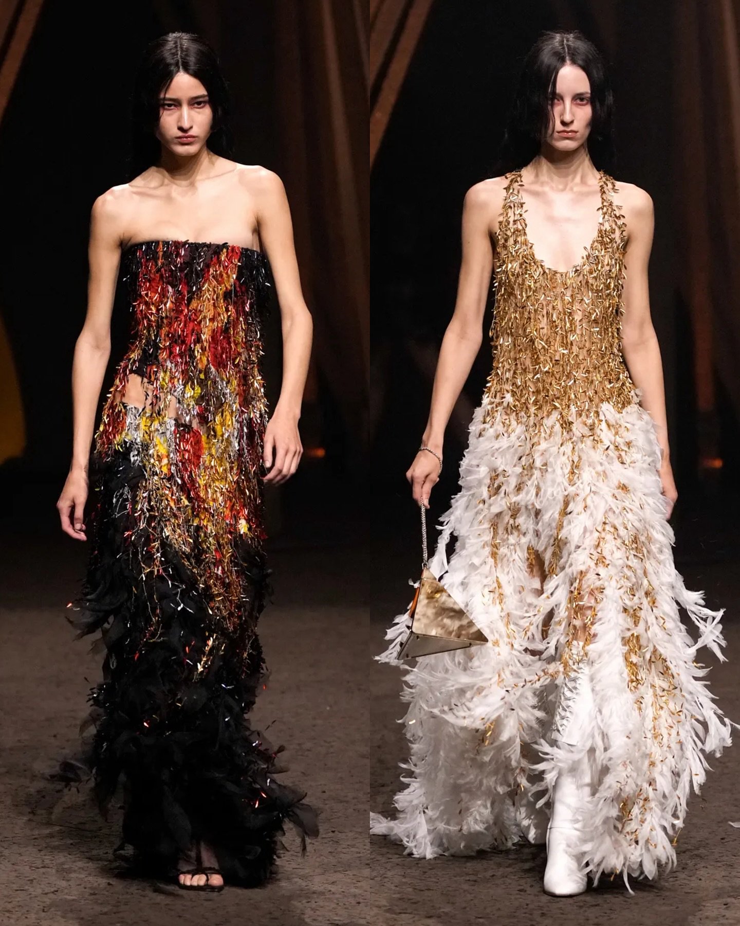 Điển hình nhất là hai chiếc đầm lông vũ xuất hiện gần cuối show: một đen - đỏ - vàng như đang bốc cháy, một trắng - vàng như tro bụi lấp lánh. Cả hai như vang vọng tinh thần của một trong những bộ sưu tập huyền thoại nhất của McQueen Voss (Xuân Hè 2001) - nơi cơ thể phụ nữ được bao bọc bởi sinh vật lai giữa chim, bướm và giáp trụ. Nhưng McGirr không giam người phụ nữ vào hộp kính như McQueen từng làm.