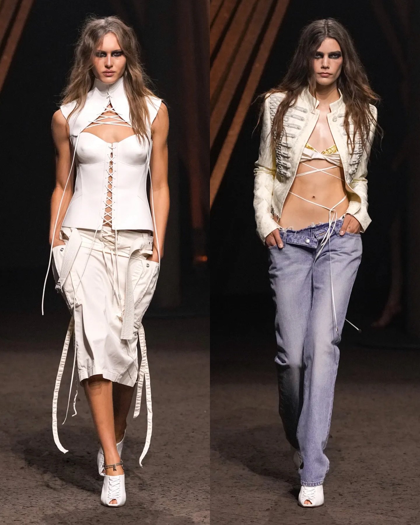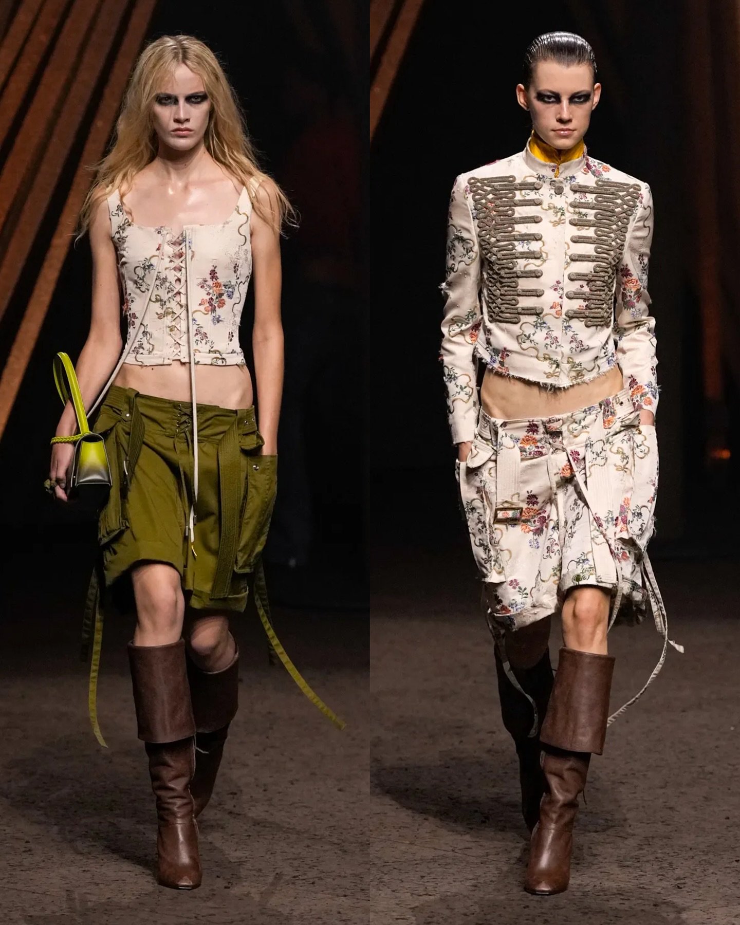 Corset, thay vì đóng vai trò là khung định hình vóc dáng, giờ trở thành một điểm nhìn thị giác gai góc – McGirr cắt nó thành từng mảng, làm ngắn lại, đẩy cao lên boots hoặc lan ra phần ngực của váy jacquard như những vết chém có chủ đích.