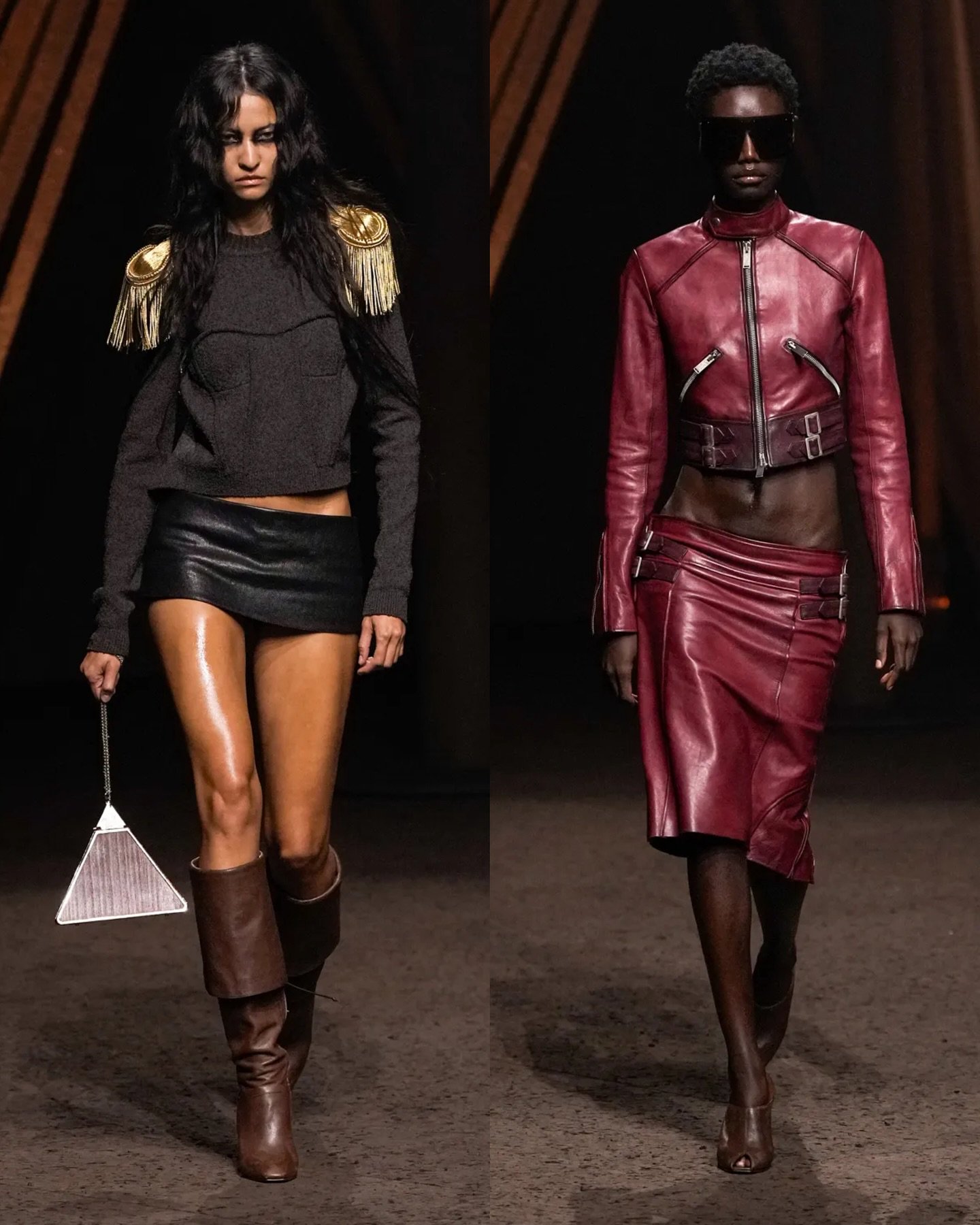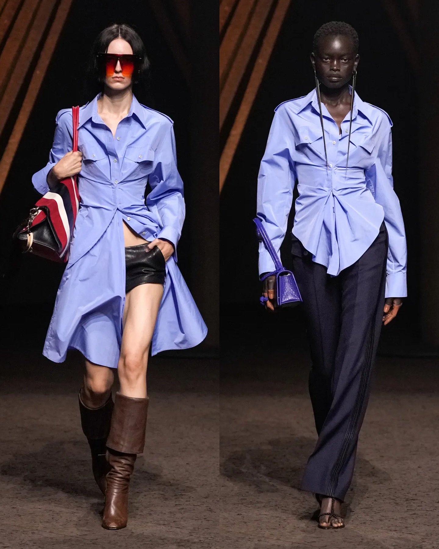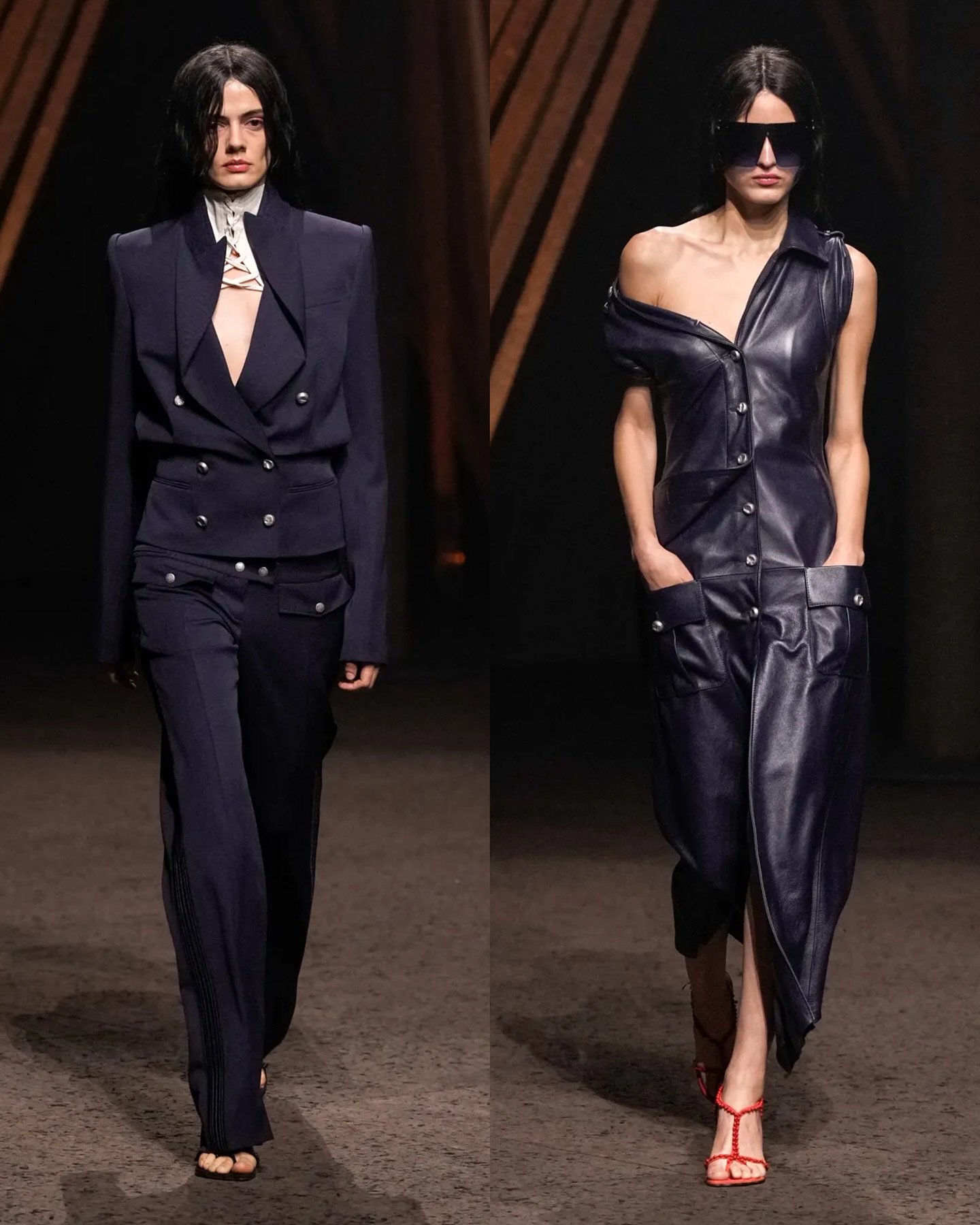Một số biểu tượng thiết kế kinh điển cũng được McGirr “giải mã” theo cách riêng: chiếc bumster từng là tuyên ngôn thị giác táo bạo nhất của Lee McQueen trong thập niên 1990 được tái sinh như một cơ chế sống: phần cạp trễ đi kèm chi tiết khóa kim loại có thể điều chỉnh, để người mặc chủ động xác định mức độ “phơi bày” của mình.