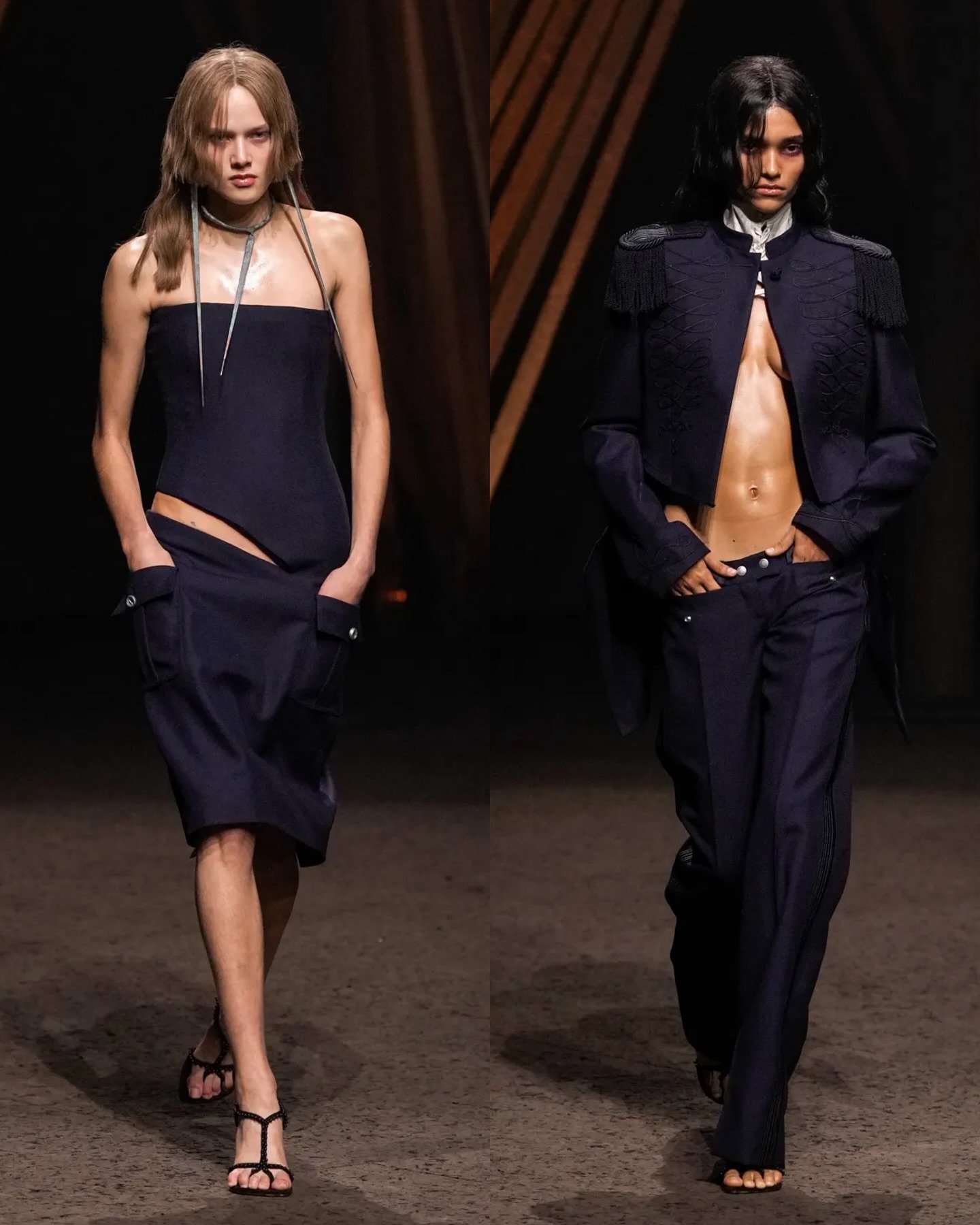 Những bộ đồng phục sĩ quan vốn là biểu tượng tối cao của kỷ luật và quyền lực bị tháo tung thành các mảnh vụn. Jacket bị cắt xẻ, ve áo bị xóa bỏ hoàn toàn, túi hộp bị dời khỏi vị trí chuẩn mực, trượt xuống hông, lệch khỏi logic quân sự. Chất liệu wool truyền thống của quân đội Anh được đưa vào… đầm bustier xẻ sâu – sự hoán vị khái niệm vừa thách thức vừa thi vị.