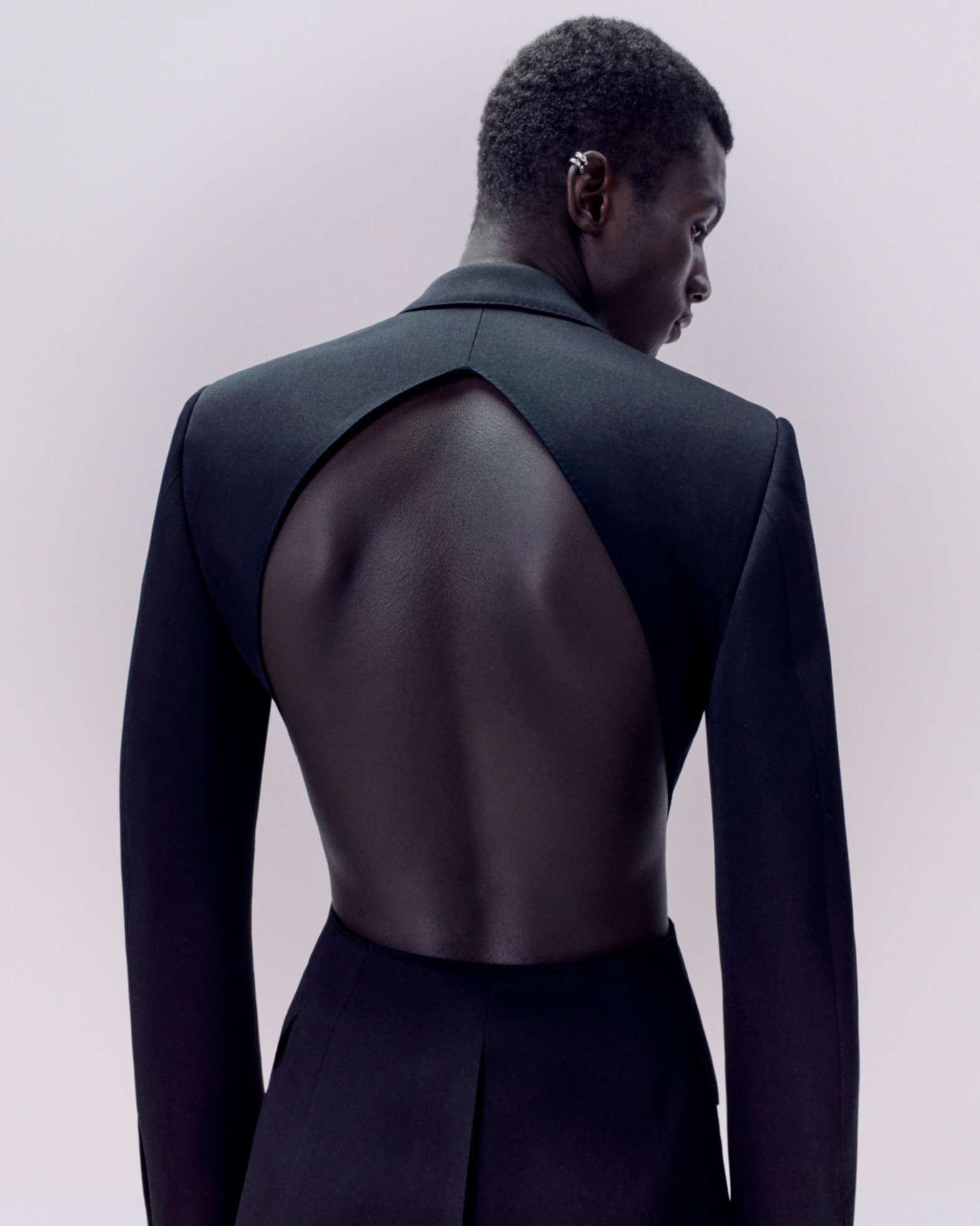 Quay ngược dòng thời trang, xu hướng này lần đầu tiên được tiên tri vào tháng giêng năm nay khi Kim Jones trình làng bộ sưu tập AW22 của mình cho Dior Men. Đó là một bộ cánh dệt kim rất Pháp, nhuộm sắc đen lịch lãm với chiếc quần lưng cao vừa vặn, đi cùng giày đính đá quý và mũ nồi da đen. Năng lượng đen tối và bí ẩn của bộ quần áo được cân bằng bằng một đường rạch ở phía sau từ cổ áo đến thắt lưng để lộ cả một bờ lưng của người mẫu nam. Tuy nhiên, backless cut-out trend thời điểm này ắt hẳn vẫn chưa thể vượt qua sức nóng của những đường cắt croptop ở phần áo của bộ suit hay những chiếc váy được lồng ghép trên trang phục của nam giới.