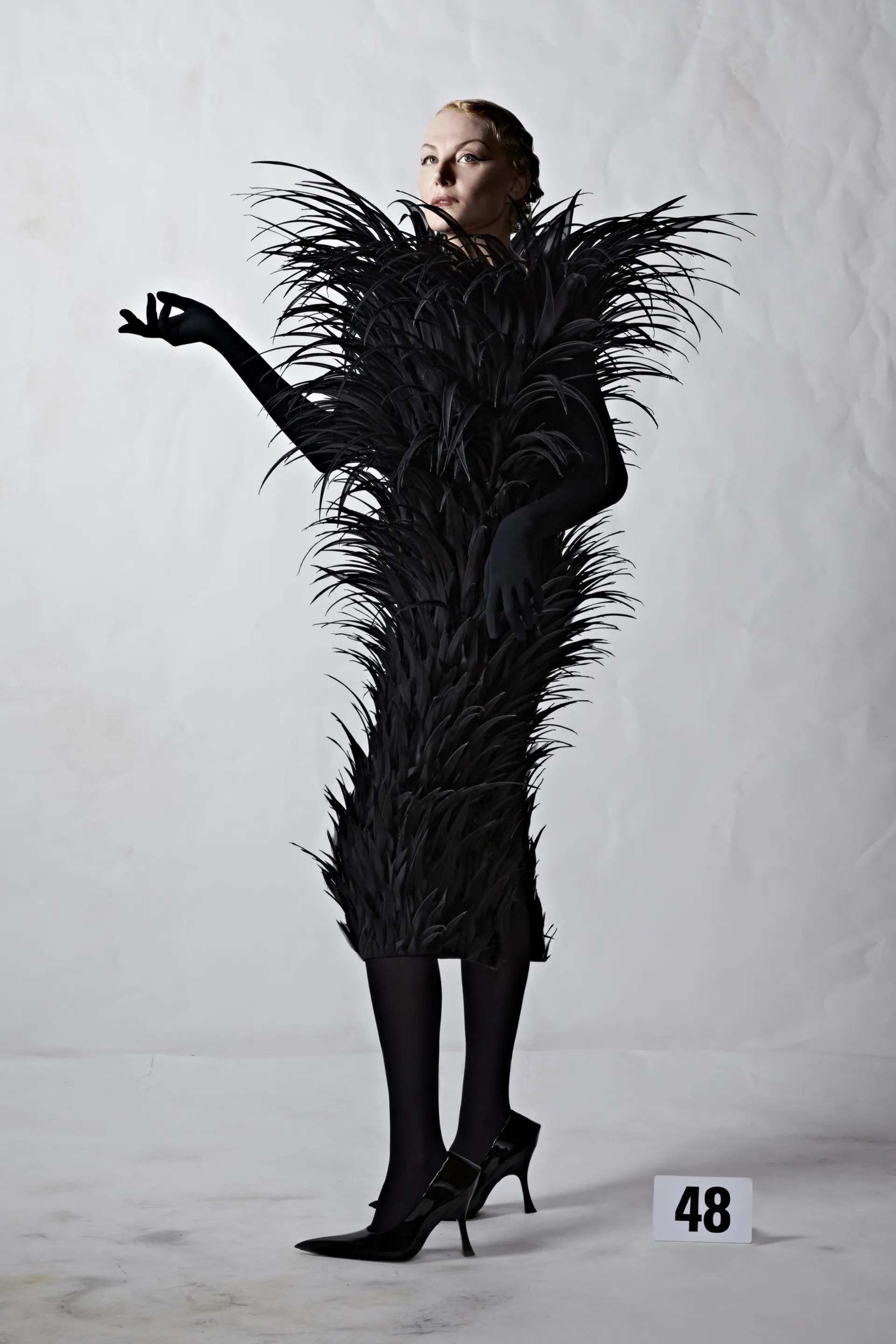 Trên nền nhạc cổ điển cùng đoạn thơ tình tiếng Pháp, Balenciaga đã khiến người xem thật tò mò và bàn tán về sự xuất hiện lần lượt của những thực thể ngoài hành tinh “vô diện” với những bộ đồ da trơn màu, vừa vặn cơ thể. Với sắc đen tuyền, phom dáng đơn giản, thoạt đầu người xem sẽ cho rằng show diễn sẽ không đúng chất “couture”. Tuy nhiên khi nhìn gần lại, chúng ta ta sẽ kinh ngạc với kỹ thuật xử lý chất liệu đẳng cấp hay những đường may không viền tuyệt hảo của đội ngũ Balenciaga cũng như của chính Demna. Không đơn giản sử dụng chất liệu latex nữa, ở bộ sưu tập này, Demna đã tạo nên một đồ phồng tự nhiên, thoải mái hơn latex gấp nhiều lần với lớp cao su Neoprene (polychloroprene) - một họ cao su tổng hợp được sản xuất bằng cách trùng hợp chloroprene, Neoprene thể hiện tính ổn định hóa học tốt và duy trì tính linh hoạt trong một phạm vi nhiệt độ rộng và thường được dùng trên đồ lặn. Những chiếc “váy lặn” của Demna được đúc siêu độc đáo, được thiết kế cùng với sự hợp tác của một nhà sản xuất Nhật Bản cùng sử dụng kỹ thuật bền vững limestone.
