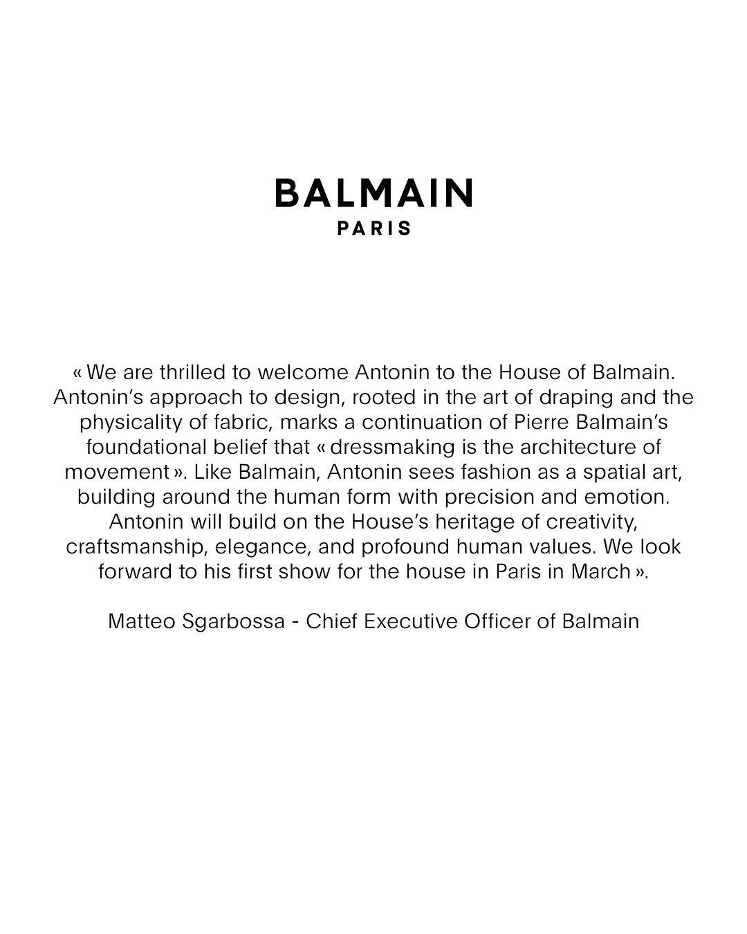 Tôi vô cùng vinh dự khi được gia nhập Balmain và biết ơn ông Rachid cùng Matteo vì đã tin tưởng giao cho tôi trách nhiệm tại ngôi nhà thời trang “phi thường” này. Tôi cũng muốn bày tỏ lòng tri ân tới Olivier Rousteing vì đã xây dựng Balmain trở thành thương hiệu toàn cầu như ngày hôm nay. Balmain sở hữu một lịch sử thực sự truyền cảm hứng.
