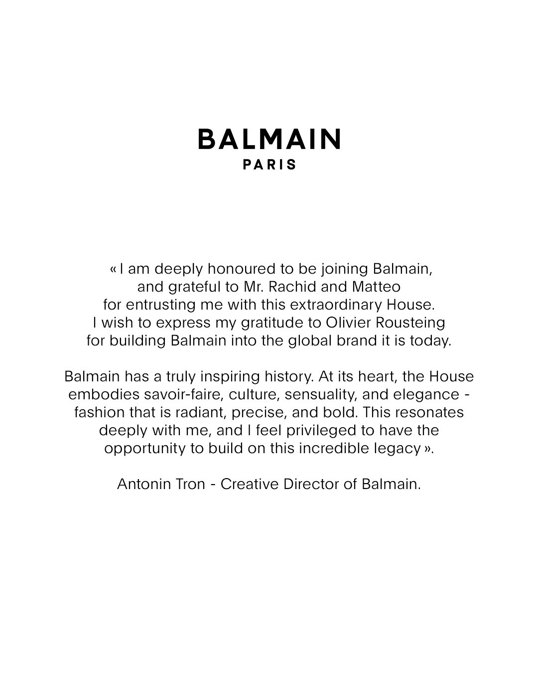 Khi chính thức trở thành một phần của Balmain, Antonin Tron bày tỏ: