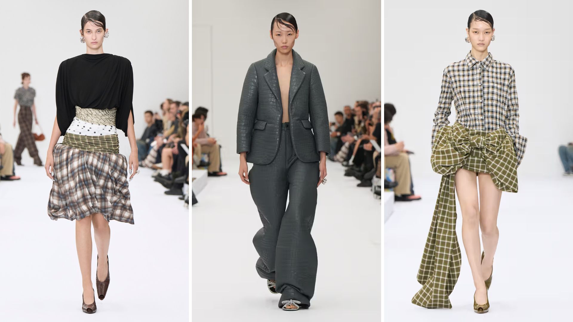 Màu sắc trong bộ sưu tập lần này được sử dụng một cách tiết chế nhưng đầy chủ ý, với những tông trung tính như be, tartan, trắng nhạt và olive, tạo nên sự đối lập mạnh mẽ với các điểm nhấn vàng đậm. Quần cạp thấp có phom dáng rộng rãi, được làm từ chất liệu denim dày, họa tiết chấm bi, hoa nhí phong cách thập niên 80 và crochet. Dù có kiểu dáng oversized, các thiết kế vẫn mang đậm nét điêu khắc, sắc sảo.