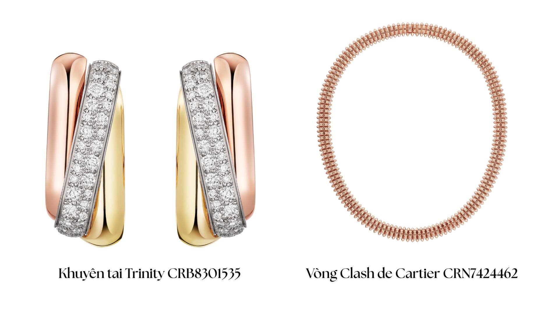Để truyền tải trọn vẹn tinh thần đó, Văn Mai Hương chọn hai thiết kế Cartier trong MV: khuyên tai Trinity CRB8301535 với ba sắc vàng đặc trưng là trắng, vàng và hồng 18K, đính 72 viên kim cương; vòng cổ Clash de Cartier CRN7424462 dáng double row bằng vàng hồng 18K. Sự kết hợp này mang lại vẻ đẹp tinh tế, sang trọng, tạo điểm nhấn cho những khung hình đậm chất nữ tính của MV.