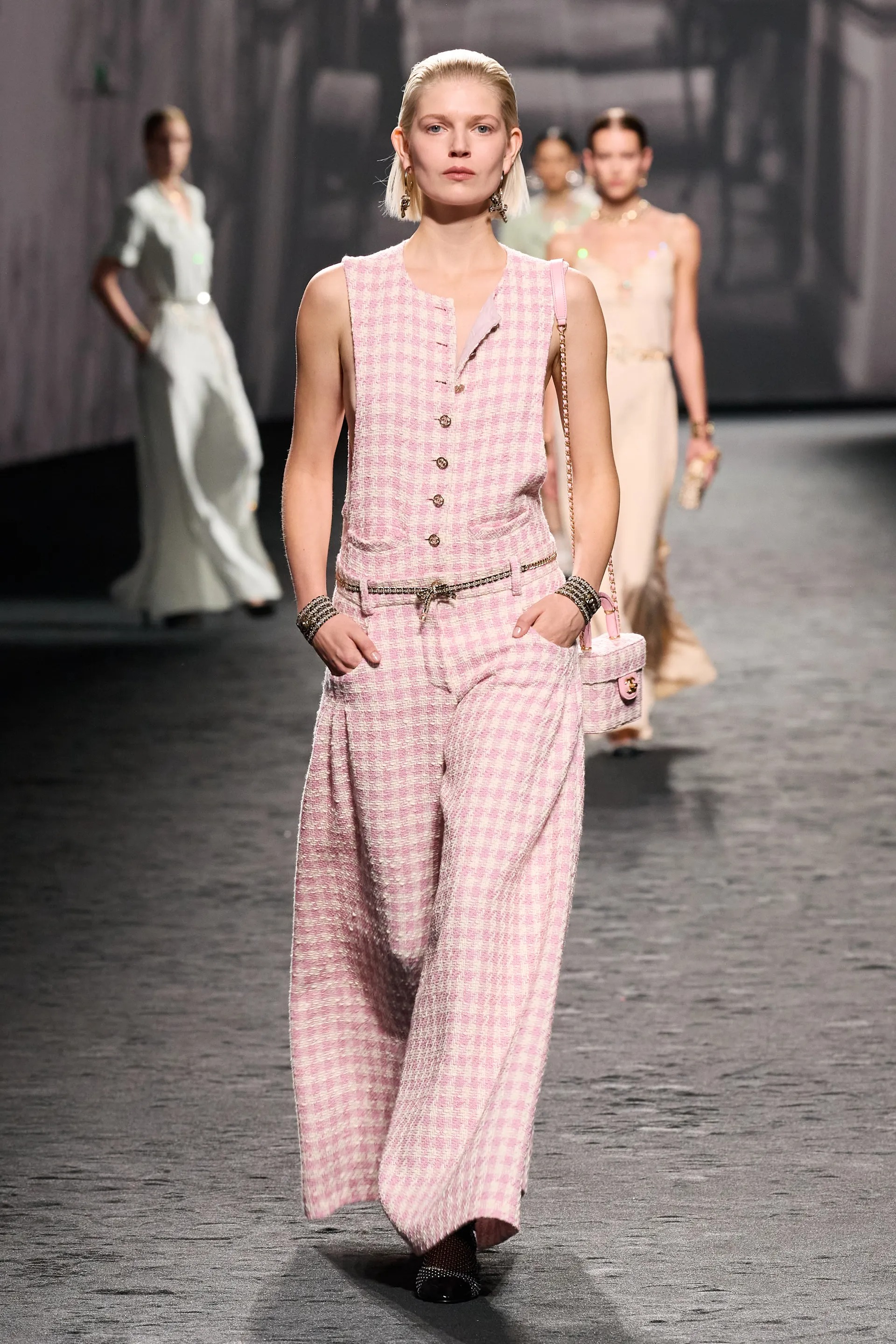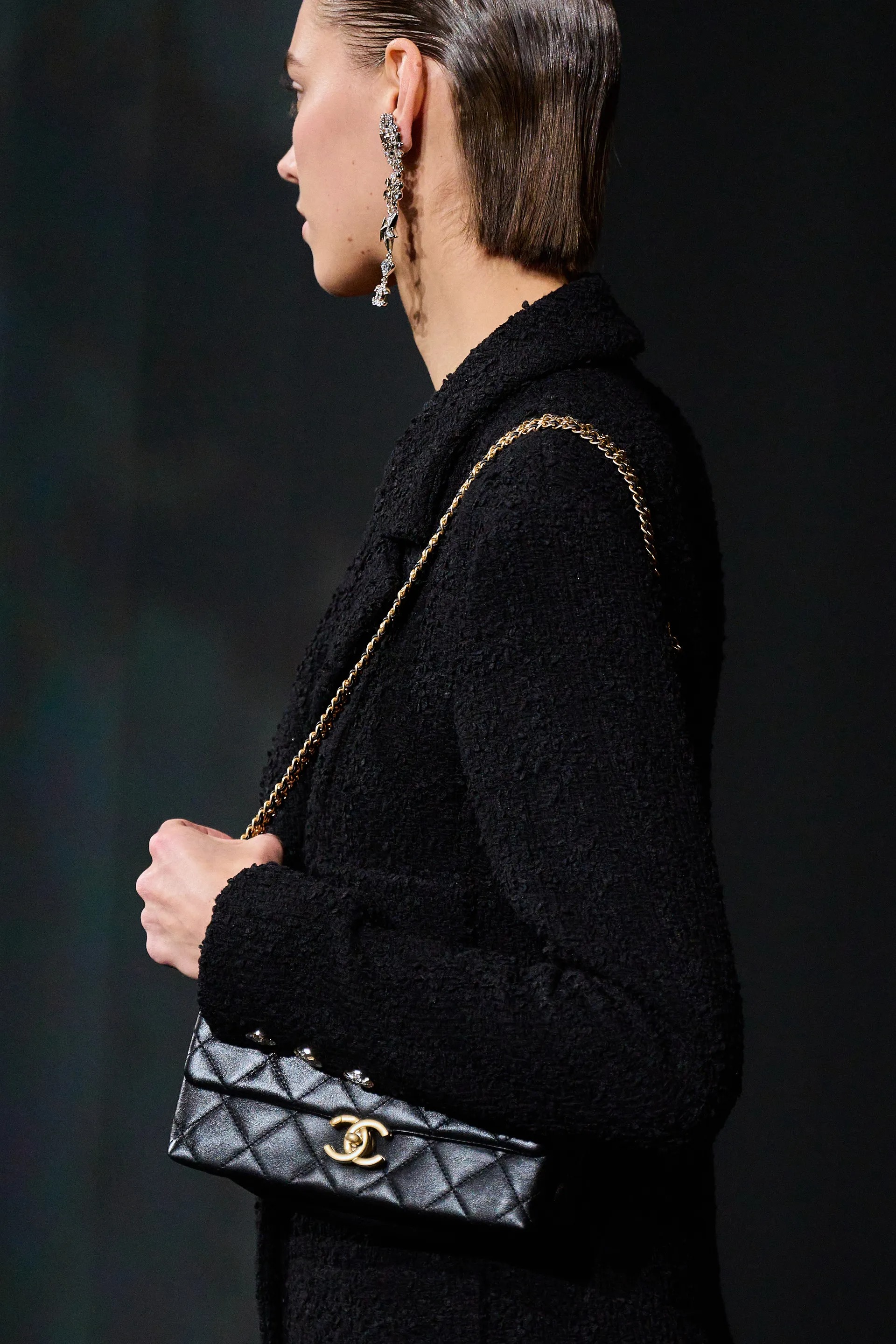 Hình ảnh Kristen Stewart mạnh mẽ, sắc sảo và đầy nam tính cũng xuất hiện mạnh mẽ xuyên suốt bộ sưu tập, từ những chiếc áo trễ vai, quần đùi rộng thùng thình và những bộ đồ rộng đậm chất Kristen. Chi tiết tay đút vào túi quần ở một số diện mạo cũng cho thấy được sự tinh tế của Chanel khi tái hiện lại sự phong thái từ nàng thơ của mình - chi tiết nhỏ này cũng khiến khiến Chanel trở nên khác biệt hơn, bớt sang trọng nhưng đầy tự do và phóng khoáng. Điểm nhấn của bộ sưu tập Xuân Hè còn nằm ở sự kết hợp hài hòa từ lớp trang sức như những sợi dây chuyền sợi mảnh, mạ vàng, bông tai thả lơ lửng; những chiếc túi iconic phiên bản nhỏ và cả những đôi bốt lưới pha lê lấp lánh.