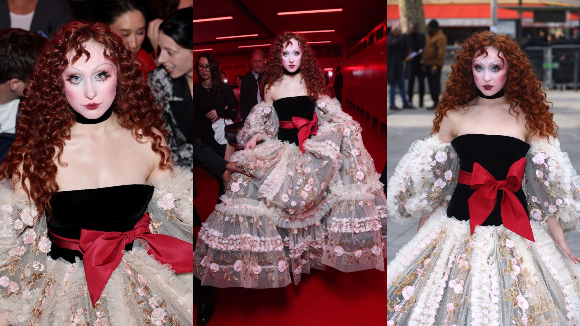 Chappell Roan kết thúc Paris Fashion Week của mình bằng màn ra mắt hoành tráng ở Valentino. Nữ ca sĩ yêu thích chủ nghĩa tối đa chọn một chiếc đầm dạ hội nhiều tầng Valentino, theo phong cách Marie Antoinette. Thiết kế gây ấn tượng với tùng váy xòe rộng, làm bằng vải nhung đen, điểm xuyết là một chiếc nơ đỏ to ở eo. Cô trang điểm theo phong cách Vaudevillian, với nước da hồng và lông mày cong, mỏng như bút chì. Đôi mắt long lanh như mắt búp bê nhờ hàng mi cong và phần mi dưới dài, nhọn; trong khi môi được đánh chúm chím.