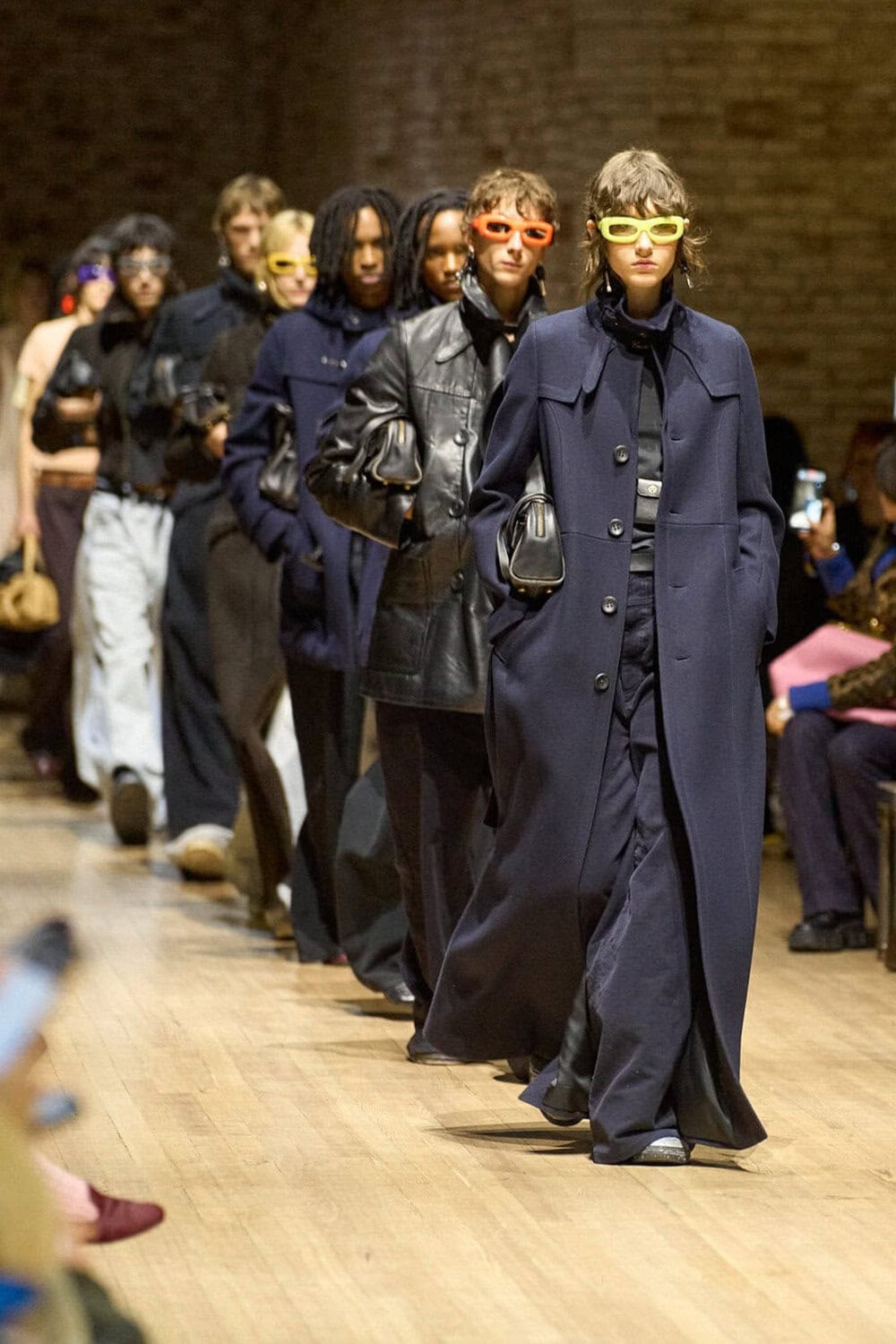 Hạng mục áo khoác của Coach Fall 2025 cũng là điểm nhấn tạo nên điều khác biệt. Sự chú ý của người xem neo trên những chiếc áo khoác trench coat phủi bụi sàn nhà bằng da cừu và da bóng loáng, áo khoác duffle, áo khoác peacoat và áo khoác lông báo giả; trong khi đó áo khoác blazer và áo vest may đo sở hữu tỷ lệ ngắn và bất đối xứng.