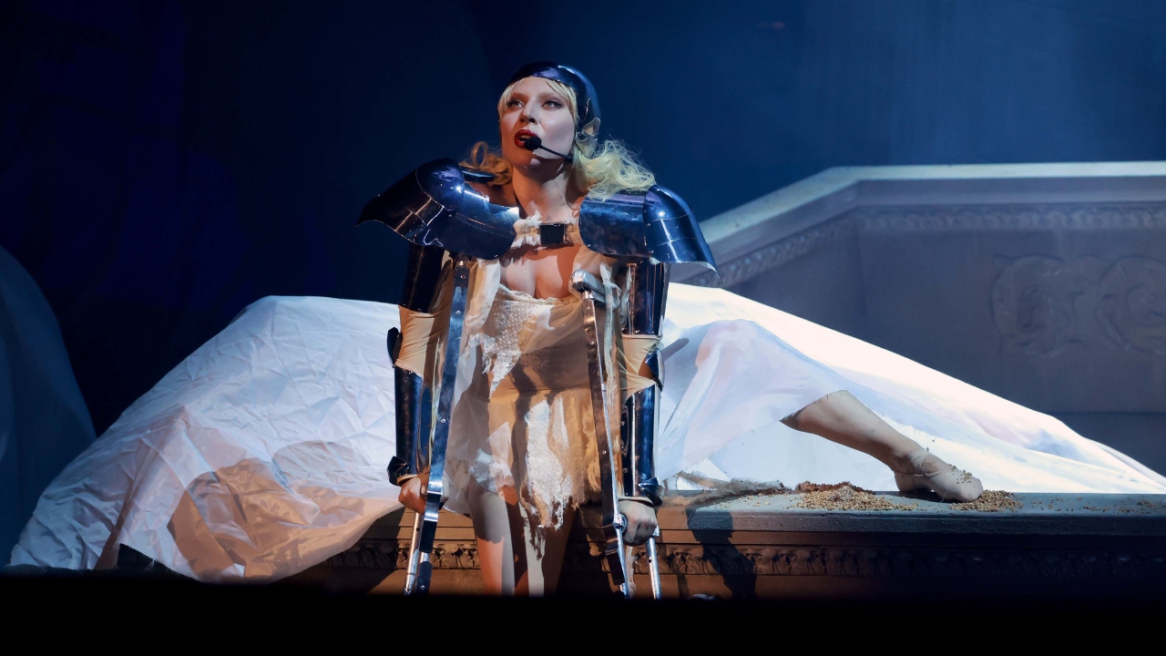 Một trong những khoảnh khắc khiến người hâm mộ vỡ oà là sân khấu Paparazzi – lần hiếm hoi Gaga biểu diễn lại bản hit huyền thoại. Chiếc mũ bảo hiểm, tay áo giáp kim loại và chiếc nạng là sự tri ân chính mình, gợi nhắc bộ giáp sắt của Thierry Mugler trong MV năm nào. Bên dưới lớp giáp là chiếc váy trắng bay bổng, tái hiện vẻ đẹp siêu thực từ sàn diễn Scanners Thu/Đông 2003 của Alexander McQueen.