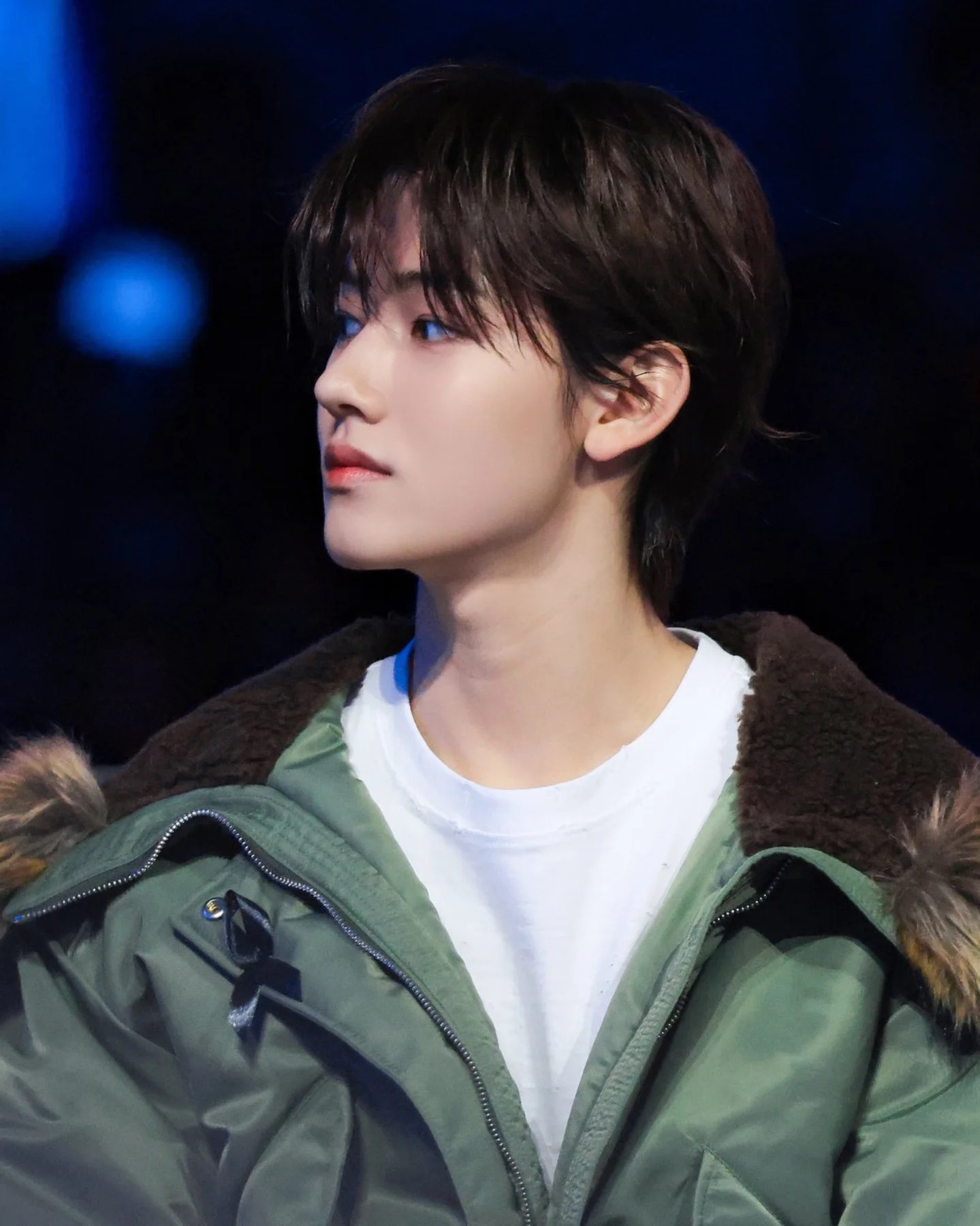 Seonghyeon tạo điểm nhấn cho outfit khi kết hợp áo boomber xanh lá phối mũ lông, quần jeans loang và giày boots mũi cong độc đáo. Bộ trang phục được cố định bằng chiếc sơ mi flannel caro buộc ngang hông, không hề “lạc quẻ” mà lại rất matching.