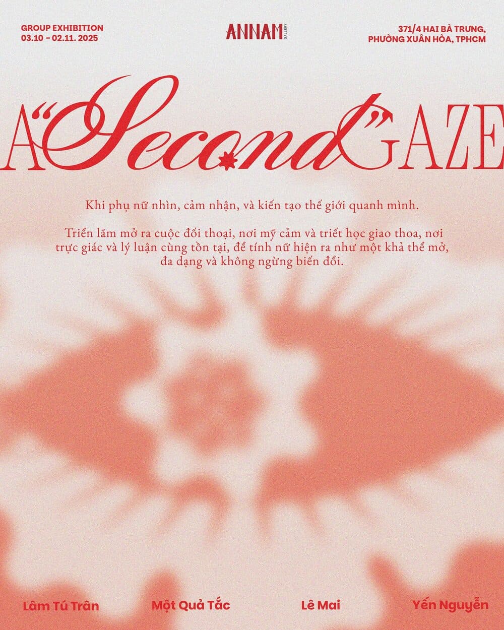 Annam Gallery giới thiệu triển lãm nhóm “A Second Gaze”, quy tụ bốn nữ nghệ sĩ trẻ gồm Lâm Tú Trân, Lê Mai, Một Quả Tắc và Yến Nguyễn. Triển lãm mở ra cuộc đối thoại giữa các nghệ sĩ về cách phụ nữ nhìn, cảm nhận và kiến tạo thế giới xung quanh. Thông qua các tác phẩm, “A Second Gaze” được hình thành như thử nghiệm mang tính triết học - mỹ học, nơi nghệ sĩ và người xem cùng tham gia vào vòng đối thoại, suy ngẫm về tính chủ thể - vật thể và nhãn quan của nữ giới.
