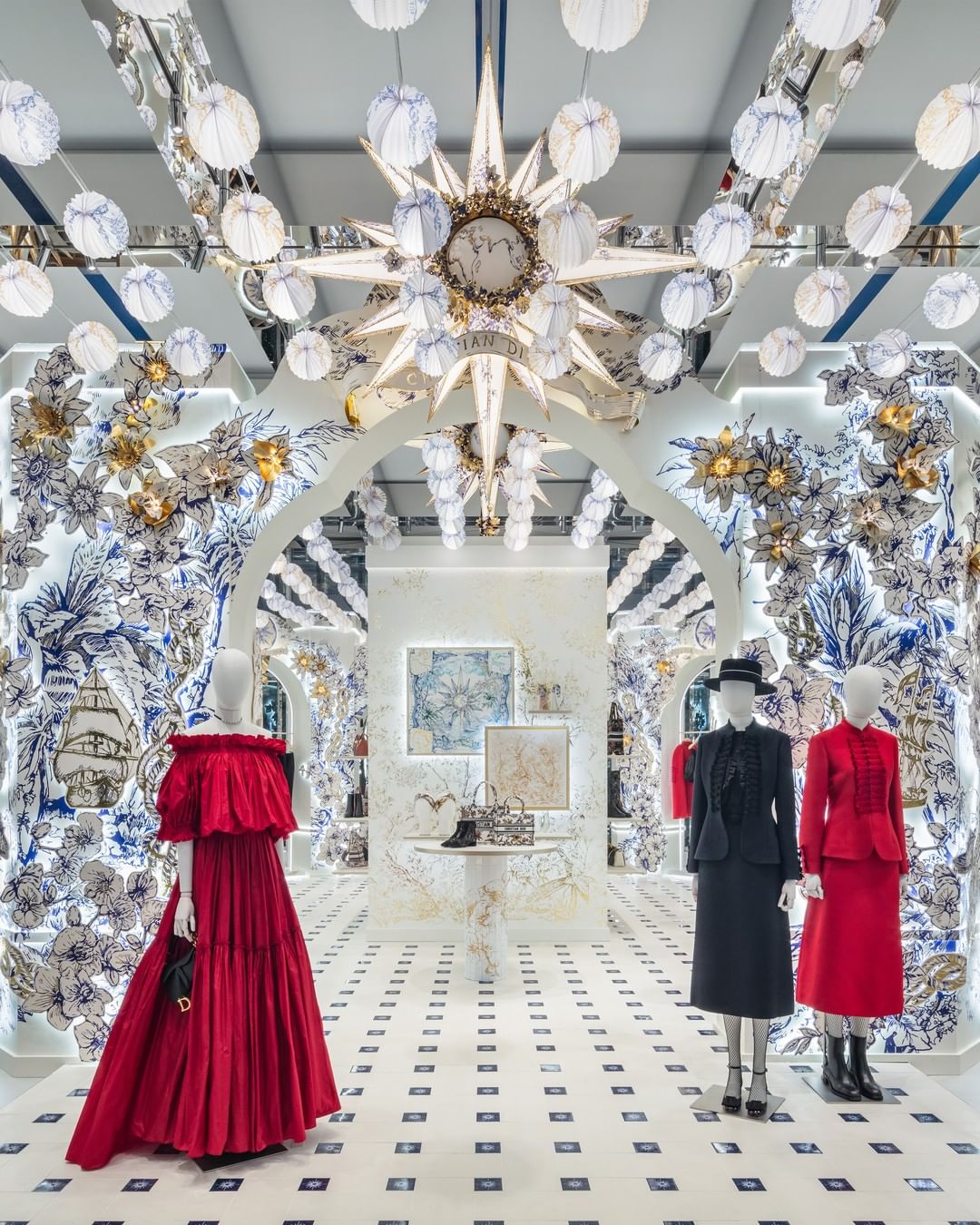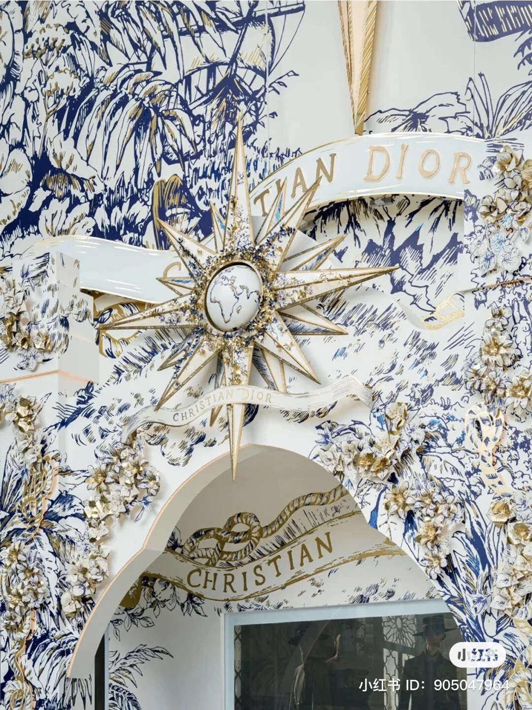Quý tộc và quyền lực là những tính từ có thể miêu tả về phong cách trang trí của Dior dịp giáng sinh này. Tại Thành Đô - Trung Quốc, store Flagship của nhà mốt khoác lên mình hai tone màu trang nhã trắng - xanh dương với những hoa văn đầy tỉ mỉ, toát lên sự quý tộc của thương hiệu đến từ nước Pháp. Điểm nhấn là biểu tượng Mặt trời với những tia sáng xung quanh, được trang trí khắp các con phố và tên thương hiệu Dior nổi bật ở giữa. Diện mạo lung linh của Dior không khỏi khiến mọi người choáng ngợp và phải thốt lên “Quả nhiên là Dior!”.