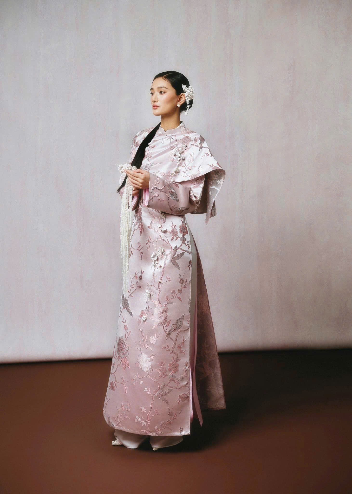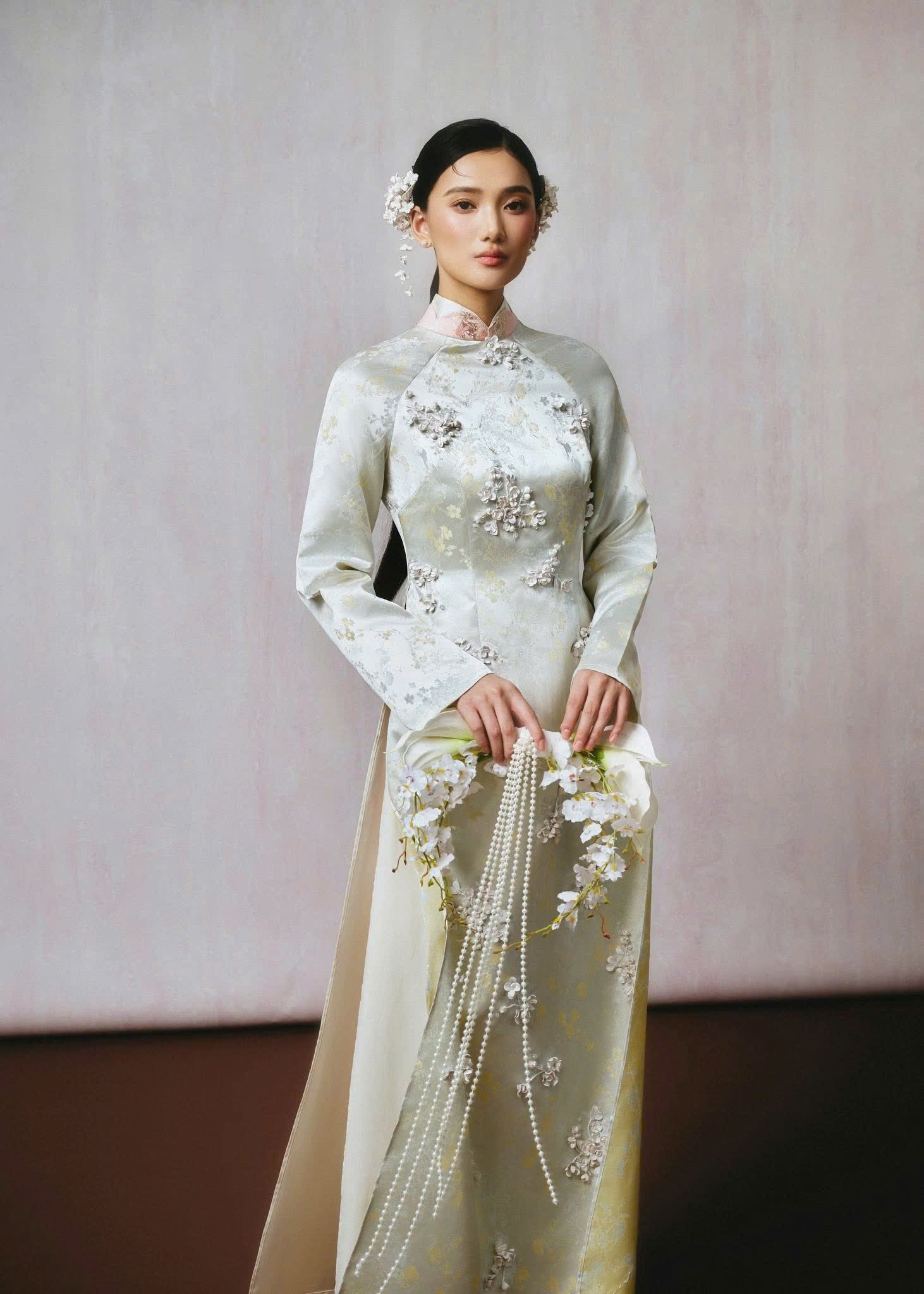 BST gồm nhiều thiết kế trải dài những gam màu đặc trưng của tranh lụa và mỹ thuật Đông Dương từ sắc hồng phấn, xanh lam, vàng champagne đến trắng ngọc và xanh lục non. Phom dáng áo dài được giữ nguyên sự kín đáo truyền thống: cổ cao, tay dài, thân áo suông thẳng, kết hợp với quần lụa mềm tạo nhịp rũ thanh thoát. Bên cạnh đó, một số mẫu được biến tấu tinh tế với cổ áo cài nơ lụa hoặc đính hoa đá 3D, mang lại hiệu ứng thị giác hiện đại nhưng không phá vỡ tinh thần cổ điển.
