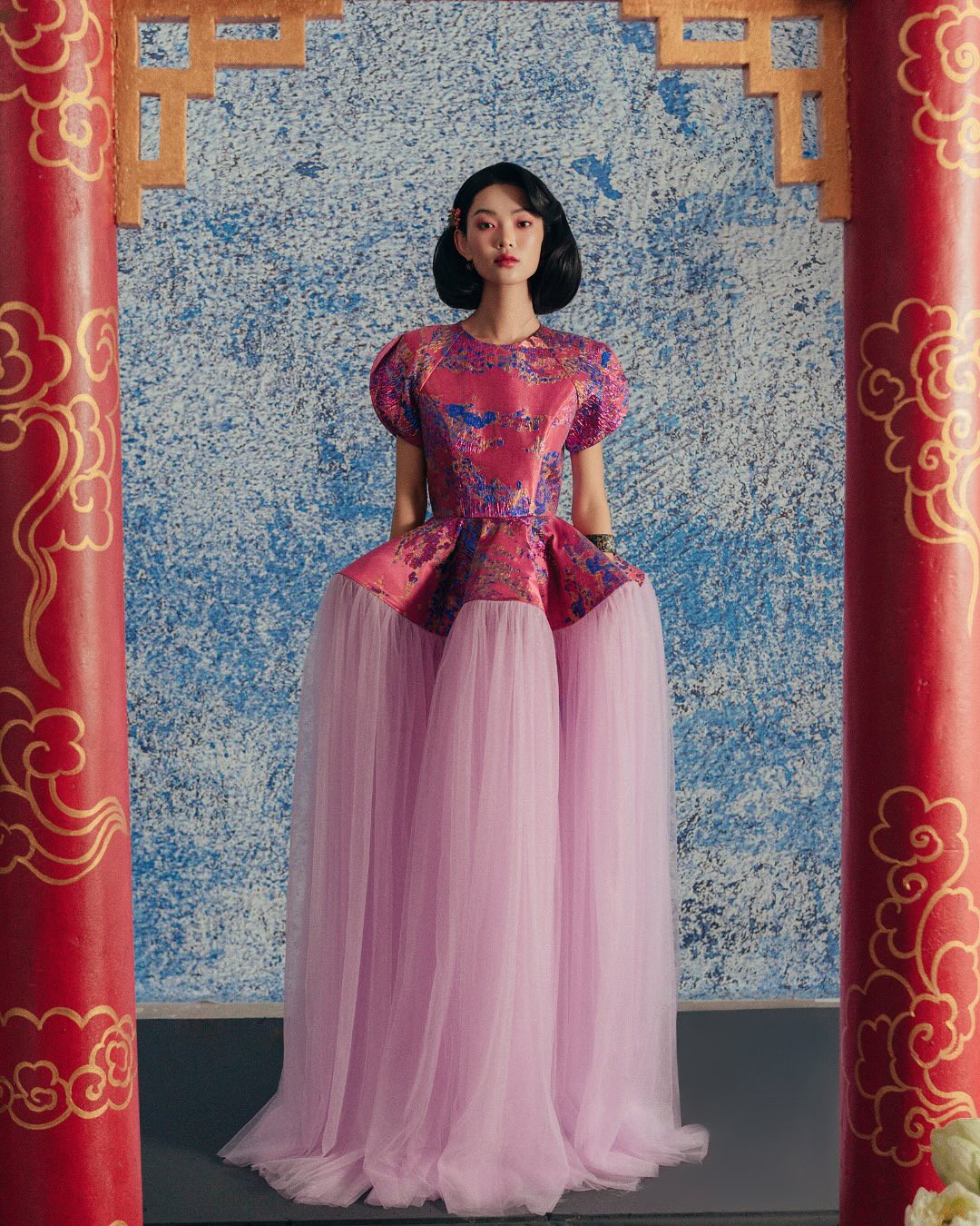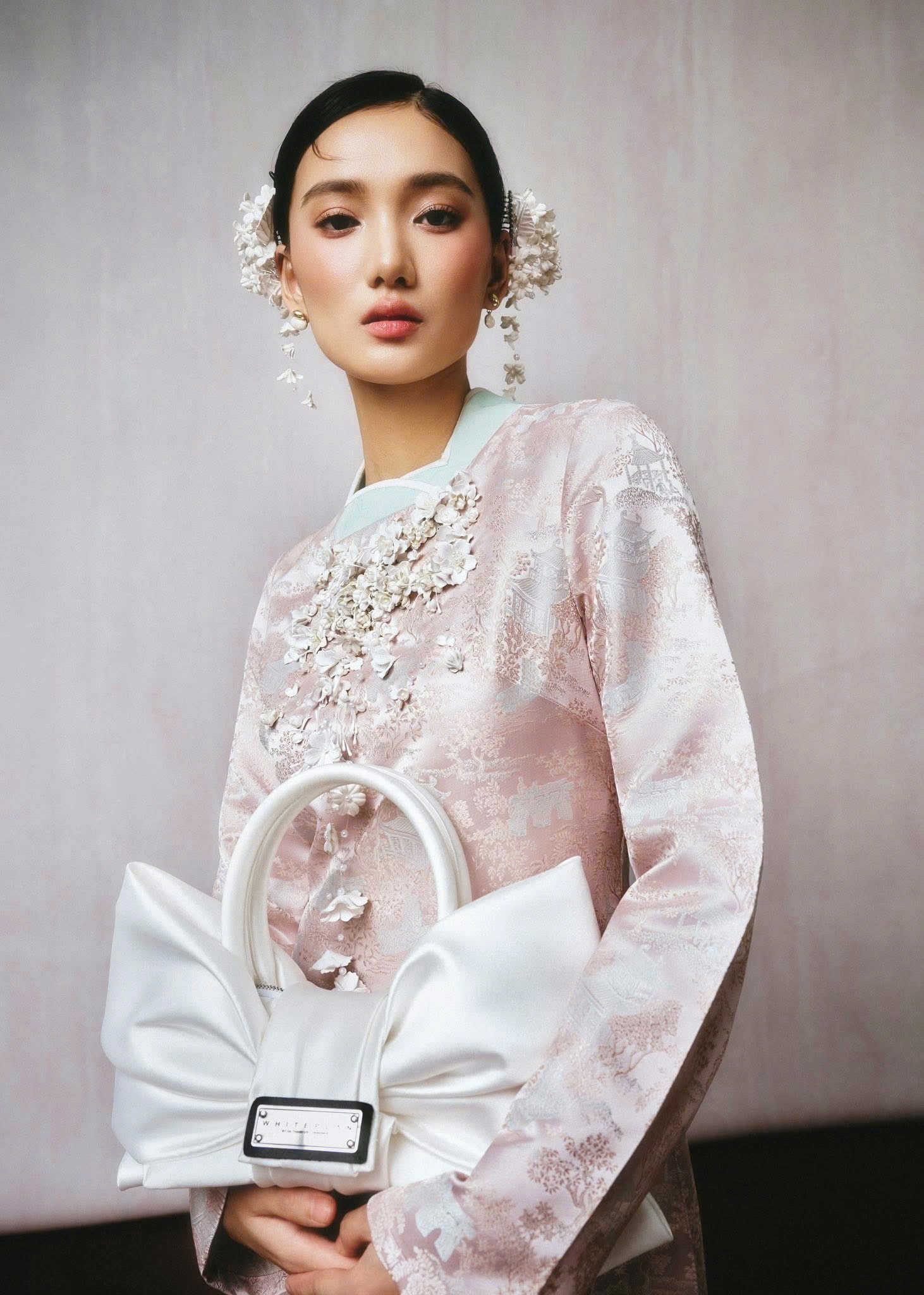 Với chất liệu chủ đạo gồm gấm, lụa, satin, jacquard và nhung cao cấp, BST khai thác hiệu ứng bề mặt một cách tinh tế: độ bóng nhẹ, họa tiết tròn cổ điển, đường dệt nổi mềm… tất cả cùng hòa vào bảng màu phong phú từ trắng ngà, hồng phấn, tím oải hương đến xanh cốm, vàng mật ong và đỏ son. Mỗi gam màu gợi một sắc thái cảm xúc: nhẹ nhàng, nữ tính, sang trọng hoặc đậm chất Á Đông.