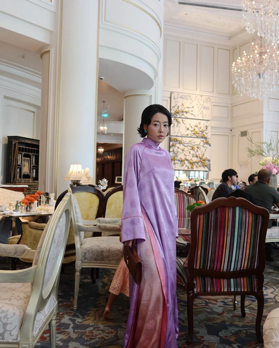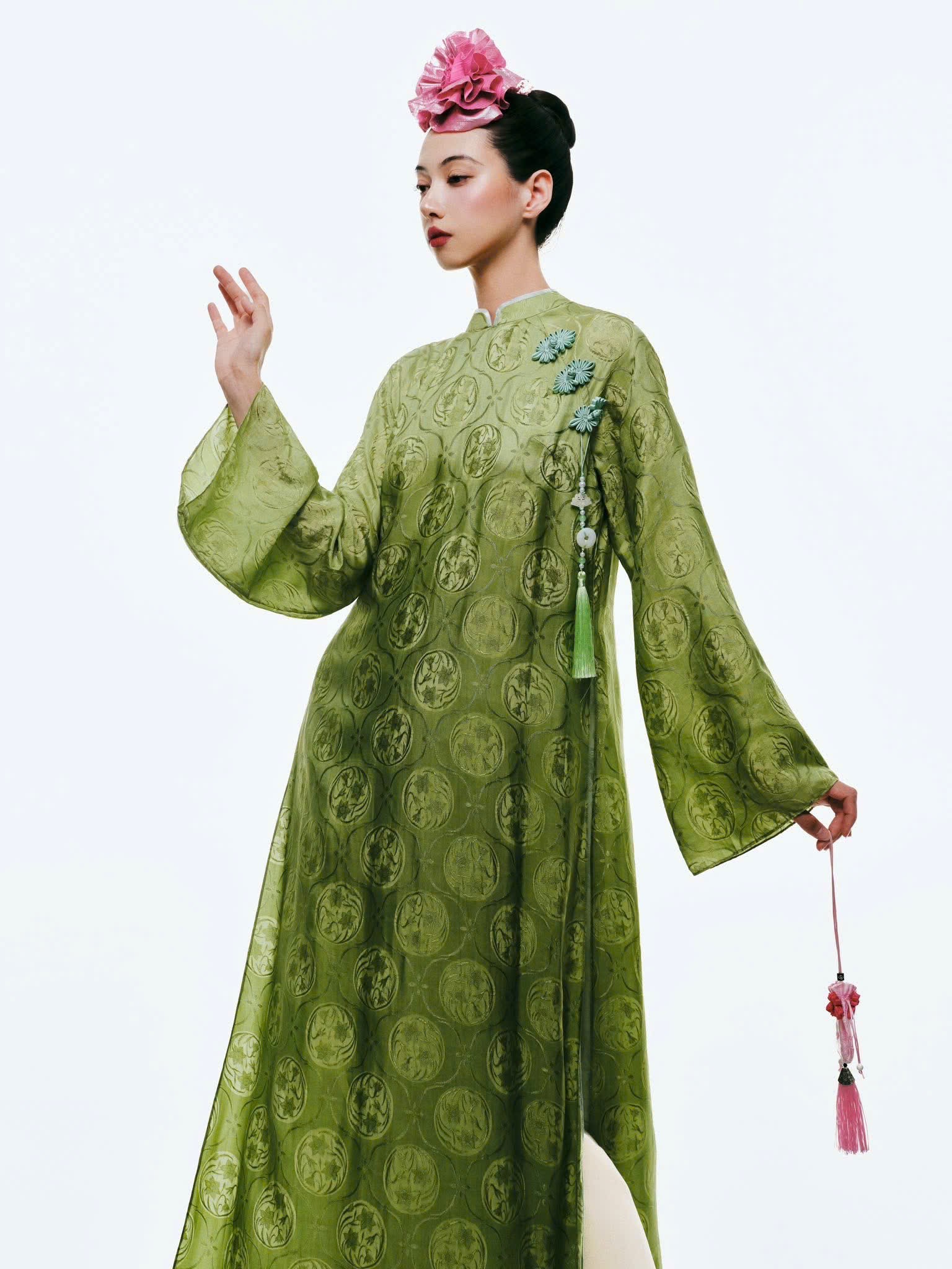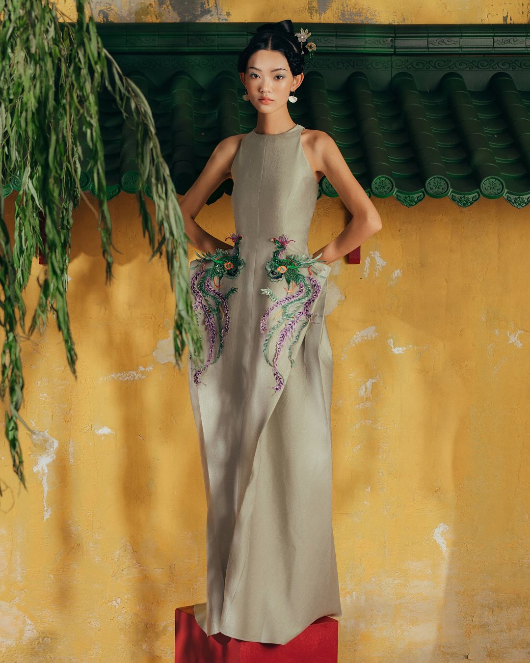 Phom dáng được giữ nguyên cấu trúc truyền thống với cổ cao, tay rộng, tà suông thẳng, nhưng được tinh chỉnh để phù hợp bối cảnh đương đại. Khi khoác lên mình, tà áo tạo cảm giác vừa kín đáo vừa mềm mại, vừa truyền thống lại vẫn hiện đại, nhờ cách xử lý độ rũ tinh tế và tỉ lệ layer được tính toán kỹ lưỡng. Một số thiết kế nổi bật sử dụng chất liệu nhung ôm nhẹ, tôn đường cong mà không phô diễn; hay áo dài gấm phối quần satin tương phản, tạo chiều sâu thị giác. Sự tiết chế trong chi tiết trang trí giúp chất liệu và dáng áo tự kể câu chuyện của mình: lặng thầm nhưng đầy sức gợi.