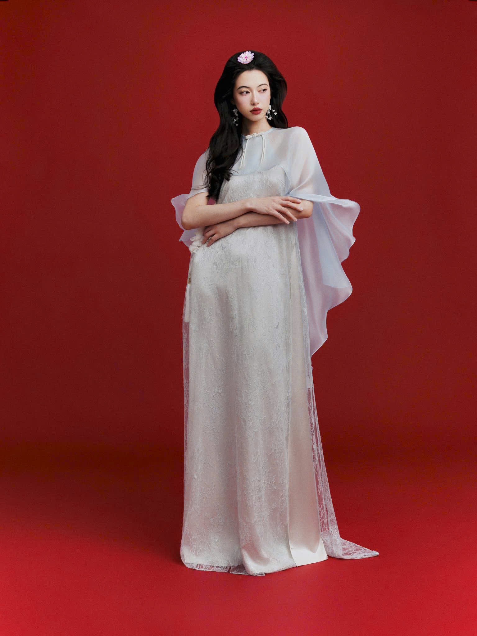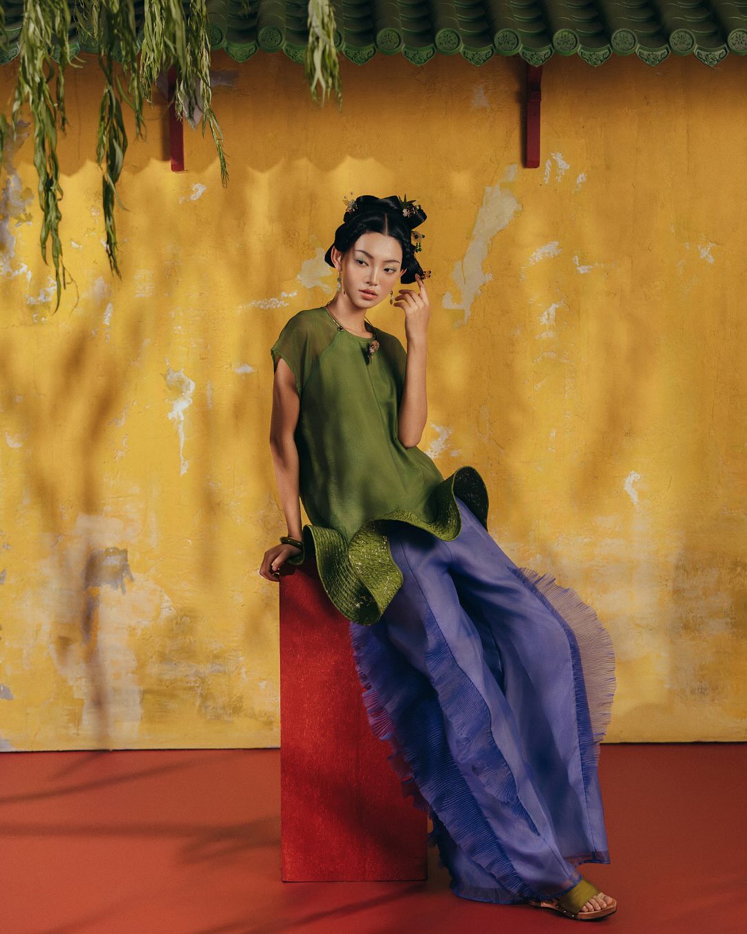 Mỗi thiết kế trong BST như một lát cắt của Huế từ màu nước rêu phủ mặt đình, sắc xanh hồ sen, tím ngọc phượng, đến vàng cổ kính của những bức tường nhuốm thời gian. Những hình ảnh ấy không được mô tả bằng ngôn từ, mà bằng chuyển động của chất liệu: ren, tơ, gấm, organza, jacquard… mỗi lớp vải như một lớp ký ức dần được hé lộ.