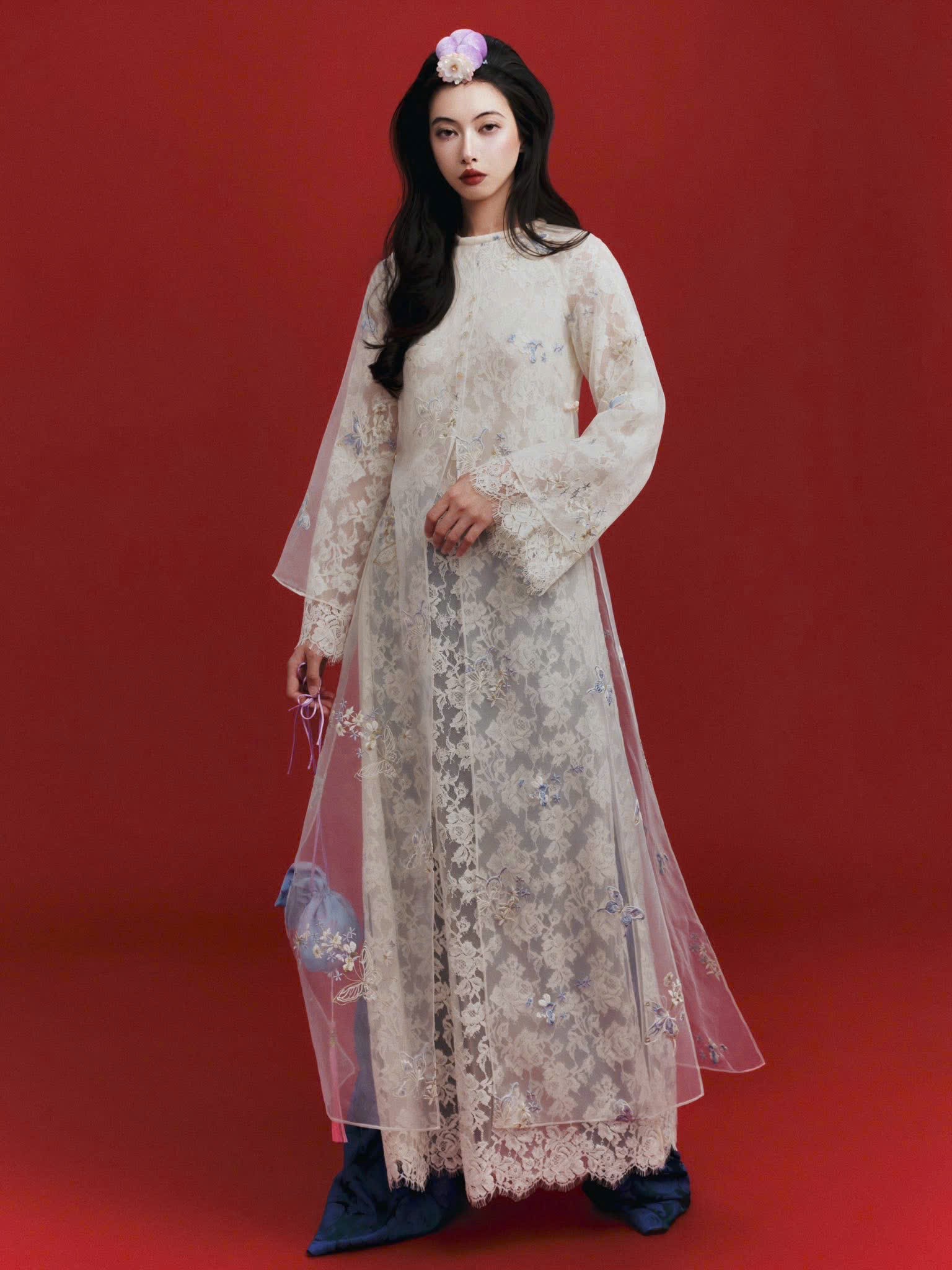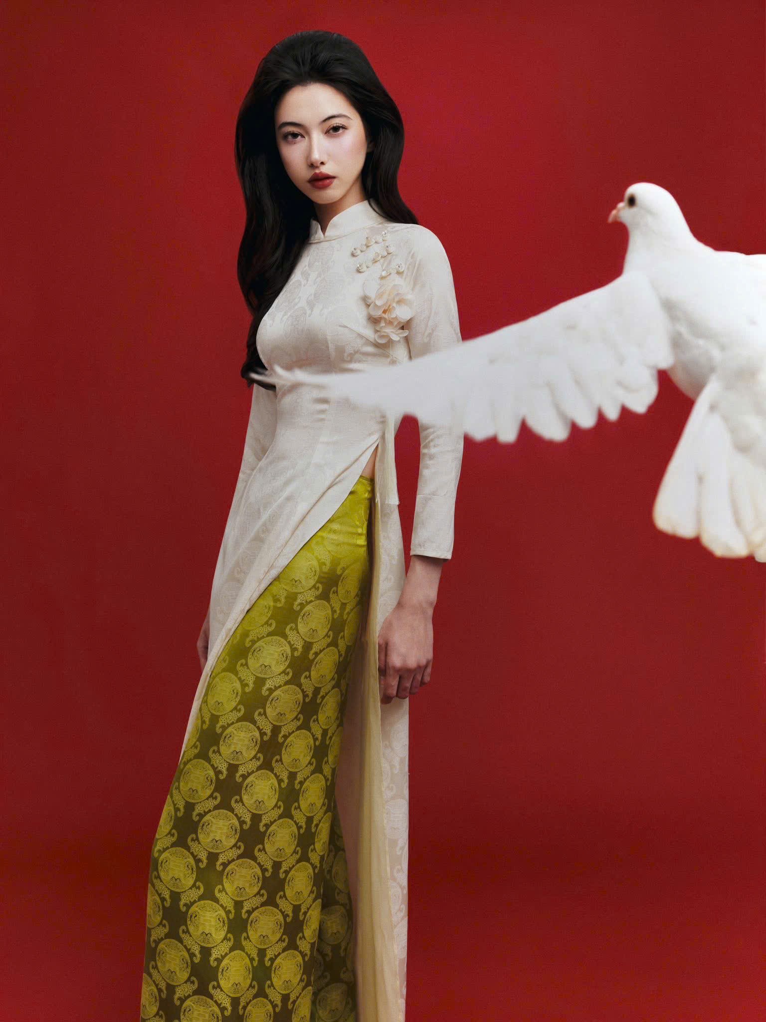 An Vân mở đầu bộ sưu tập bằng sắc lụa voan trong trẻo, gợi hơi sương buổi sớm. Uyển Dung tiếp nối với gam hồng dịu, thể hiện nét nữ tính hiện đại cùng sức mạnh mềm của sự tĩnh tại. Ở trung tâm BST là Ánh Liên, mẫu áo dài ren thêu hoa khẽ nở trong ánh sáng, mang đến vẻ thanh thuần nhưng giàu chiều sâu. Khi Diên Hoa khai thác gấm thêu và sắc đỏ trầm cho hình ảnh người phụ nữ trưởng thành, sâu lắng và đầy bản lĩnh; Tự Do Tĩnh Lặng biểu đạt sự giải phóng nhẹ nhàng sau khi tìm thấy sự yên bình từ bên trong với thiết kế kem tinh khôi kết hợp cấu trúc hiện đại.