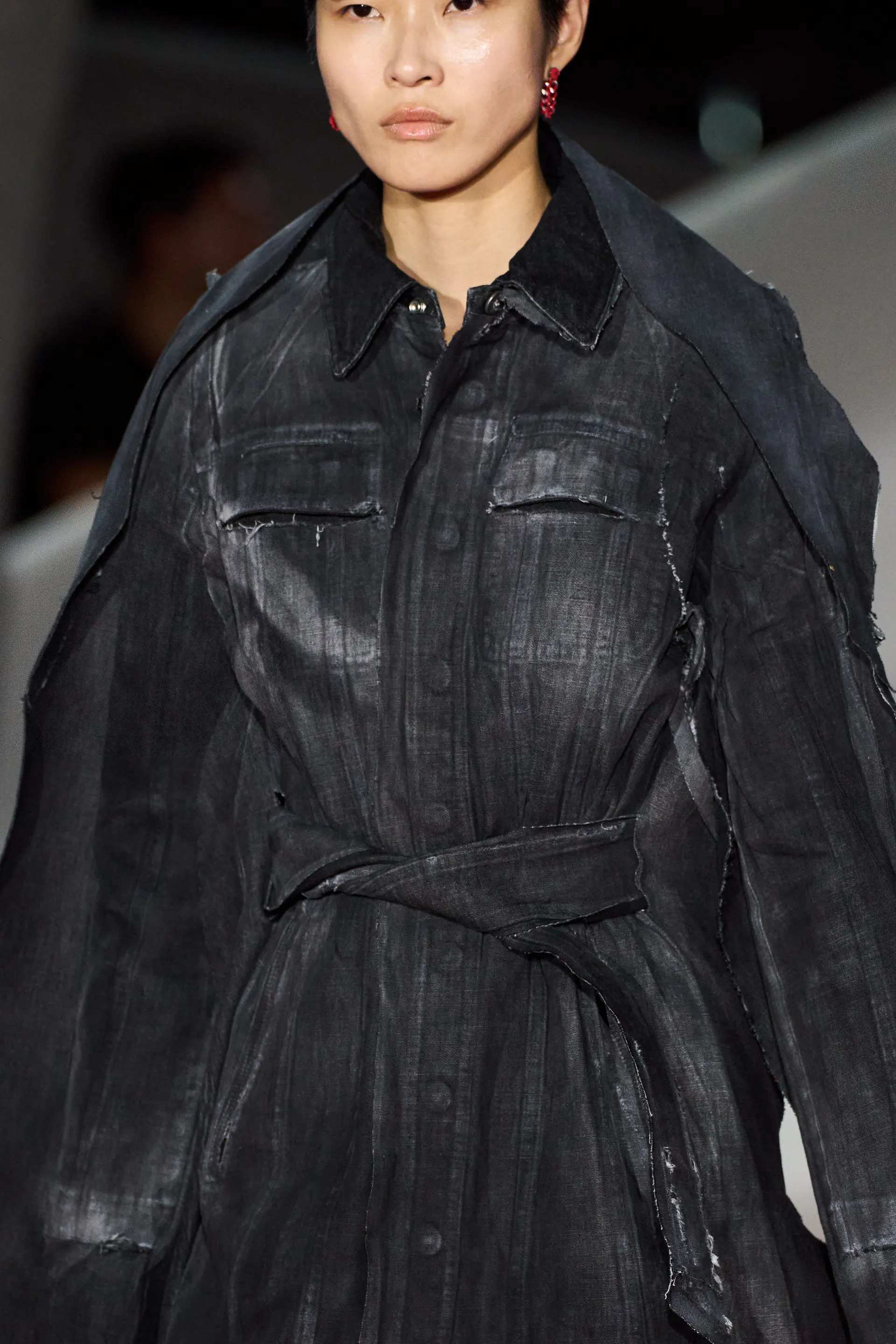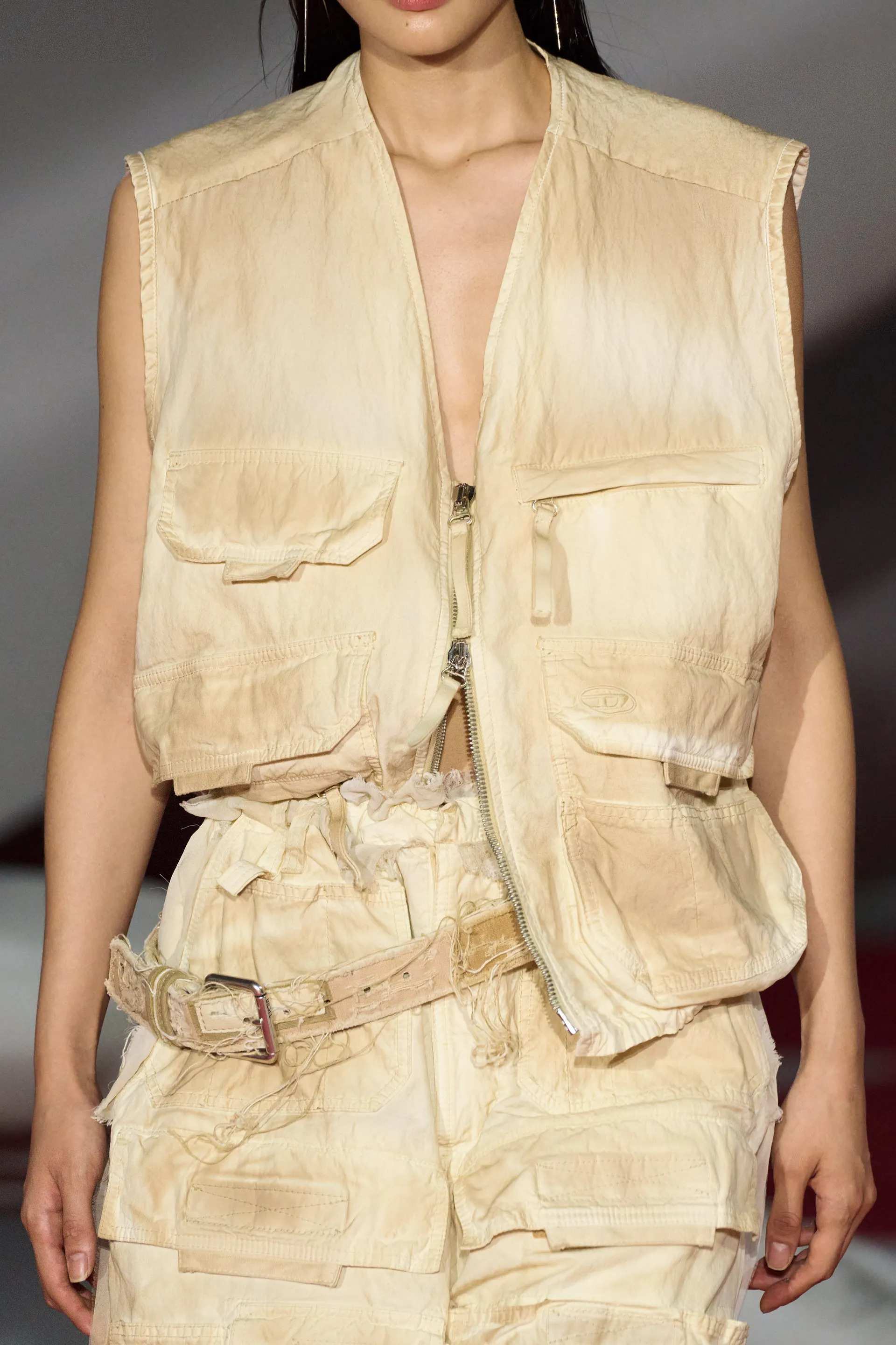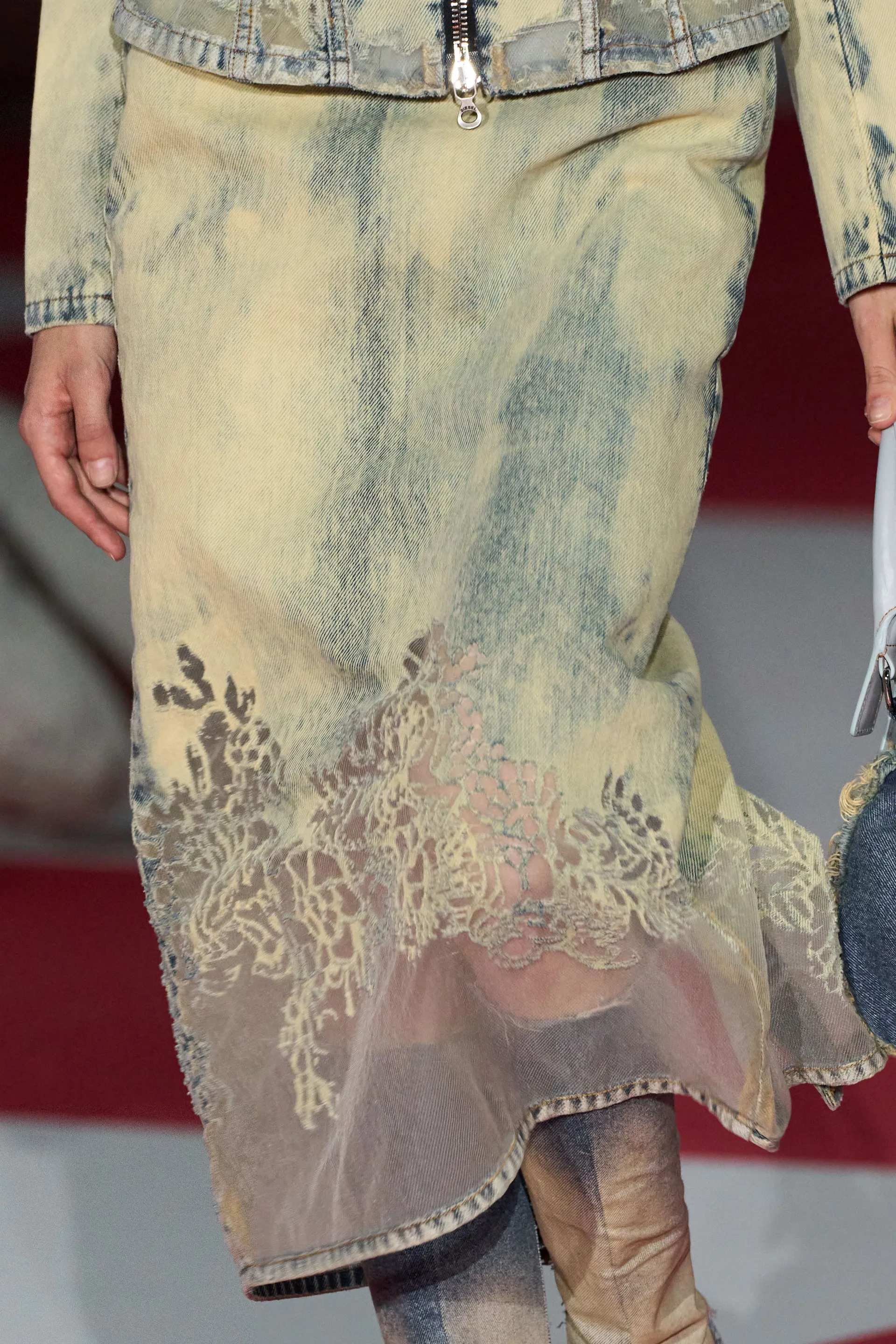 Ở đâu đó trên sàn diễn, giới mộ điệu còn có thể thấy denim được xếp chồng chất lên nhau trong lớp vải tuyn, có khi lại được đan xen với ren và organza, biến hóa thành những những mảnh vải trên áo corset hay được thêu thành những chi tiết vintage. Denim ở Diesel chưa bao giờ “tầm thường”, kỹ thuật xử lý denim ở sàn diễn Spring 2023 cũng được Martens nâng lên một tầm cao mới: tẩy màu, nhuộm nhiều màu, có áo sơ mi denim cũng có denim dệt kim, denim được xé tua rua và denim tua rua và chiếc logo của thương hiệu nay cũng được đúc ngay trên lớp nim hoàn hảo, không giới hạn vị trí.