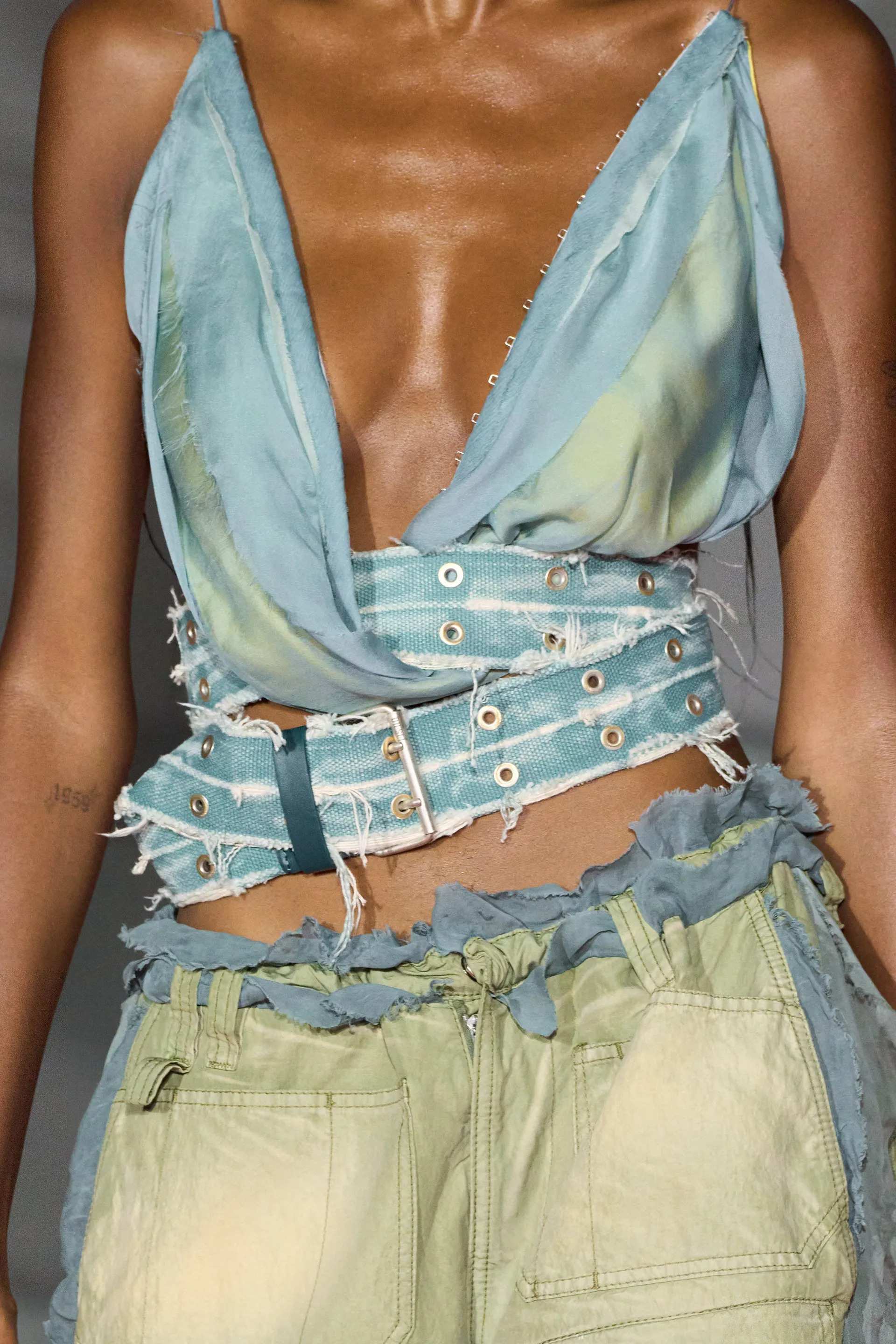 Là một nhà mốt nổi tiếng với khả năng biến hóa denim không ai có thể thay thế, đương nhiên Diesel Spring 2023 được bắt đầu với hàng loại mảnh ghép denim cùng muôn hình vạn trạng. Nhịp điệu dồn dập cùng những bước chân nặng nề của người mẫu, người xem bắt đầu hồi hộp và vô cùng tò mò không biết Martens sẽ làm gì tiếp theo với denim. Diesel chiêu đãi giới mộ điệu với một chiếc “menu” với đa dạng “món ăn” về denim. Mỗi “món” đều khác biệt từ phom dáng, kết cấu đến màu sắc; từ bra tops, bomber jacket, áo vest quá khổ, quần jean cắt xẻ, váy maxi xẻ tà, quần denim rách rưới, trench coat rộng thùng thình, corset chuẩn chỉnh, túi xách, giày cao gót, boots đùi, đến chiếc áo được quấn quanh bởi những chiếc thắt lưng denim. “Tôi cảm thấy rằng denim là một chất liệu rất dân chủ,” Martens nhận định “Bạn có thể mang nó với một đôi giày cao gót, bạn có thể đi diện đồ denim đi uống cocktail, hay bất kỳ đâu.”