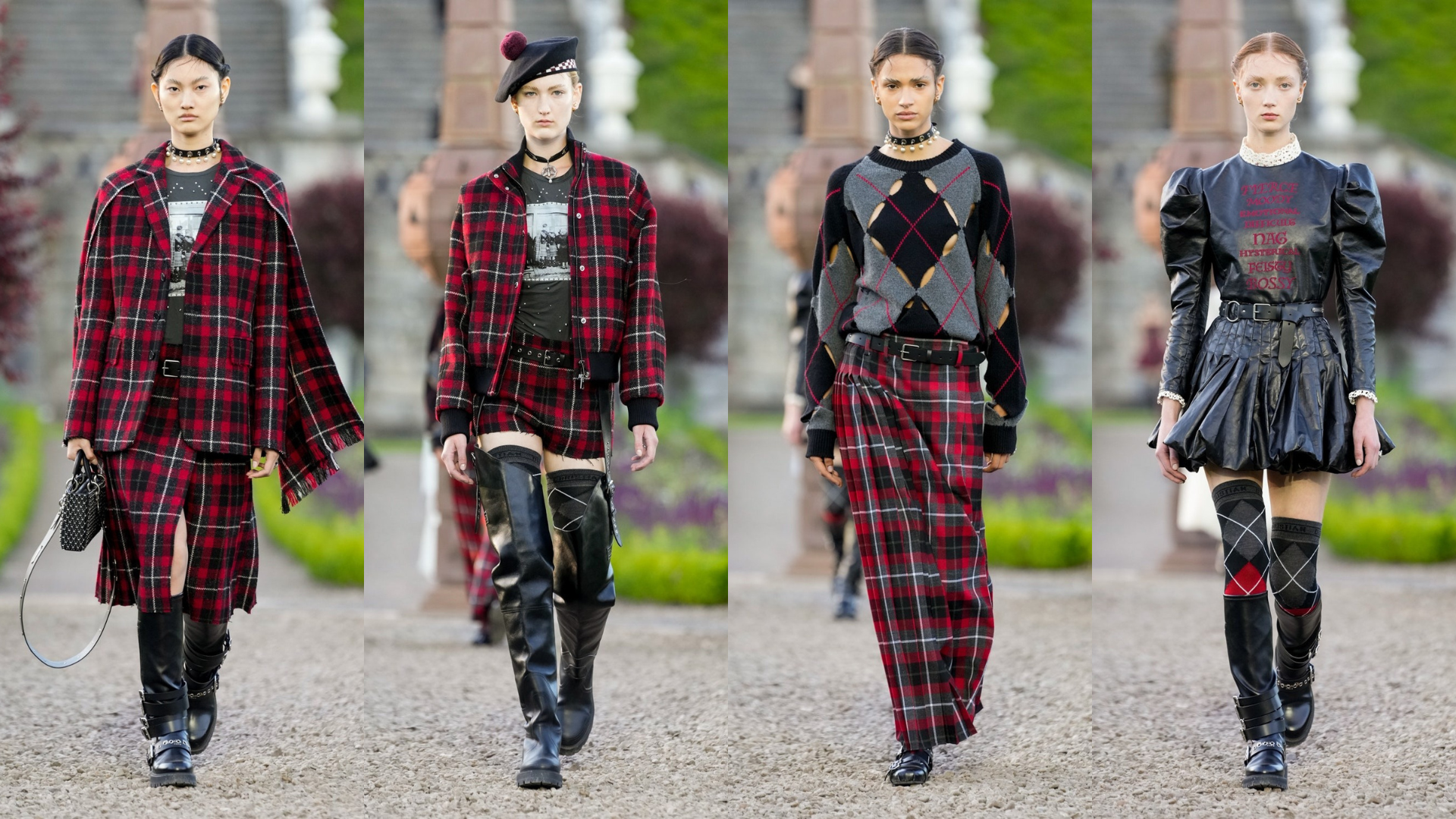 Cuộc gặp gỡ của hàng loạt chất liệu truyền thống này vốn dễ dàng trở nên lộn xộn; nhưng với tay nghề khéo léo và sự cầu toàn đến từng chi tiết nhỏ của nhà mốt, chúng đã được sắp đặt và nổi bật một cách tinh tế hơn bao giờ hết. Maria để chúng tỏa sáng như một “nhân vật chính” xuyên suốt nửa đầu show diễn Dior Cruise 2025. Trang phục truyền thống của Scotland trong lăng kính sáng tạo của Maria tại Dior Cruise 2025 được tạo kiểu với những chiếc vòng cổ ngọc trai, những chiếc túi đeo chéo bằng da có đính đá và chần bông, thắt lưng có kèm túi tiện dụng, mũ nồi, mạng che mặt và tất nhiên, tất dài đến đầu gối, và thậm chí cả những đôi bốt kiểu Wellington, trông rất phong phú với những gợi ý liên quan đến lịch sử lâu đời của đất nước được nâng tầm bởi tay nghề trứ danh của nhà mốt Pháp. Chưa kể đến những chi tiết mang phong cách Tudor như váy crinoline, áo tay côn phồng, diềm xếp nếp hiện đại, vạt áo kiểu Lamellar và vô số bản phối mang đậm thanh âm nổi loạn, điên cuồng của Punk.