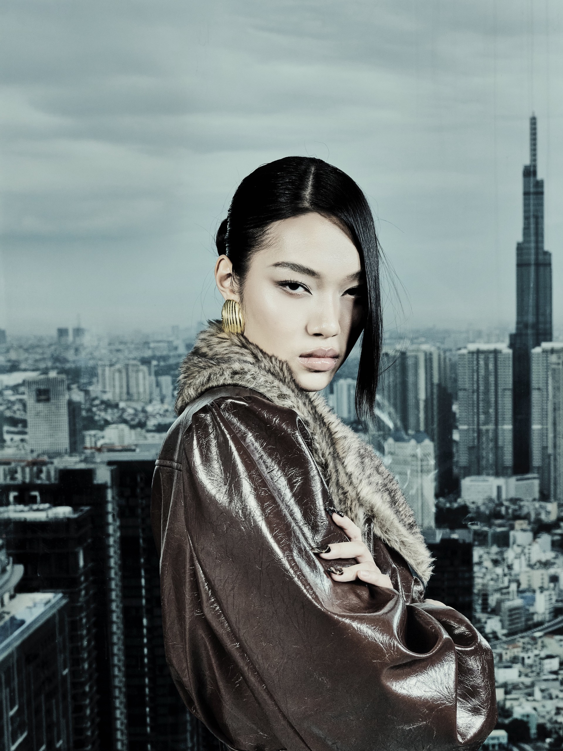 Trong bộ ảnh thứ hai, Huỳnh Tú Anh và Lại Mai Hoa diện các thiết kế da nâu bóng kết hợp cổ lông trắng, tạo đối lập ấn tượng, tập trung phom tay phồng, thắt lưng bản rộng siết eo, mang vẻ hoang dã, hiện đại và quyền lực. Minh Tú hóa thân thành nữ hoàng sa mạc tương lai với áo choàng layering phủ lên bra ren và chân váy corset, chất liệu nhung nâu đất kết hợp ren loang gợi hình ảnh cát gió chuyển động. Võ Hoàng Yến xuất hiện quyền lực và sang trọng trong croptop dây đan kết hợp chân váy dài da, ren được đắp dọc tay áo, eo và hông, tạo điểm nhấn mềm mại đối lập với chất liệu da.