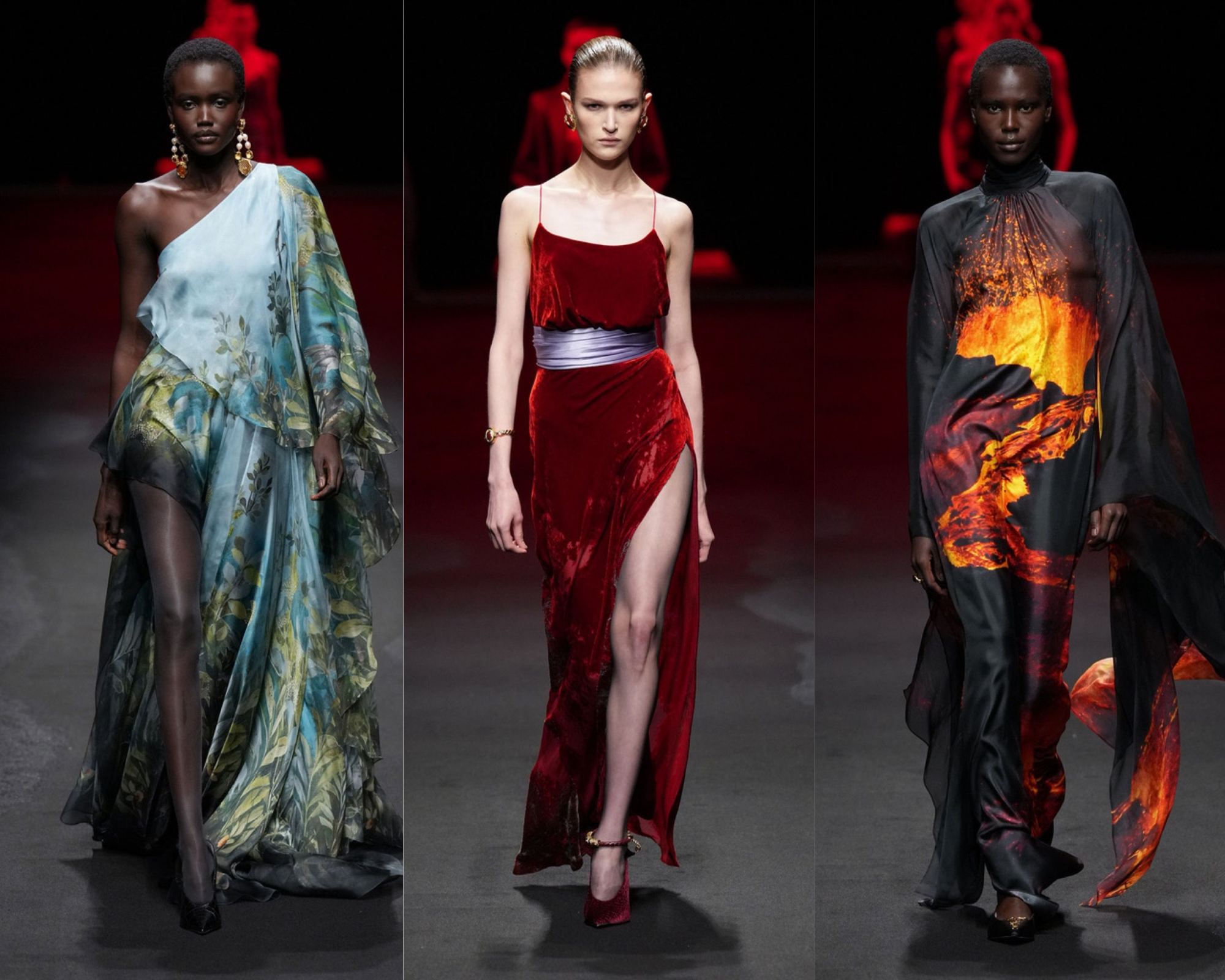 Trong một sắc thái khác, Roberto Cavalli của Fausto Puglisi như viết nên những bản tình ca cổ đại. Lấy cảm hứng từ Pompeii – thành phố bị chôn vùi nhưng chưa từng lụi tàn trong trí tưởng tượng nghệ thuật - những lớp drape hiện lên như lớp bụi thời gian, phủ mờ nhưng không làm nhòa ký ức. Váy lụa màu cát, nhung đỏ Pompeian gợi nhớ đến trang phục của các quý bà La Mã, nhưng được tái hiện với góc nhìn đương đại, mọi thứ tựa như vệt dư quang của một đế chế - hùng vĩ mà mong manh, kiêu hãnh mà đầy hoài niệm.