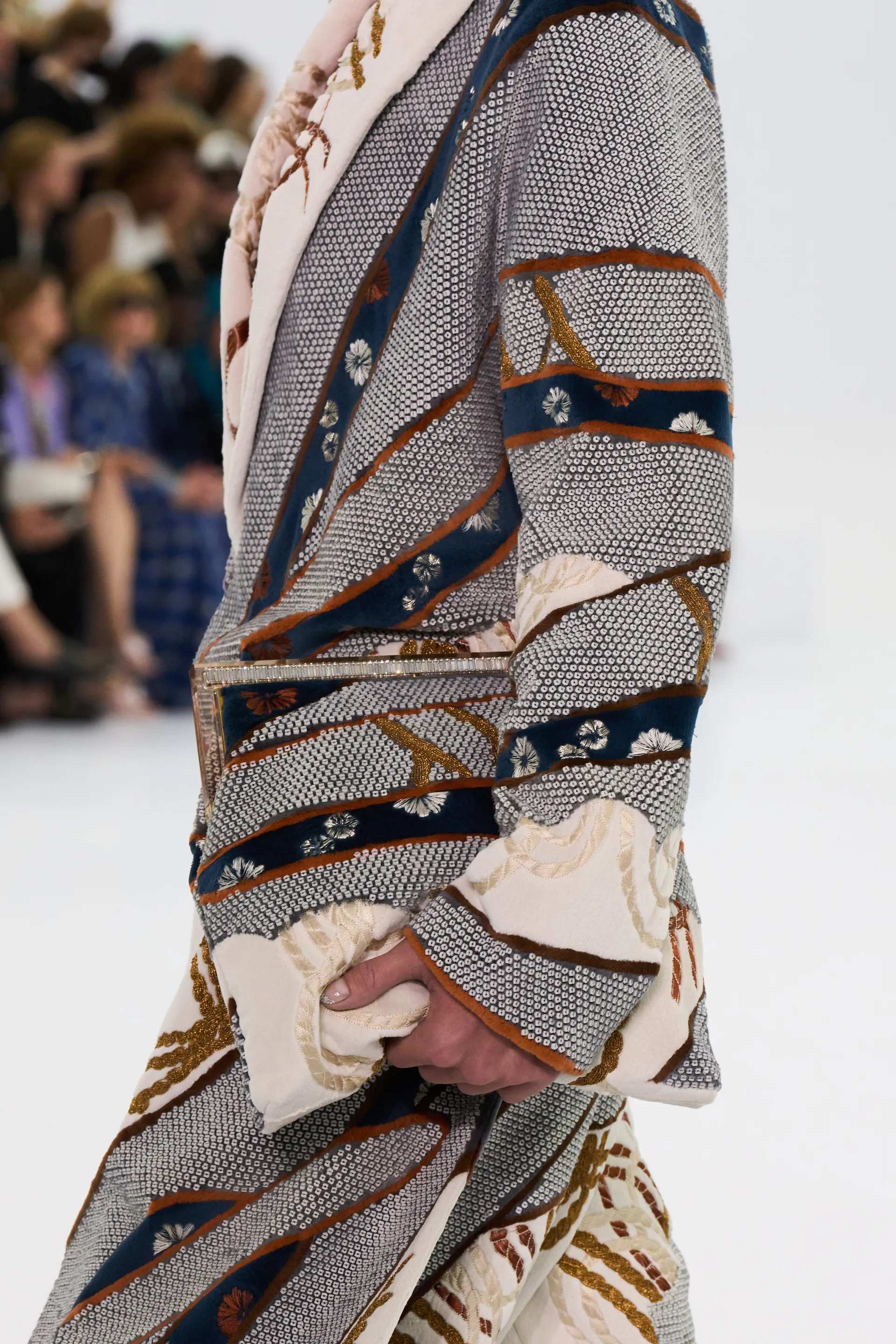 Là một người nghệ sĩ có một tình yêu đặc biệt với xứ sở hoa anh đào Nhật Bản, Kim Jones tiếp tục câu chuyện với chuyến đáp máy bay đến Kyoto, đặt chân đến một nhà sản xuất lụa chuyên làm kimono, loại chất liệu mà anh cũng đã nhập khẩu nhiều lần trong nhiều năm để phục vụ cho các bộ sưu tập menswear tại Louis Vuitton và Dior. Nhờ những khung dệt hẹp và kỹ thuật in thủ công tỉ mỉ của nhà cung cấp vải này, Jones đã chắp vá những bản in mùa thu đẹp tuyệt hảo thành những chiếc váy dạ hội kín đáo. Đồng thời, diễn giải tay nghề thủ công đạt chuẩn “Couture” bằng các họa tiết hoa lá được thêu kỳ công và vô cùng phức tạp, hay ở những đường viền lông thú hoặc những phiên bản trừu tượng được thể hiện qua những sợi sequins được cuộn lại, ở cả những đường lông được bắt trên những chiếc áo sơ mi vải tuyn và những bộ suit bất đối xứng