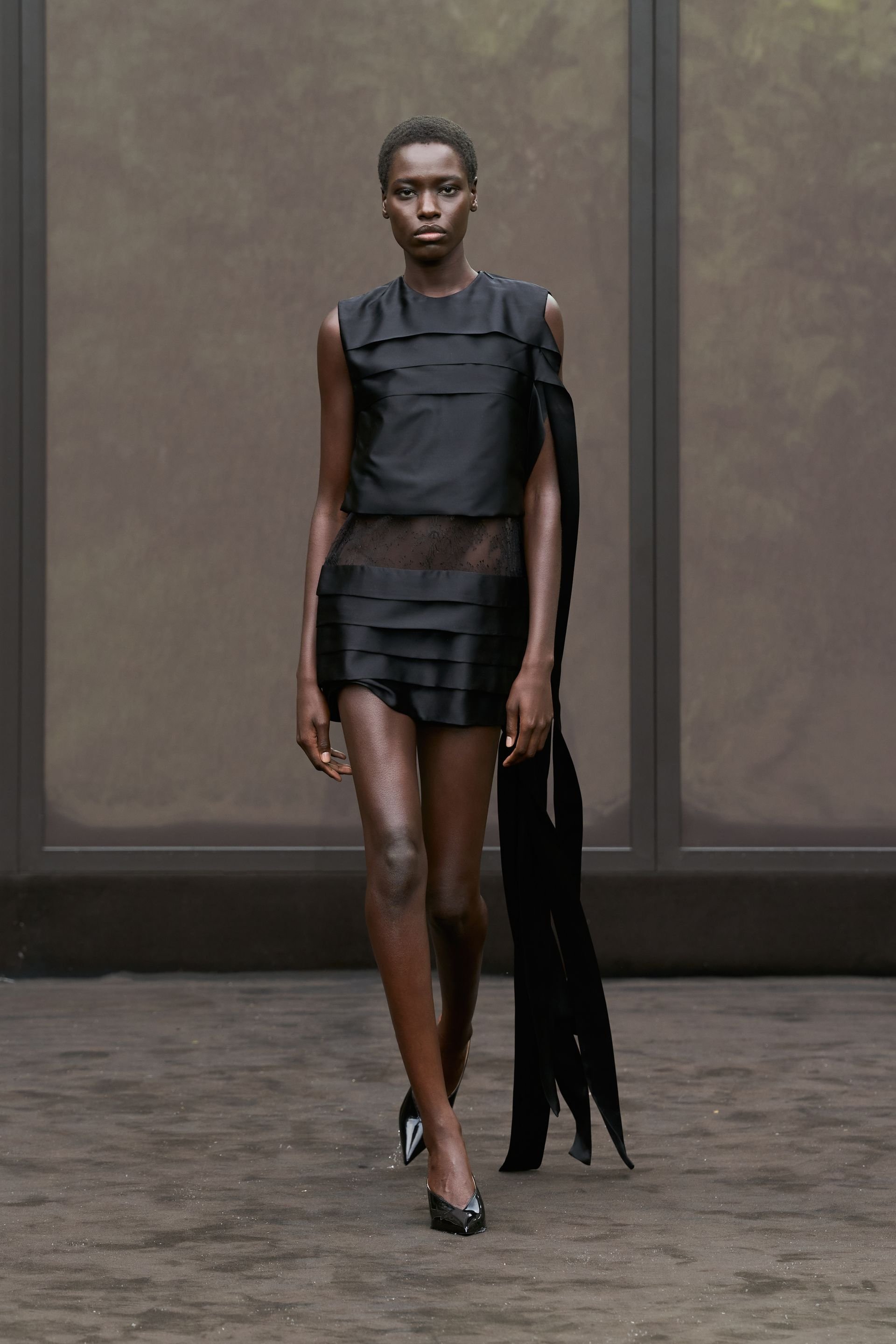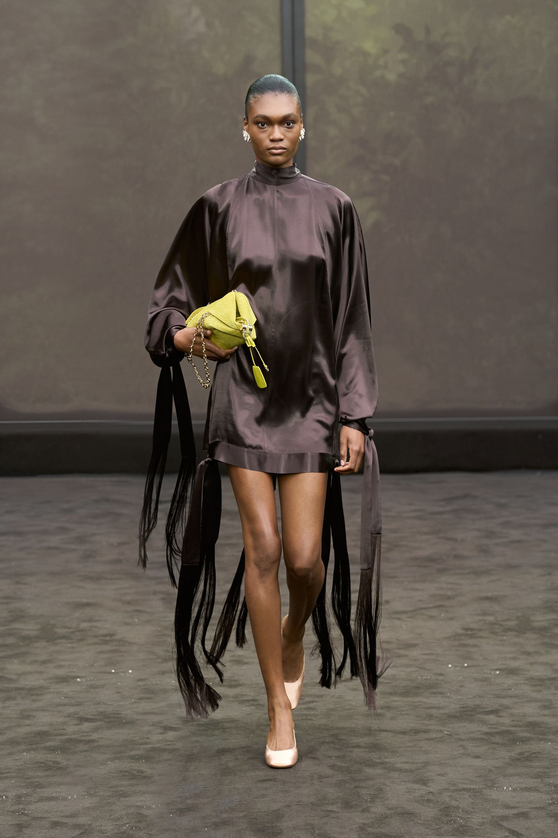 Nguồn cảm hứng ấy được Davis phác họa bằng nét bút tinh tế, thể hiện qua voan mỏng và những bề mặt vải óng ánh mềm rủ. Fringe, chi tiết tua rua - biểu tượng mang theo một phần bản sắc của cả thập kỷ xuất hiện bất ngờ ở những vị trí lạ như hai bên sườn hay cổ tay, mang lại cảm giác mới mẻ và tinh nghịch. Đan xen là những điểm nhấn khác biệt: bộ suit váy và váy polo bằng da bóng đen, gợi nhớ Ferragamo năm 1998, với khóa xoay Gancini làm điểm nhấn.