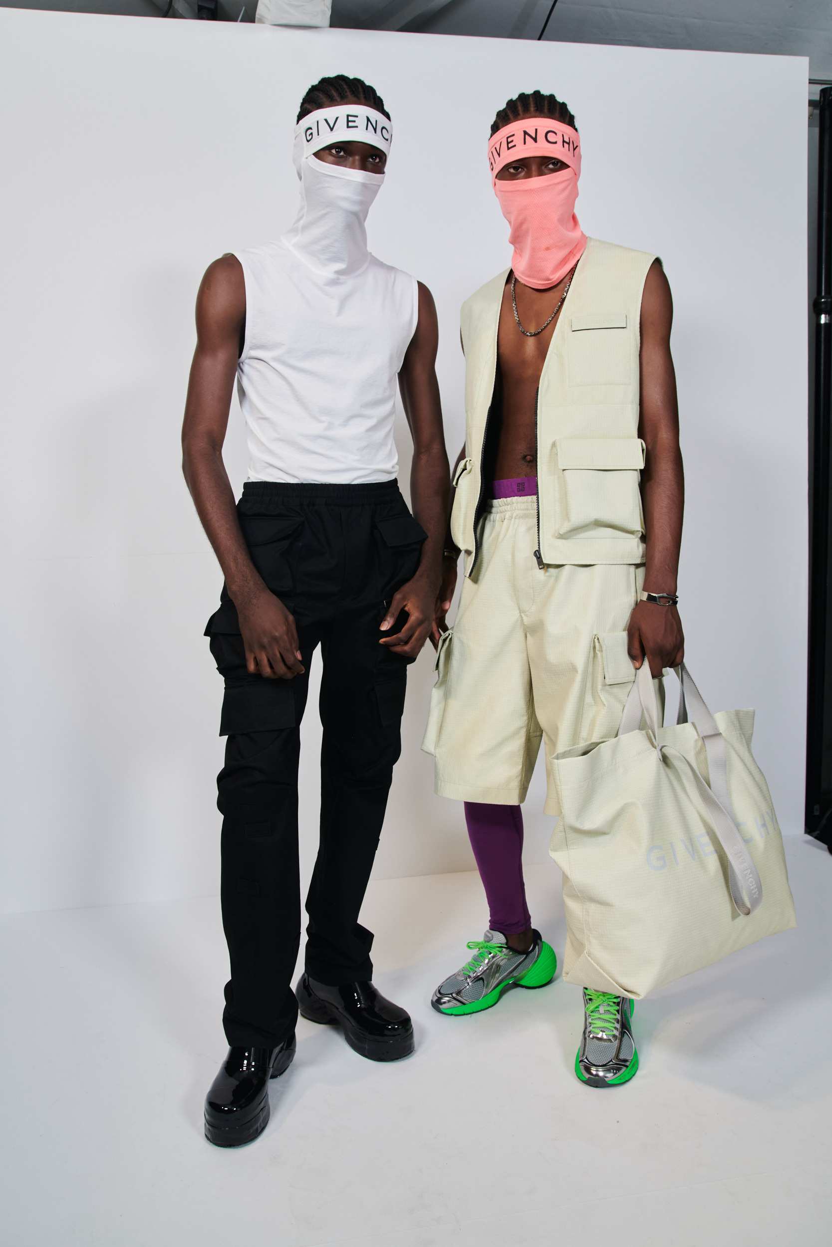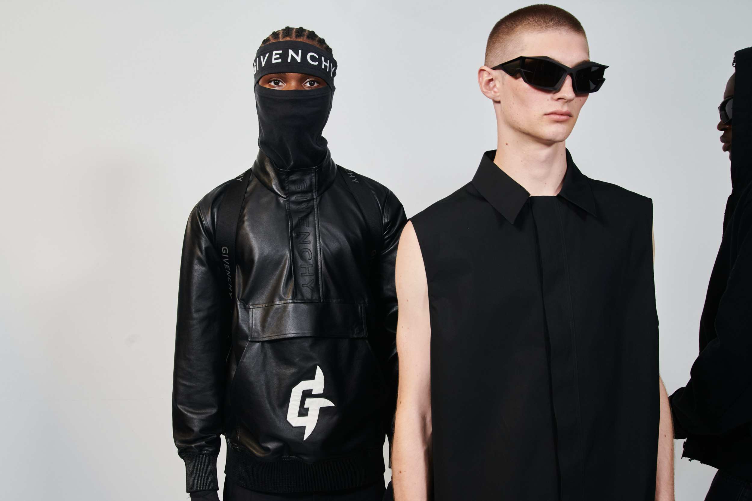 Matthew Williams bắt đầu với việc viết “GIVENCHY” đen, trắng trên những chiếc băng đô đội đầu, hay mặt nạ che mặt ẩn dưới chiếc áo cổ lọ ôm sát, như thể phần cổ áo được nhân đôi chiều dài. Trên những chiếc áo khoác da cũng có những đường viền tên thương hiệu cùng ký hiệu chữ G được khắc họa hình học. Ở giữa show diễn, khi loạt thiết kế tracksuit xuất hiện, Matthew đã thay đổi ký hiệu quen thuộc của hãng đồ boxing Everlast thành logo của Givenchy. Trên những chiếc áo len cổ lọ màu đen quá khổ với phong cách Goth ma mị, phần viền áo dường như được cắt ra, đan quấn lại và đính những ký hiệu G vô cùng phức tạp.
