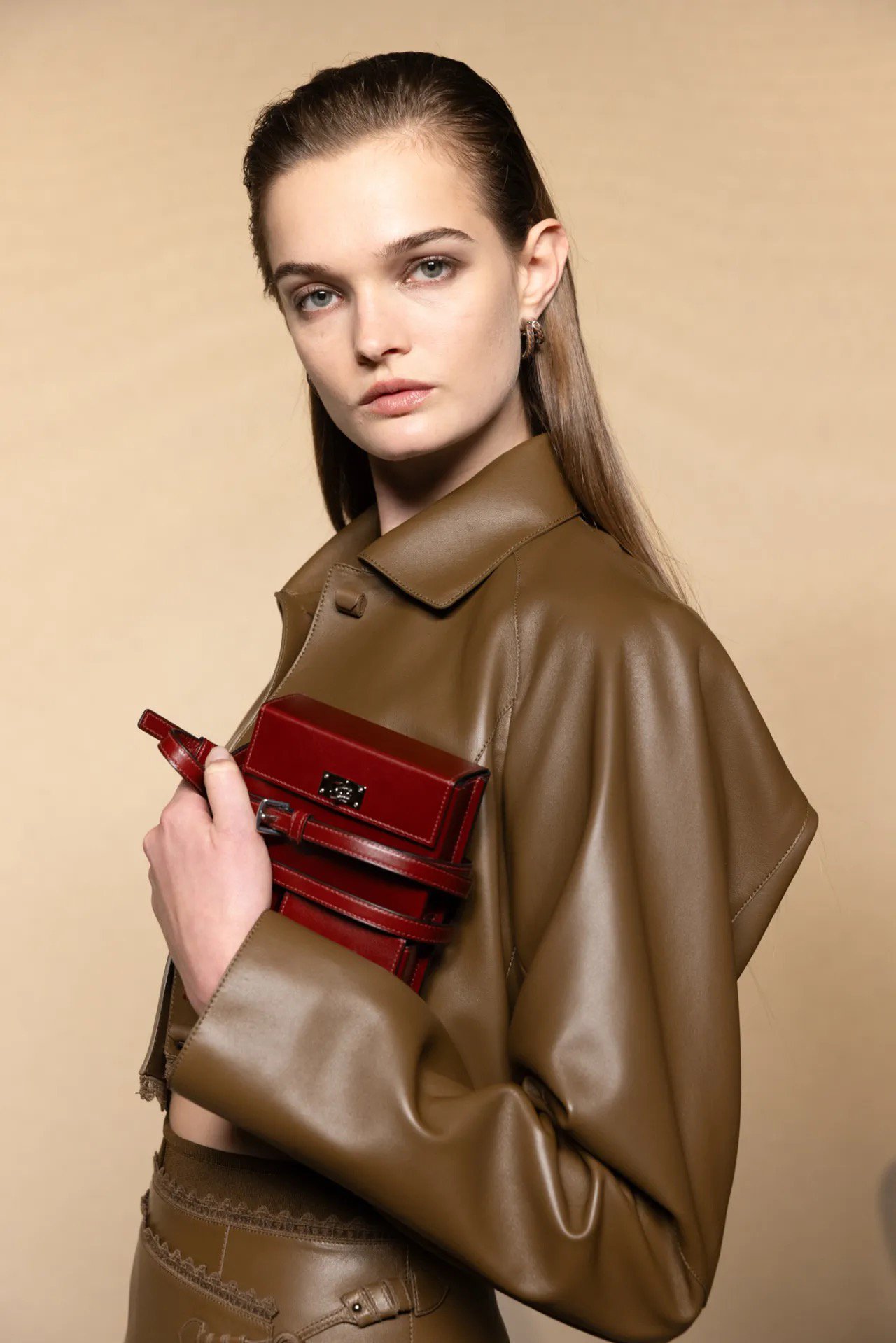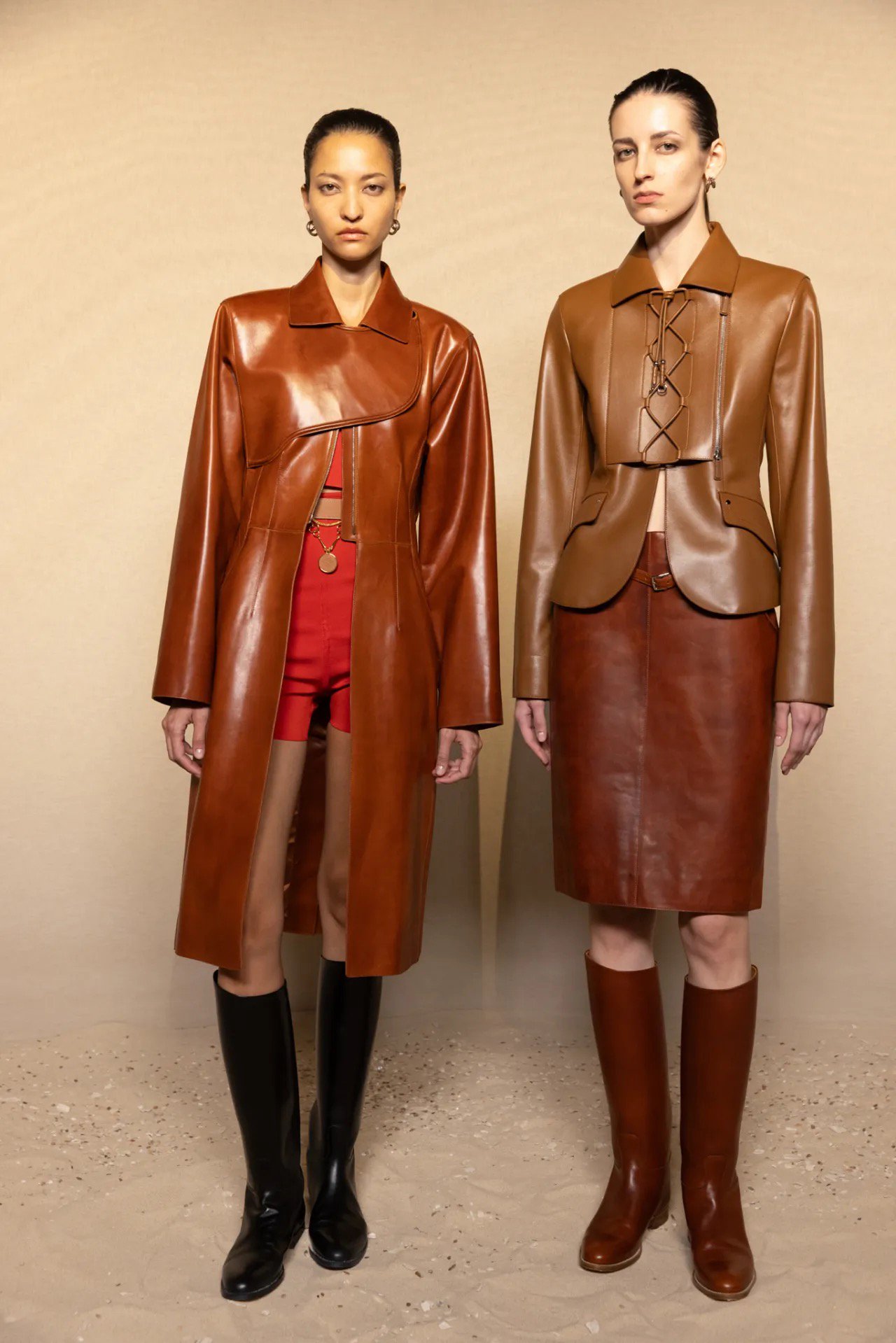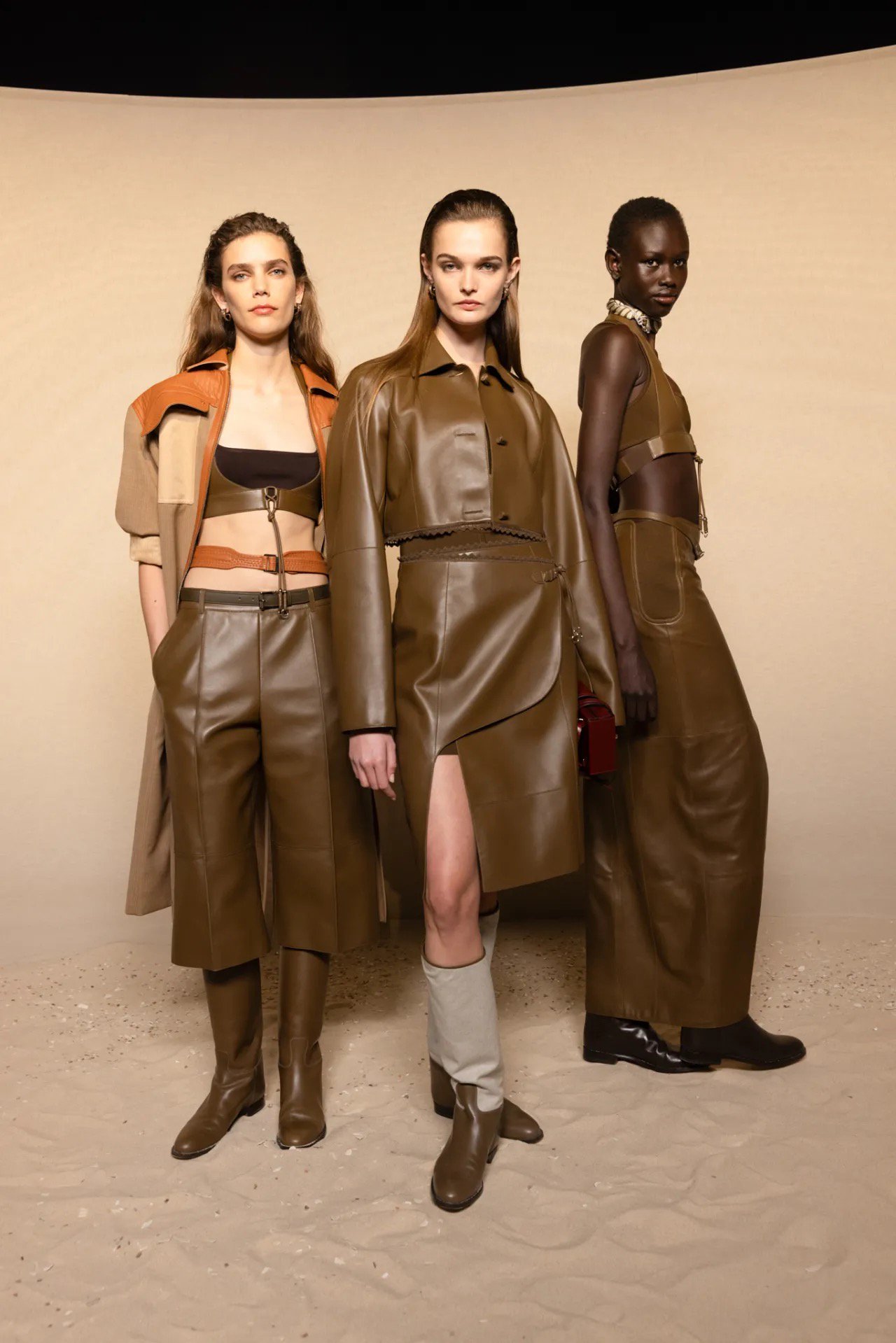 Da được triển khai như dải sắc thái cảm xúc. Từ da trơn bóng được đánh sáp thủ công (loại sáp vốn dùng để dưỡng yên ngựa) đến da lộn mịn và da dập nổi, mỗi biến thể đều mang ký ức riêng về chuyển động và ánh sáng. Dưới nắng vàng rải trên nền cát, da bóng phản sáng như kim loại, tạo cảm giác cứng cáp, gần như giáp trụ. Trong khi đó, da lộn và suede giữ lại phần “thô”, phần hơi thở tự nhiên, khiến trang phục vẫn giữ được độ ấm và hơi người.