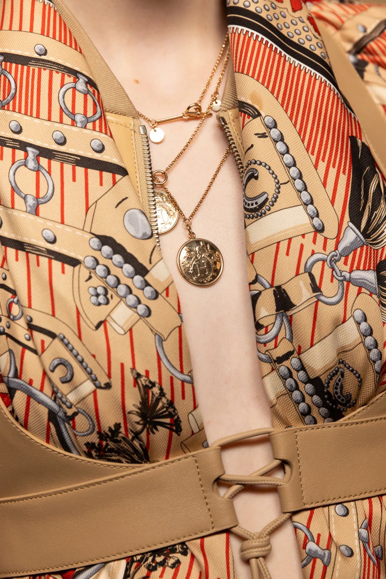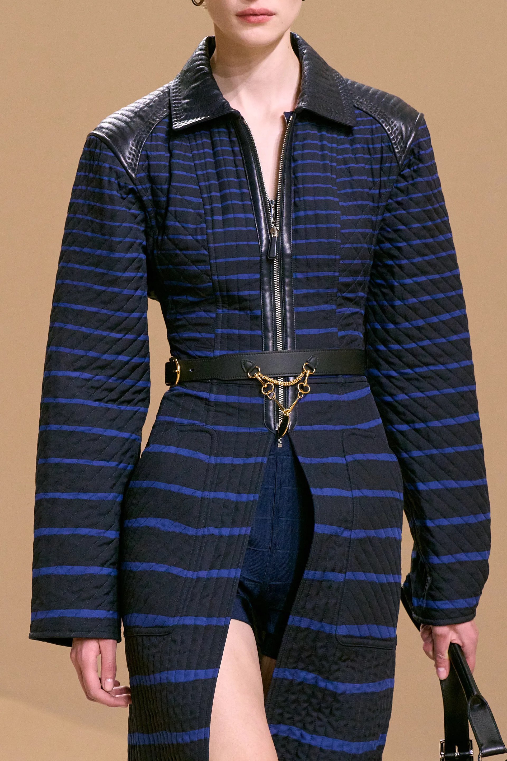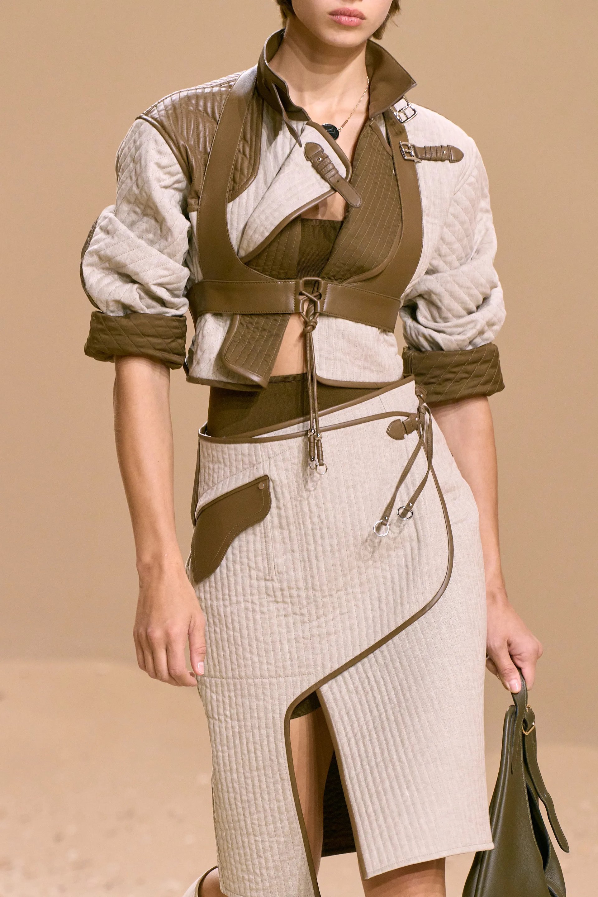 Phần cấu trúc may và chi tiết thực dụng cho thấy nỗ lực của Hermès trong việc duy trì tính công năng – điều vốn là linh hồn của di sản saddlery, nhưng đặt trong ngữ cảnh couture tinh tế hơn. Harness ở đây không còn là điểm nhấn trang trí, mà thực sự đóng vai trò như bộ khung kỹ thuật.