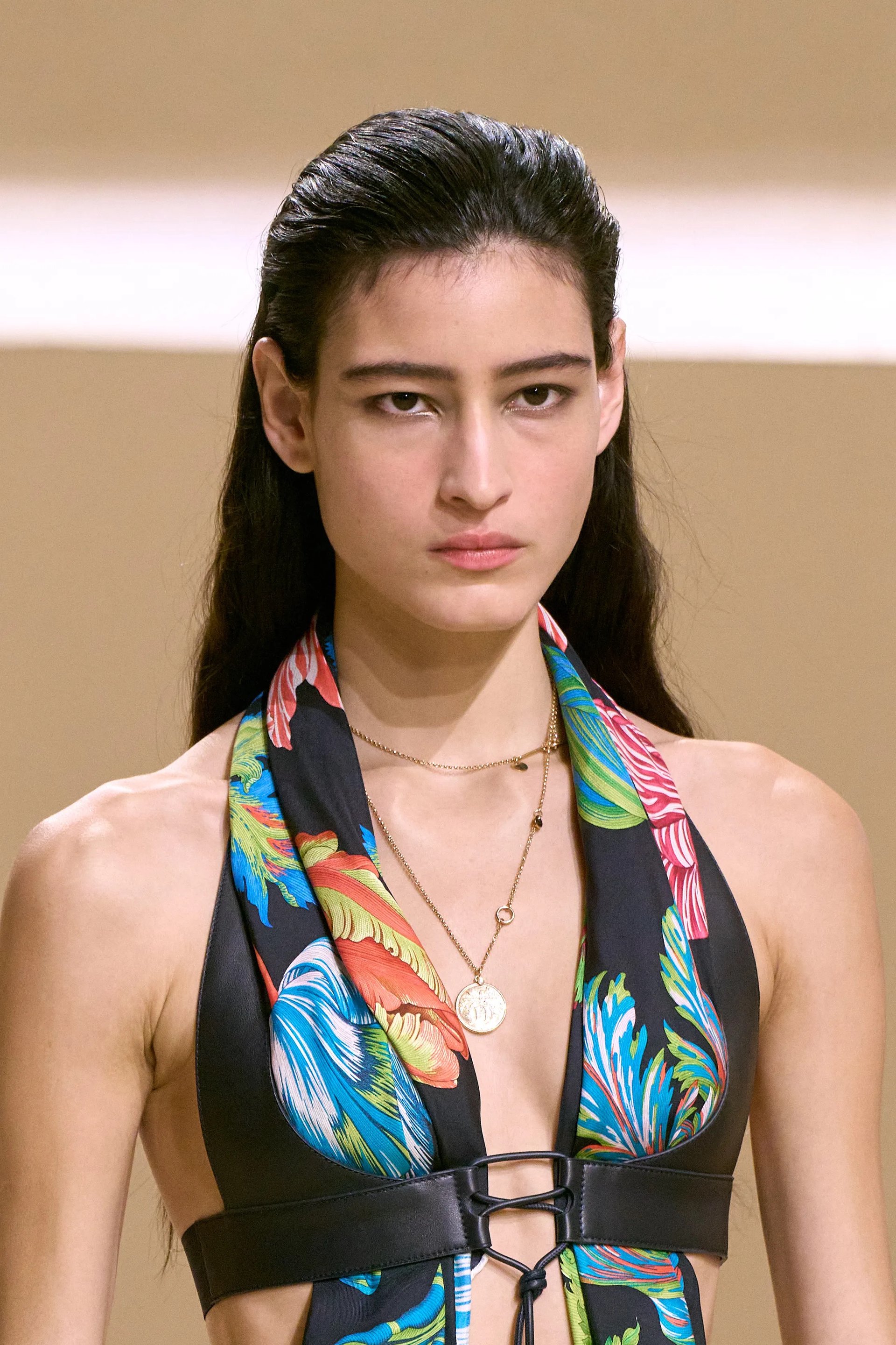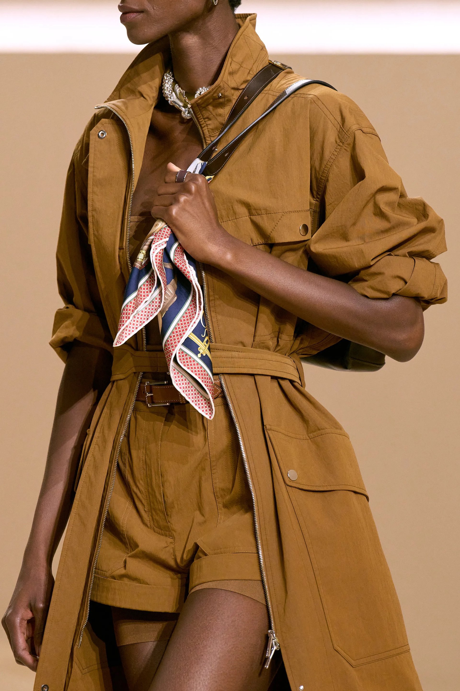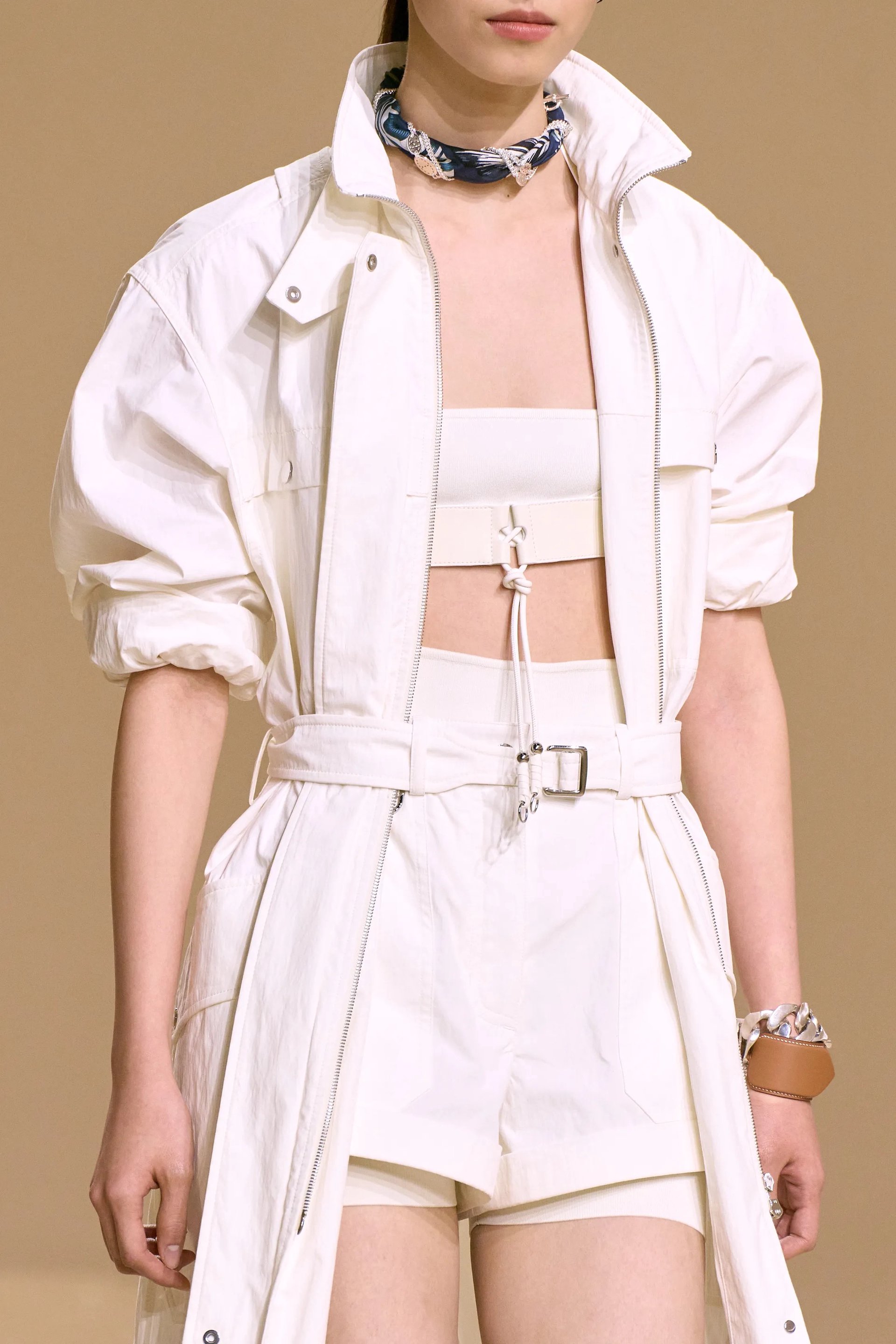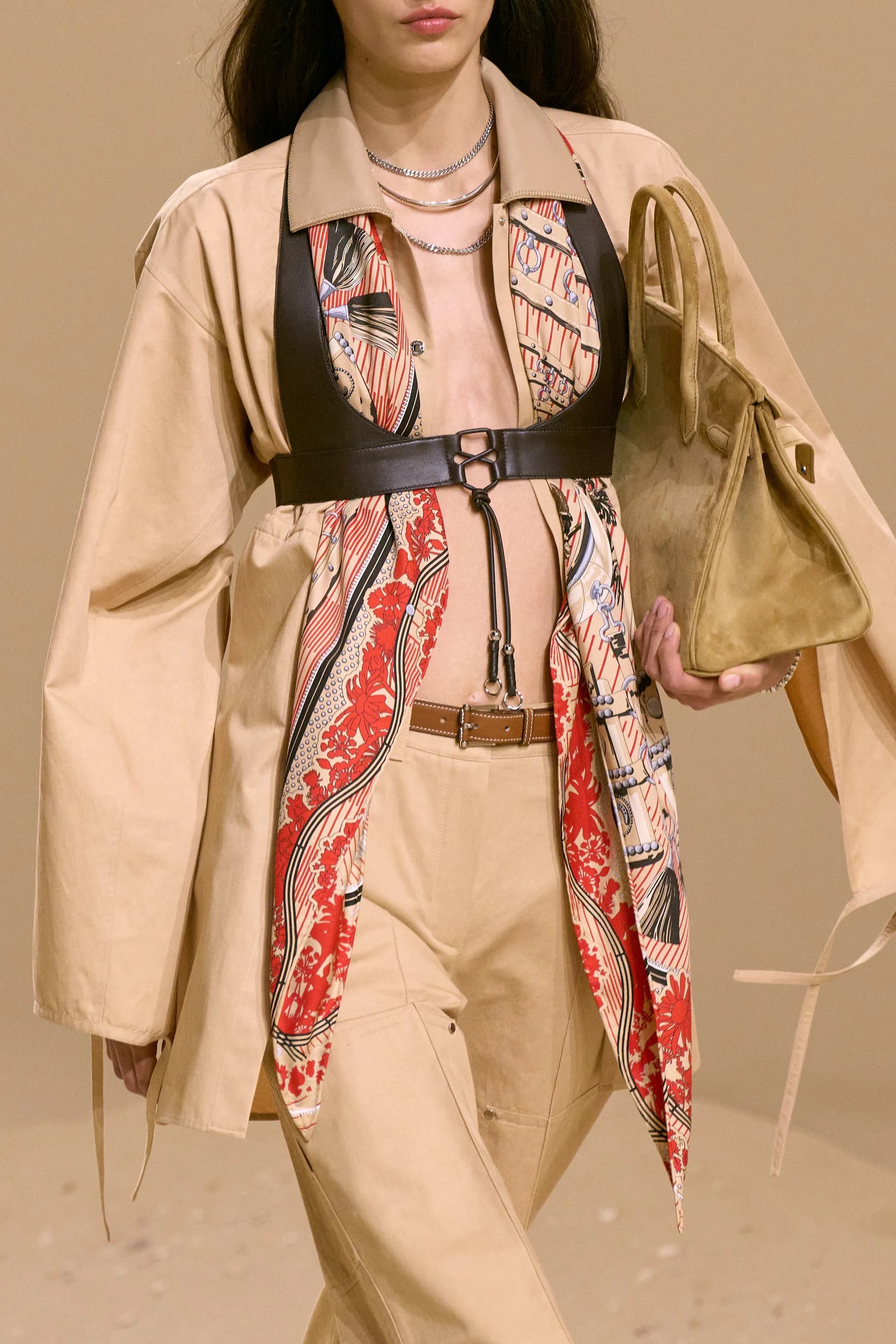Hermès tái định nghĩa toàn bộ vai trò của carré: chiếc khăn được buộc choker và đan xen cùng dây xích bạc, quấn quanh cổ rồi thả buông xuống ngực dưới lớp harness, hay len vào beltloop như chi tiết ngẫu hứng mà vẫn kiểm soát.