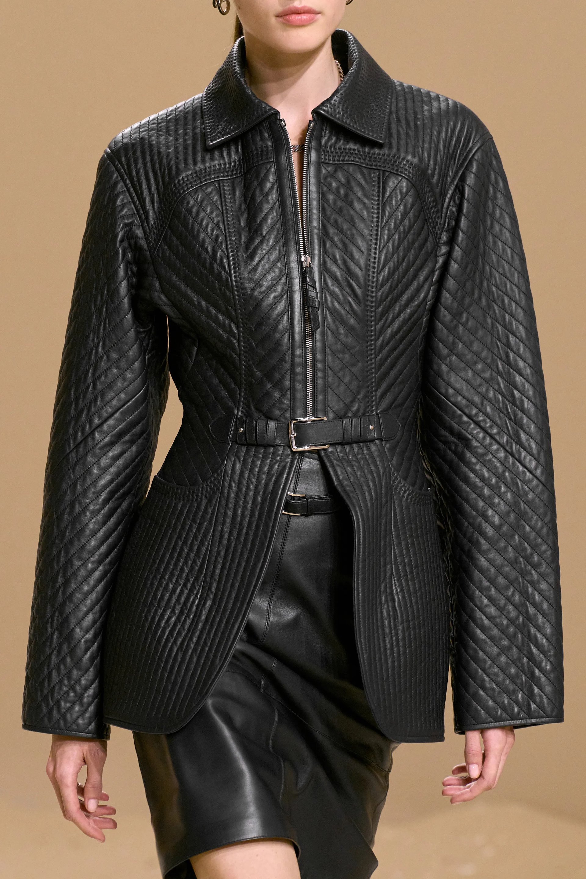Chần bông (quilting) được Vanhee-Cybulski dùng trên nền silk twill, các đường chần xuất hiện ở bra top, áo jacket hay những mảng da mềm, không chỉ để trang trí mà để “đỡ lấy” hình khối. Quilting làm nhiệm vụ của giáp: tạo độ đệm, giữ phom và gợi nhắc đến bề mặt yên ngựa – chi tiết biểu tượng được chuyển hóa thành cấu trúc thời trang.