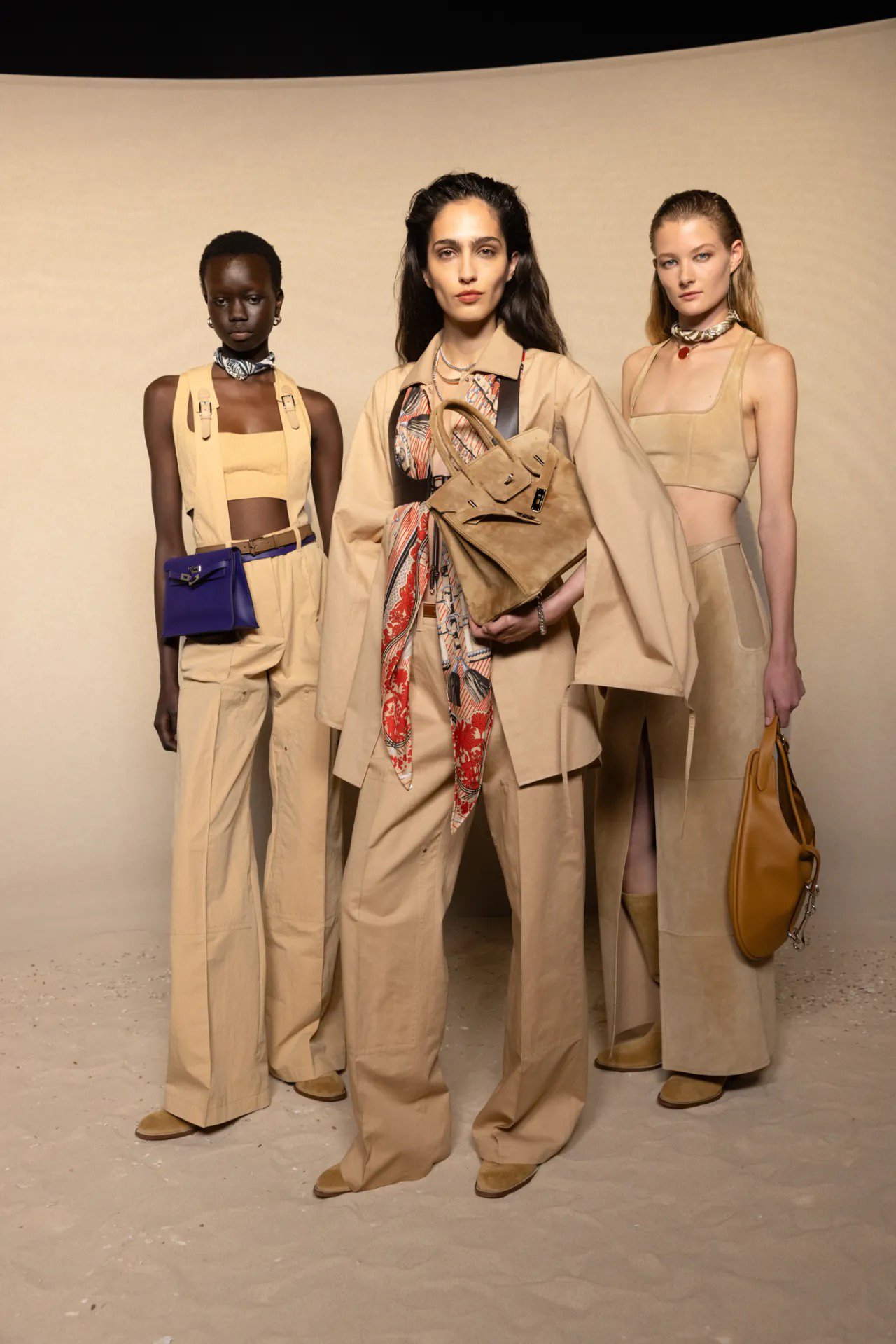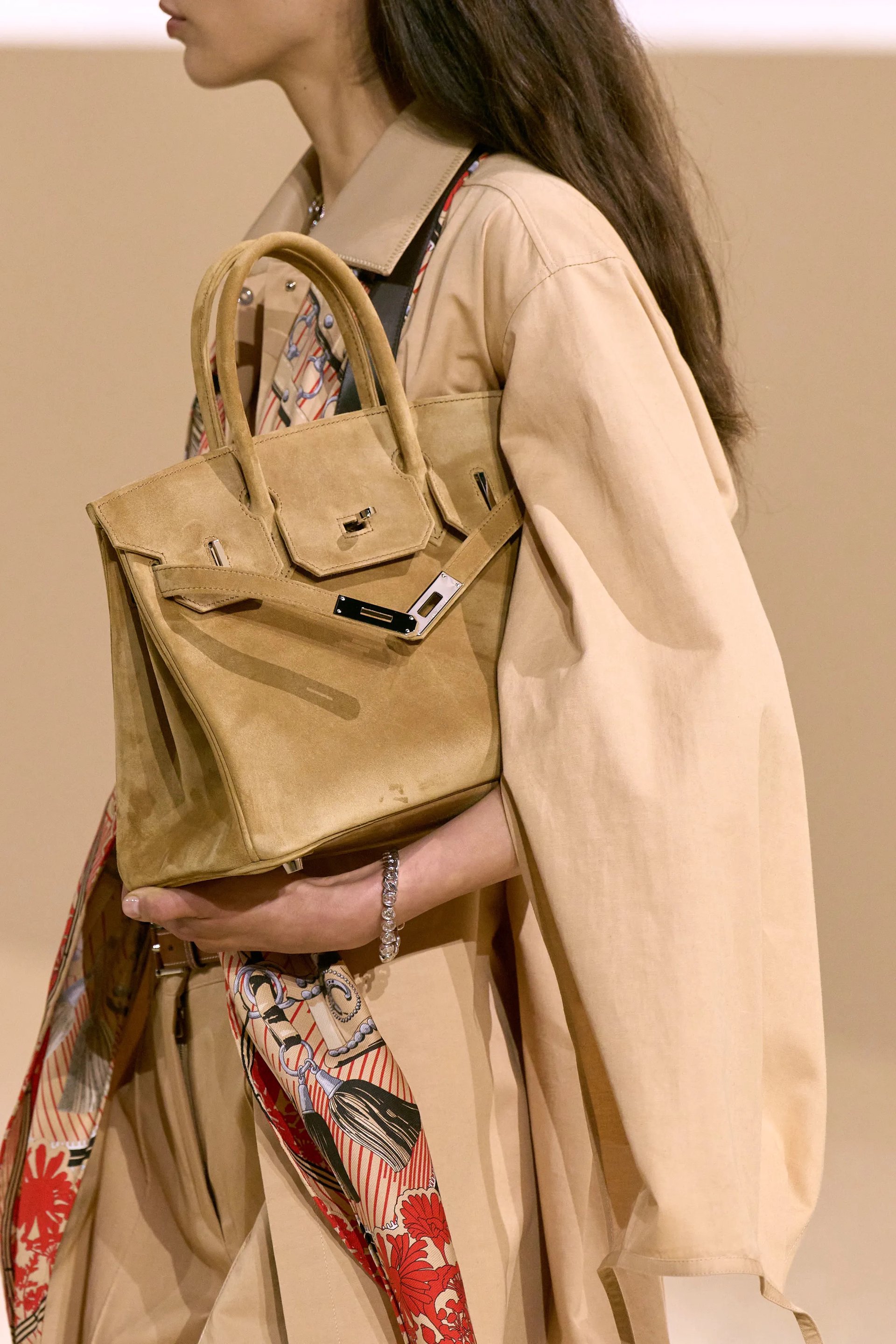 Nếu boots là nhịp nền, thì túi xách chính là ngôn ngữ mới mà Vanhee-Cybulski chọn để nói về di sản. Hai chiếc Birkin vẫn có mặt – một bản suede nâu mật ong, một bản phối da trắng-nâu cổ điển, nhưng chúng không còn là tâm điểm.