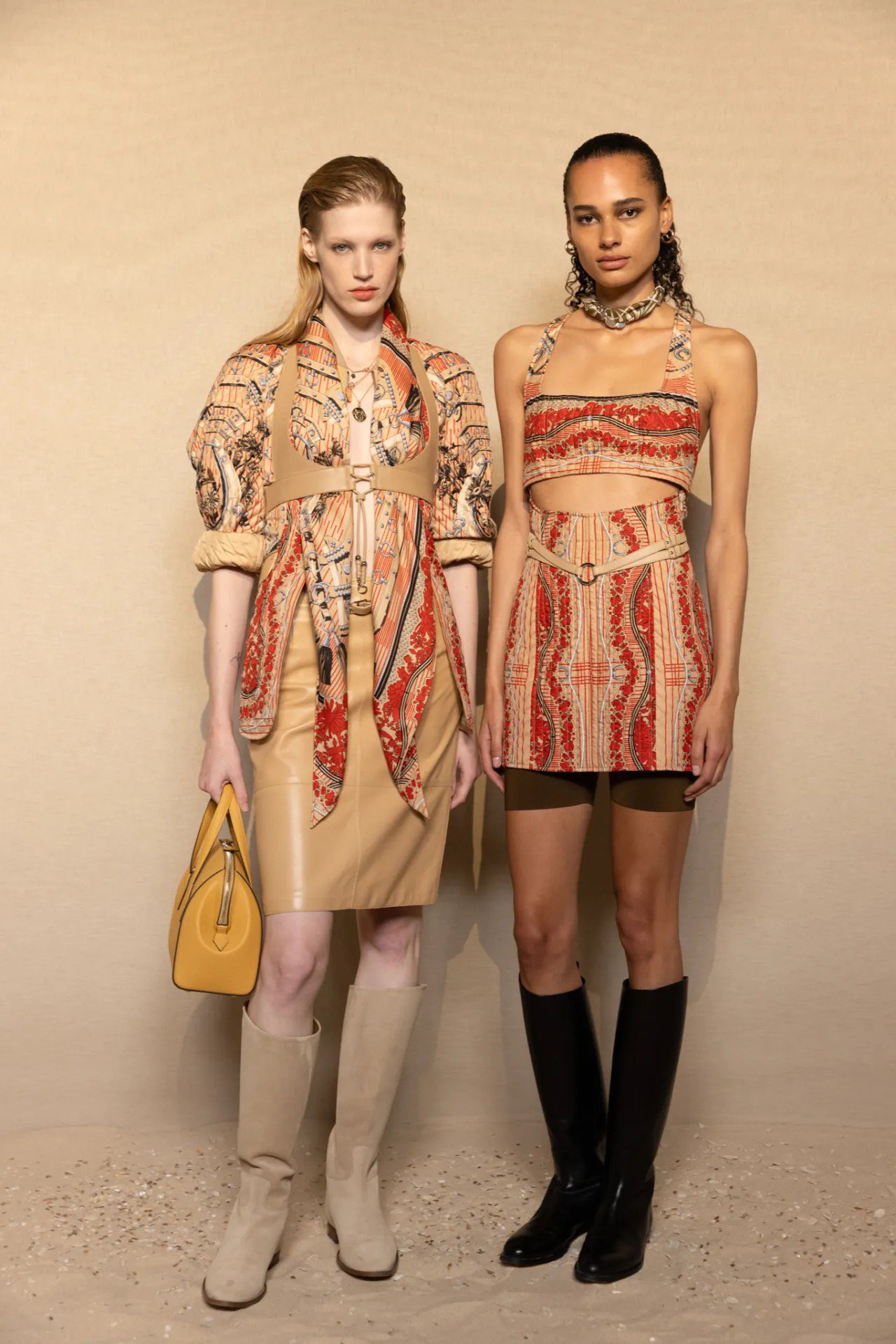 Với piqué và scarf print, Hermès mở lại kho lưu trữ của thập niên 1980, đưa những họa tiết carrés cổ điển trở về trong hình hài mới. Trên chất liệu piqué có độ đứng, hoạ tiết khăn không còn là phụ kiện bay nhẹ quanh cổ, mà trở thành phần thân áo, thân váy, corset. Cách in này khiến những motif tưởng mềm mại nay lại đứng dáng, gợi cảm giác “vải biết giữ tư thế”.