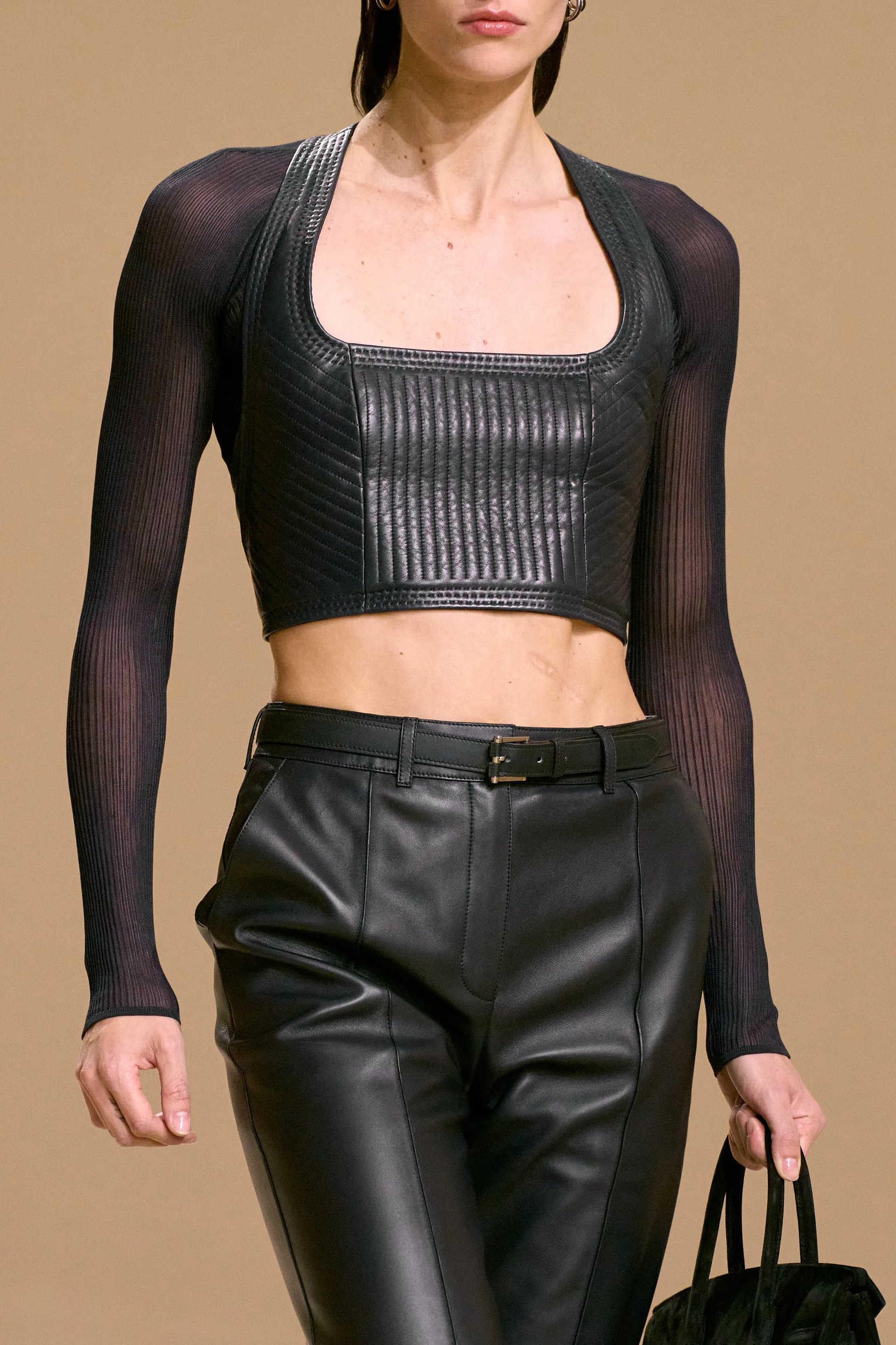 Nó neo giữ lớp bandeau hay scarf bên dưới, đồng thời tạo khối cho thân áo mà không cần đến boning truyền thống. Những sợi da mảnh được bo cạnh tỉ mỉ, vừa đủ dẻo để ôm cơ thể nhưng vẫn cứng để giữ phom, kết hợp cùng khóa kim loại có tải trọng thực tế – tất cả gợi cảm giác thiết kế có “chức năng sống”, chứ không chỉ để trình diễn.