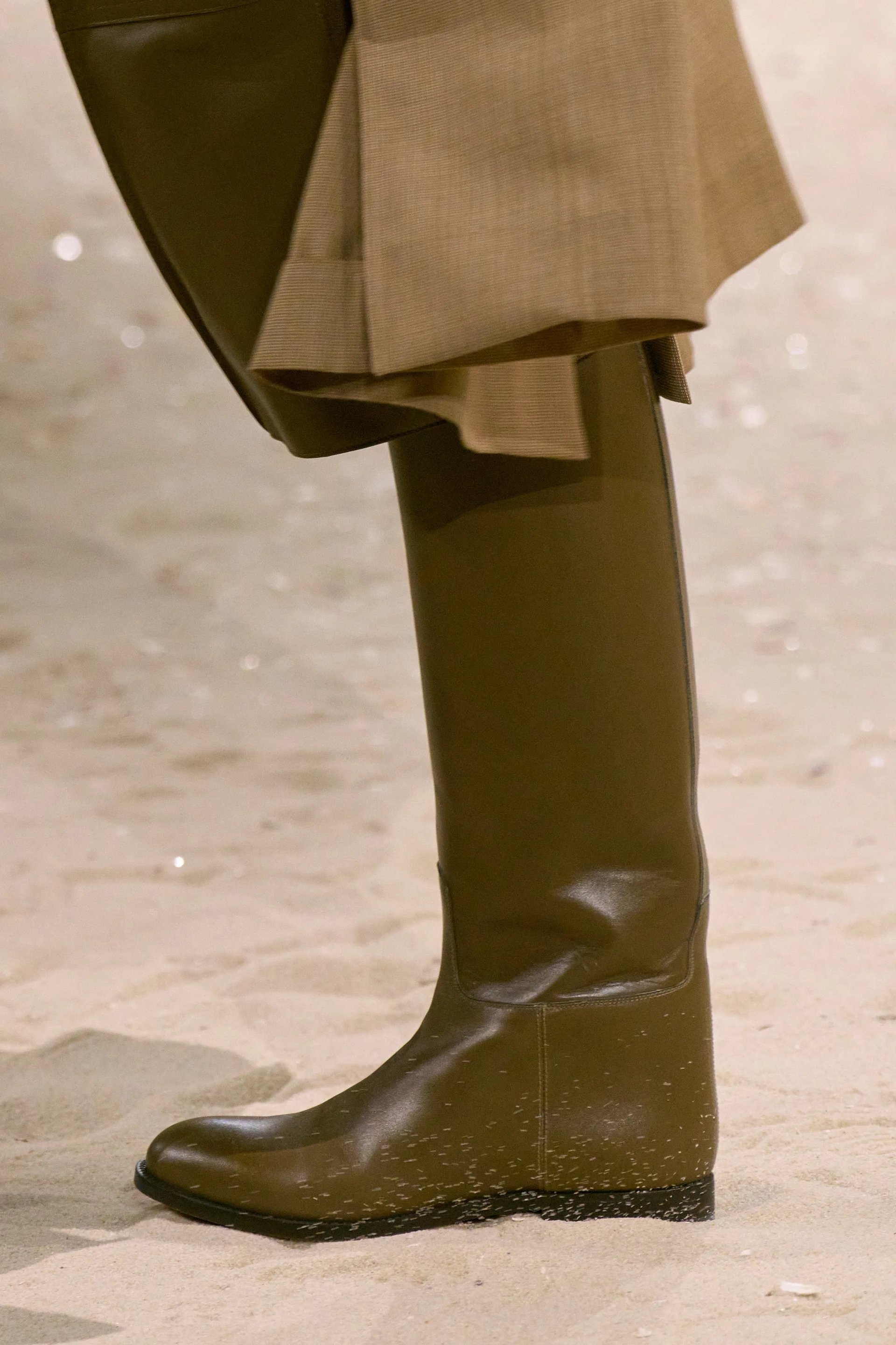 Không có cú nhấn nào tinh tế hơn việc Vanhee-Cybulski để đôi boots cưỡi ngựa chiếm trọn gần như toàn bộ sàn diễn – xuất hiện trong 55 trên 57 look. Từng đôi cao đến gối, cổ bất đối xứng kiểu Spanish topline, dáng thon dài vừa phải, gợi cảm mà vẫn kỷ luật. Có bản da đen trơn, bản nâu ngả xanh rêu, bản trắng sữa, da lộn suede, da dập nổi hay phối canvas – mỗi phiên bản đều giữ nguyên “chức năng biểu tượng”: neo tỉ lệ cho trang phục, giúp các phom ngắn (mini skirt, shorts) không trở nên nhẹ bẫng, mà được cân lại bằng trọng lượng thị giác ở phần chân.