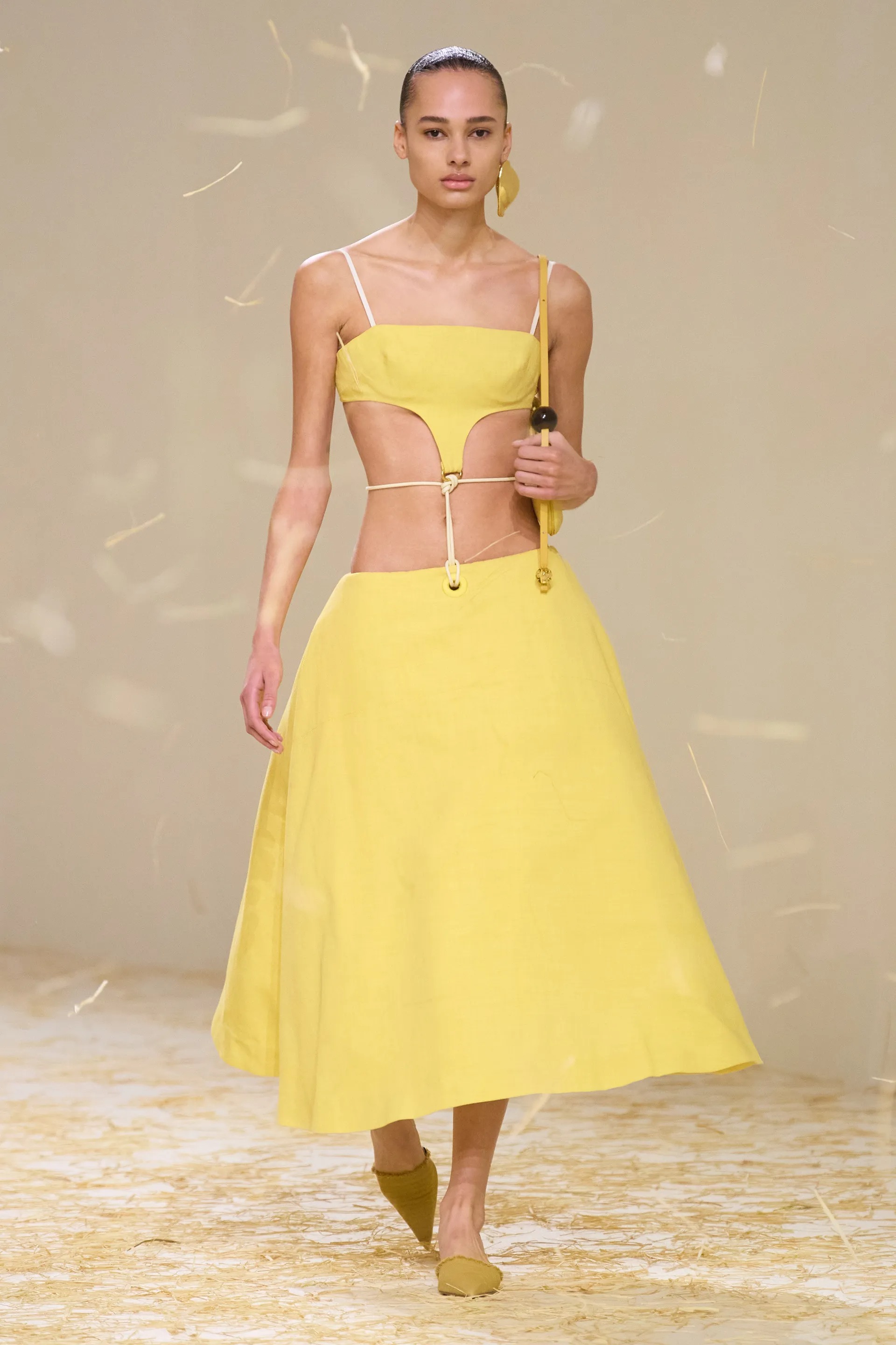 Dưới cơn bão rơm trút xuống như mưa từ trên cao, người xem sẽ có thể cảm nhận được rõ tinh thần thời trang couture xa xỉ giữa thế kỷ 20 được thêu dệt khéo léo vào ngay bộ sưu tập "see now, buy now" lần này, cụ thể là những chiếc mũ rơm raphia rộng vành quá khổ kết hợp vô cùng ấn tượng với phom dáng quần áo tỉ lệ nghịch cùng đó là những đường cut-out mềm mại, uyển chuyển mượt mà cùng đường cong của cơ thể. Dọc theo khúc cua lượn vòng của cánh đồng rơm, Jacquemus lại tiếp tục thuyết phục cái gật gù của giới mộ điệu khi liên tục thả xen kẽ xuống đường băng những vẻ ngoài thời trang vừa thời thượng nhưng lại vừa phù hợp cho tất cả mọi người, phá tan mọi rào cản về giới từ những bộ suit lịch lãm, cuộc đổ bộ của rơm raphia trên quần áo, mini skirts, denim đến những chi tiết "khoe da thịt" gợi cảm chết người.