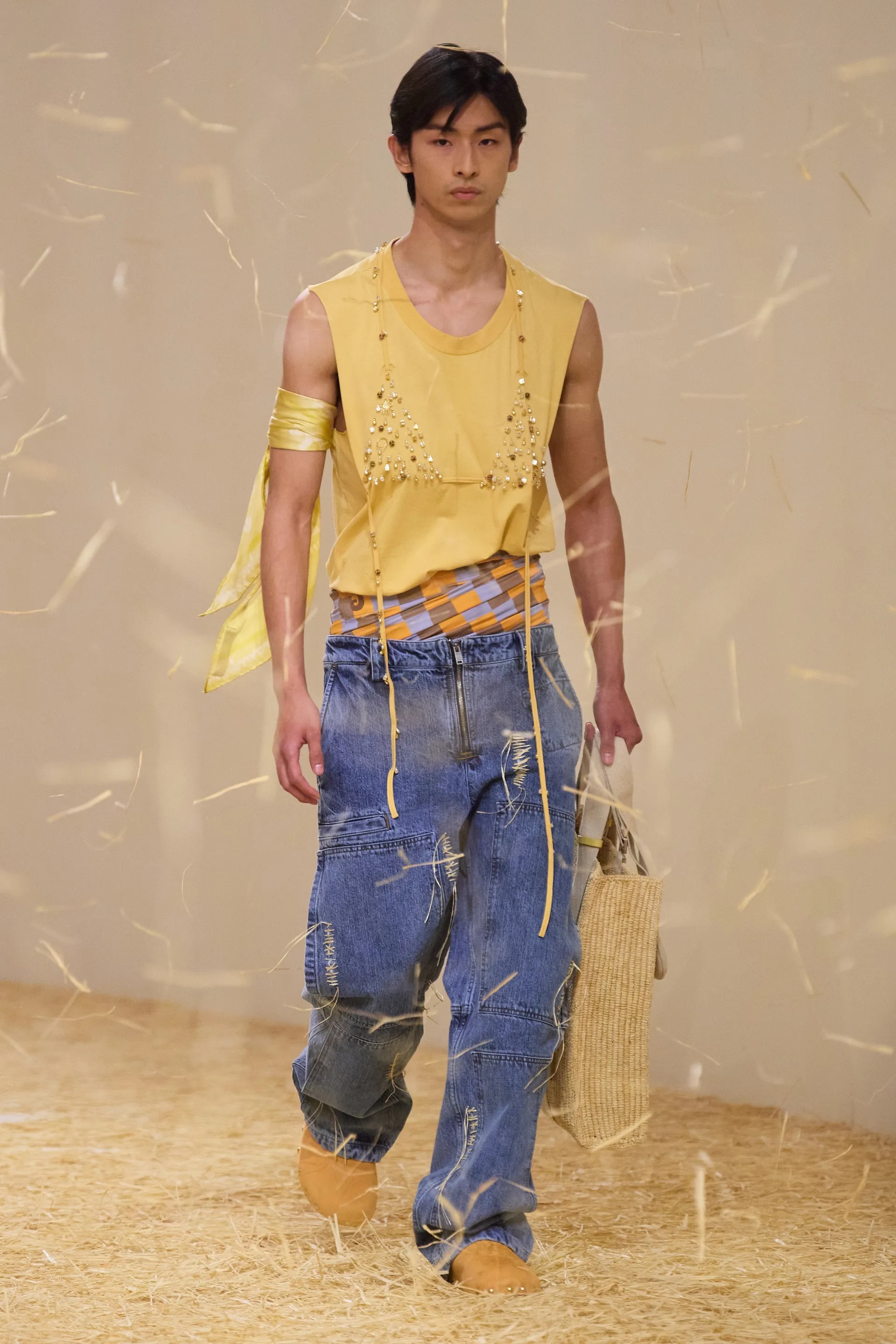 Jacquemus đã tự phóng đại mùa hè của mình bằng những chiếc mũ rơm to tướng đầy chế giễu và cả những phiên bản mũ cối được nhân đôi nhân ba kích thước từ năm 2017. Với nhà mốt, rơm raphia không chỉ là chất liệu phù hợp cho thời trang mùa hè mà còn là chất liệu khơi gợi nên nhiều cung bậc cảm xúc, siêu thanh lịch nhưng cũng quyến rũ tựa lông thú. Vì thế, ở Jacquemus Spring 2023, người xem còn bất ngờ với một diện mạo hoàn toàn mới của những chiếc khăn choàng, áo choàng lông - khi được thay thế một cách tinh tế bằng vô vàn sợi rơm khô được đính kết tinh tế, đồng thời còn thán phục với sự kết hợp hài hòa giữa những bộ suits tinh tế và những items denim phóng khoáng.