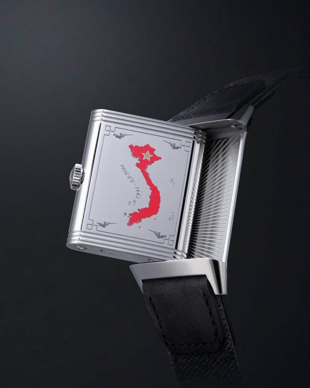 Được xem như lời tri ân văn hóa, “Reverso Tribute Vietnam” gây ấn tượng với mặt lưng khắc hình bản đồ Việt Nam, được hoàn thiện bằng công đoạn sơn thủ công lấy cảm hứng từ màu sắc quốc kỳ, điểm xuyết họa tiết chim Lạc cùng dòng khắc ngày Quốc khánh Việt Nam. Bên trong, bộ chuyển động Calibre 822 do chính Jaeger-LeCoultre phát triển đã thể hiện trình độ chế tác đỉnh cao cũng như cam kết về nghệ thuật thủ công mang giá trị tinh thần sâu sắc của thương hiệu. Mỗi phiên bản đi kèm hộp trưng bày sơn mài đặc biệt, được thương hiệu thủ công cao cấp của Việt Nam - Hanoia chế tác riêng.