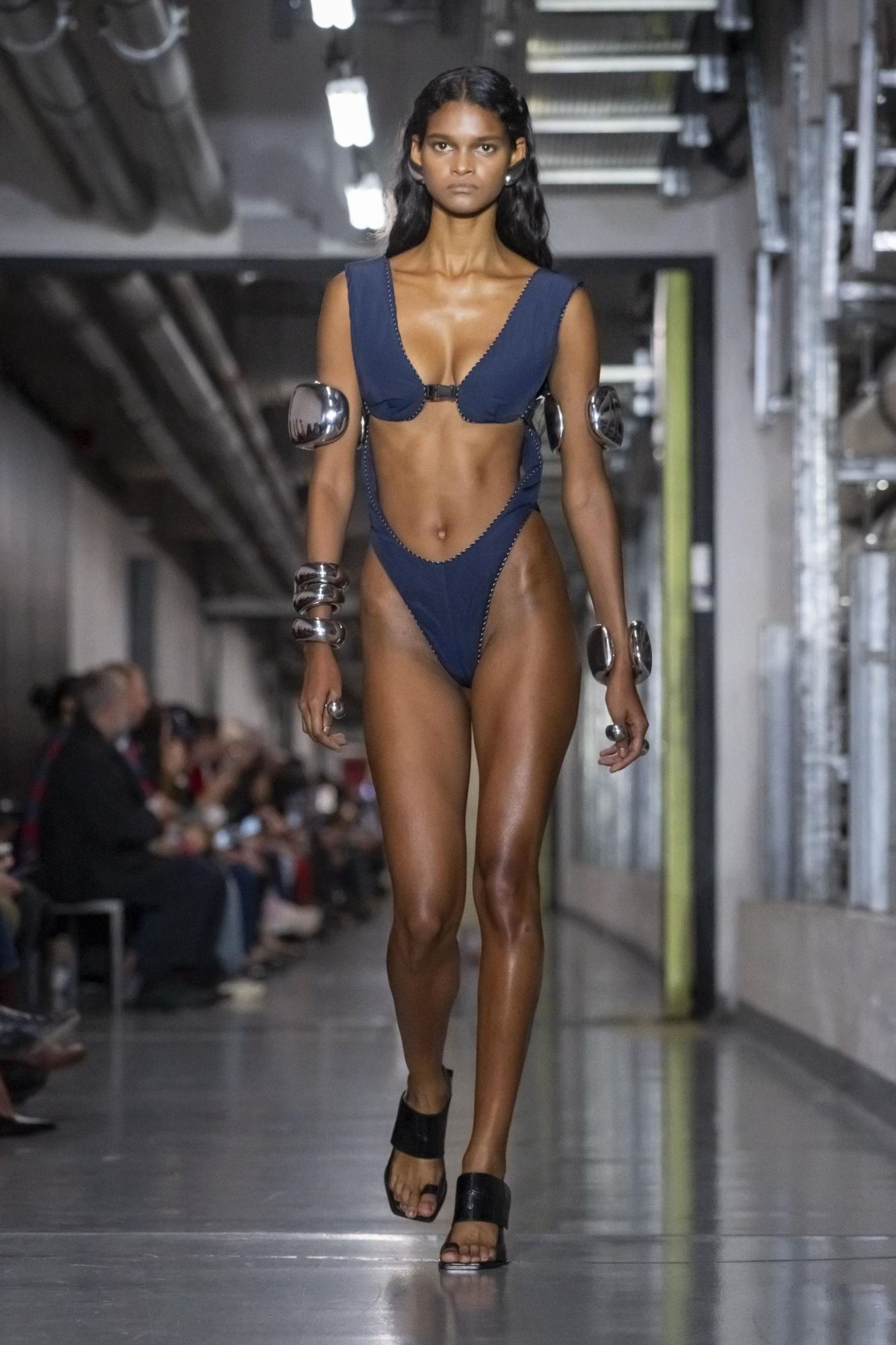 Tiếp nối là bodysuit cắt cao cho cả nam lẫn nữ, áo lưới in hình xăm 3D, trench coat để lộ eo trần, bikini cùng quần đạp xe in logo Junior Gaultier đầy hóm hỉnh nhưng bất kính vô cùng. Trong khi, những dải sọc thủy thủ trứ danh, nay được xoay dọc thay vì ngang; và váy trắng mô phỏng chiếc mũ thủy thủ bằng đường viền may lộn ngược. Đâu đó còn thấp thoáng tinh thần punk nổi lạon từ bộ sưu tập Les Tatouages năm 1994 – một trong những chương huyền thoại của thời trang thập niên 90. Và cả những chi tiết gợi nhớ phục trang mà JPG từng thiết kế cho Milla Jovovich trong phim The Fifth Element (1997).