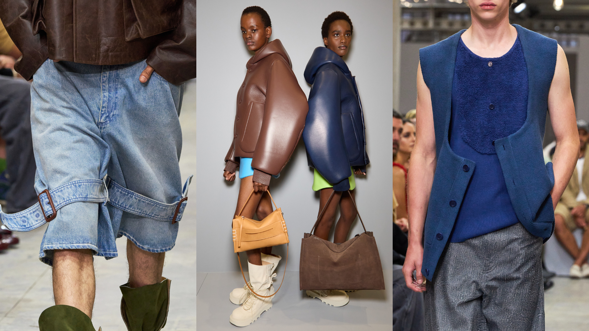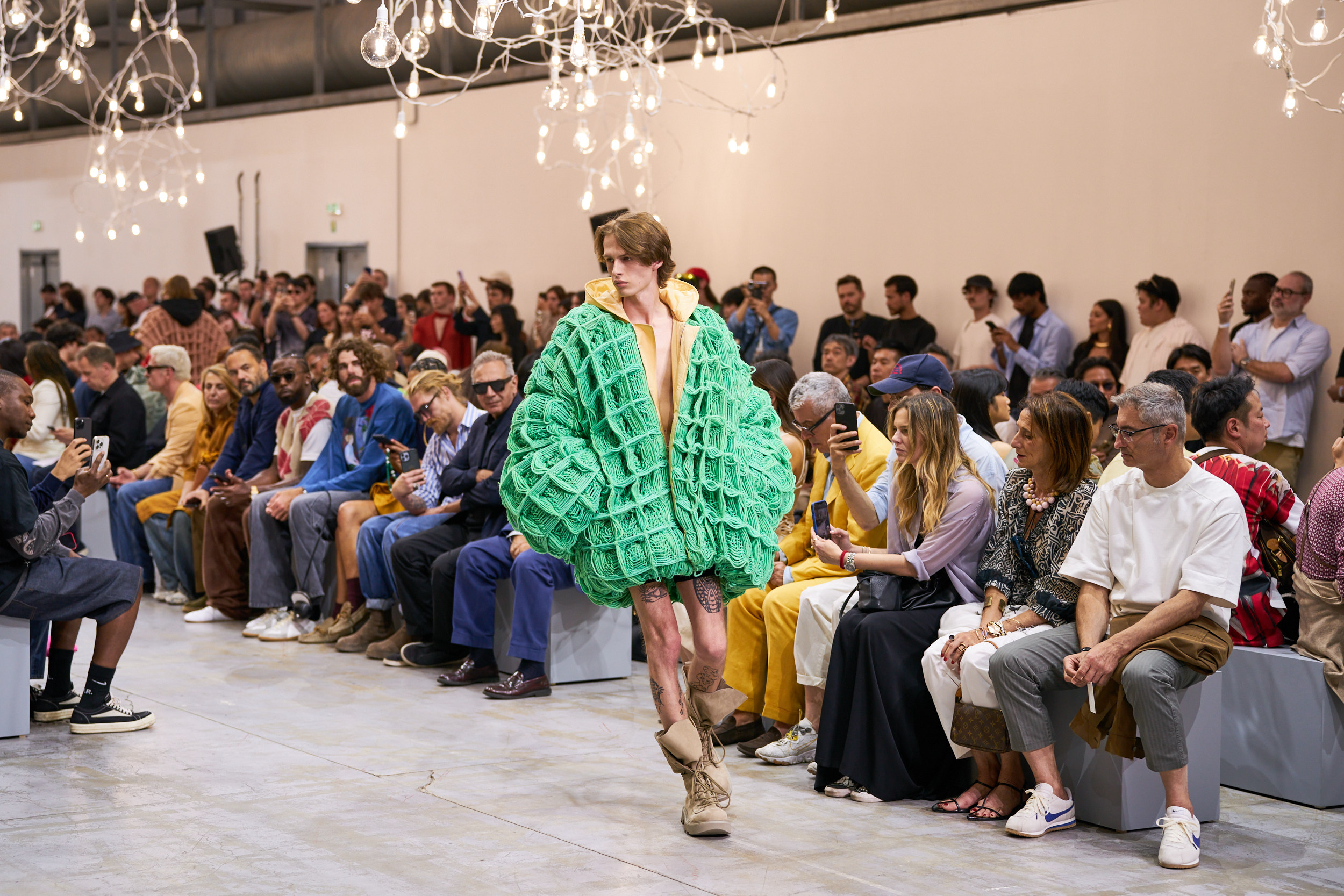 Nối đuôi là những chiếc áo khoác bomber len khổng lồ được dệt kim thô với bề mặt 3D hình bánh croffle, layering cùng những chiếc áo nỉ bằng da. Khi người mẫu di chuyển, chúng chuyển động bay bổng như hệt đám mây bồng bềnh. Ngôn ngữ thiết kế dí dỏm đặc trưng của nhà thiết kế đã được tỏa sáng rực rỡ trên những chiếc váy denim cộc tay, nhiều túi và chiếc đuôi tôm bất đối xứng.