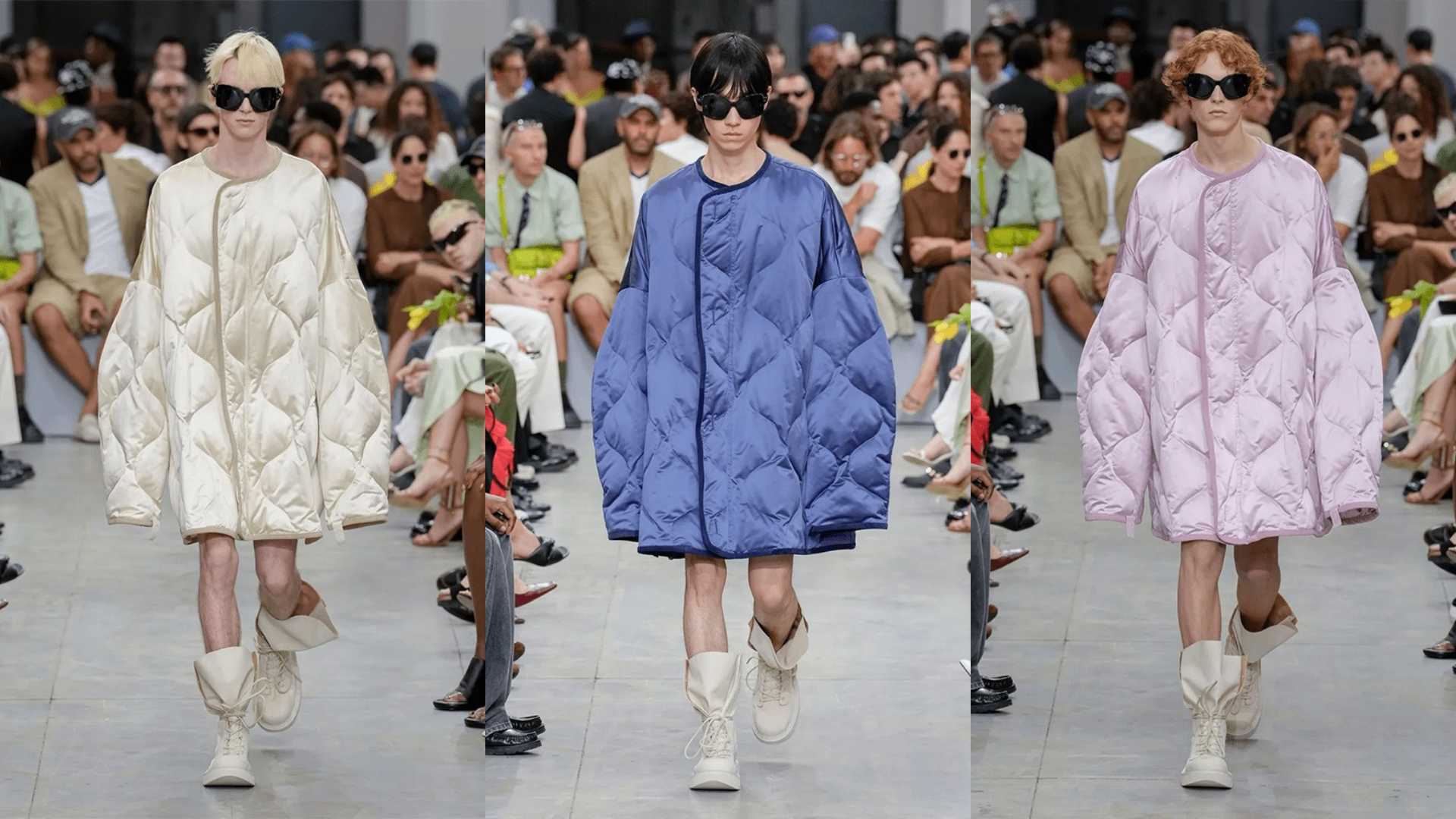 Tiến sâu vào giấc ngủ REM (xuất hiện trong khoảng 70-90 phút sau khi ngủ), JW Anderson Spring 2025 Menswear trình làng những chiếc áo hoodie phồng phủ trên một lớp sơn bóng tương tựa những quả bóng bay được bơm căng sắp nổ, và những chiếc áo độn bông, tay phồng và xẻ tà giống như chiếc gối êm ái.