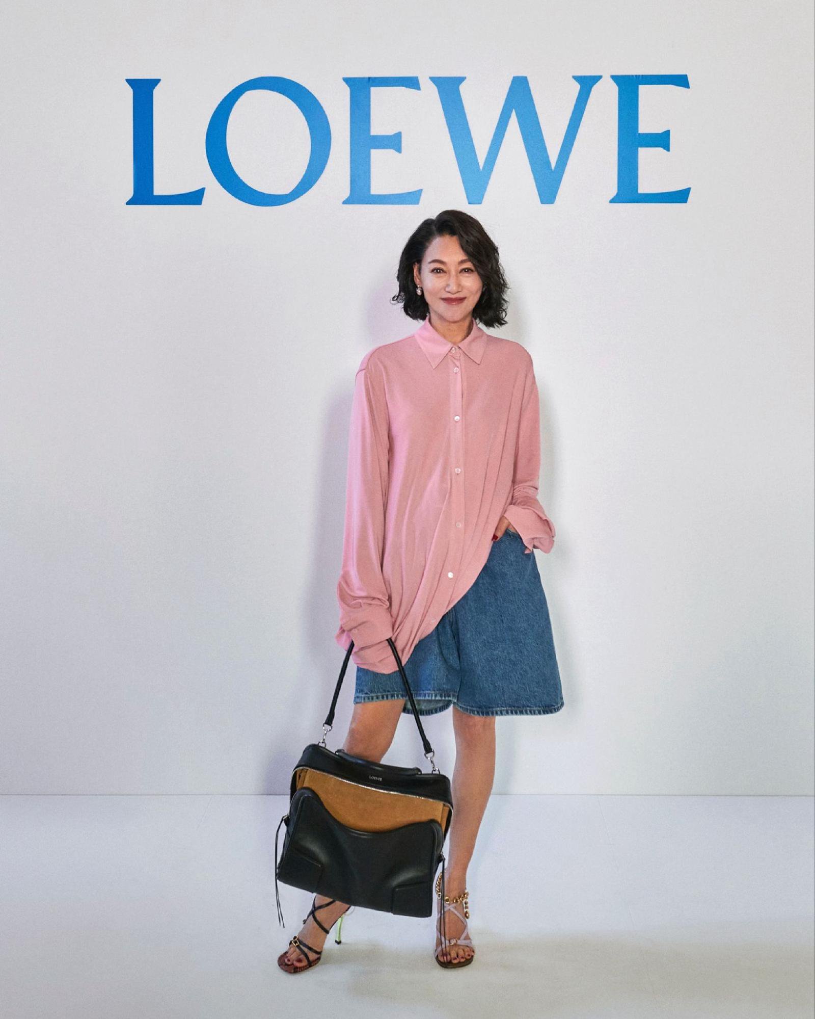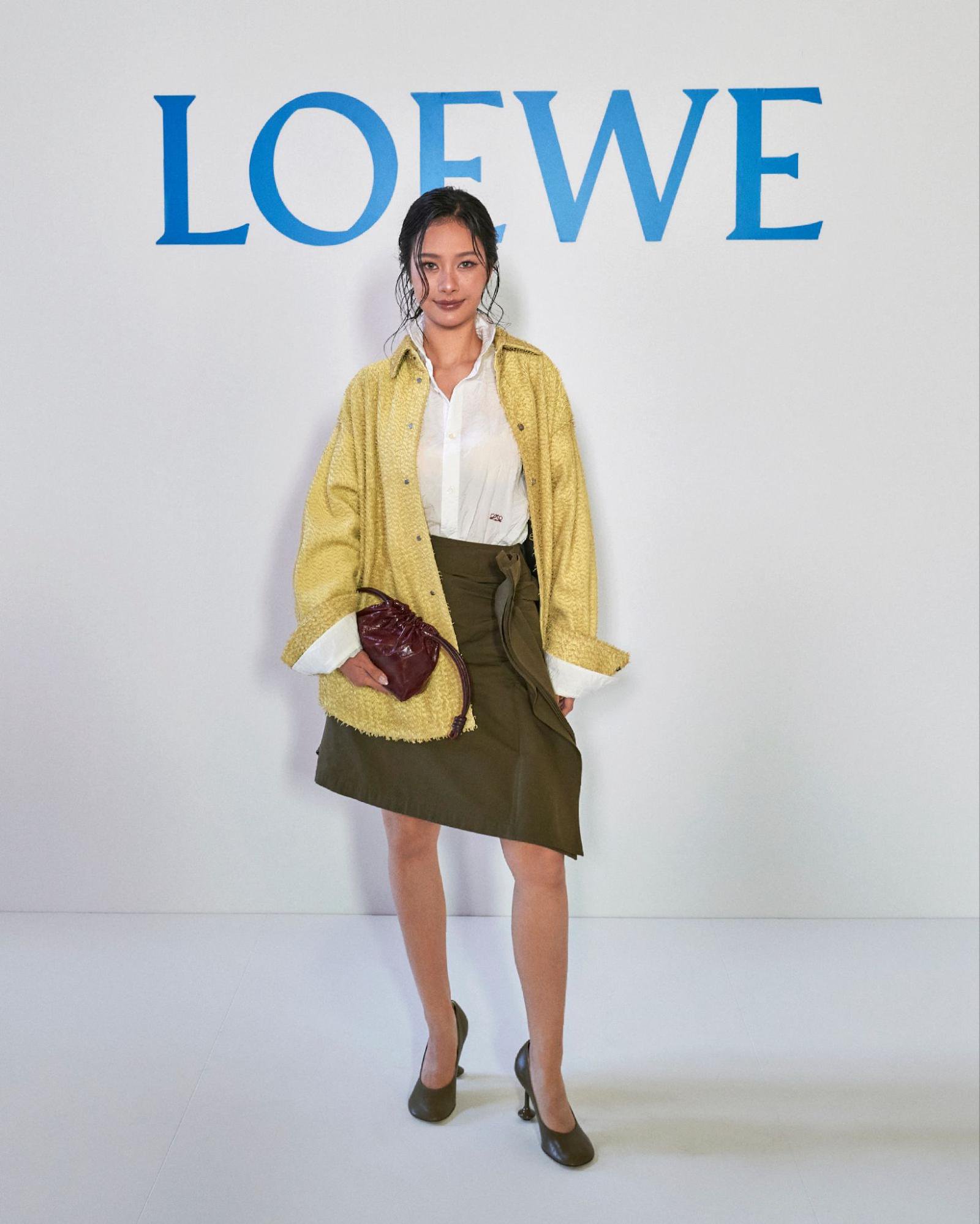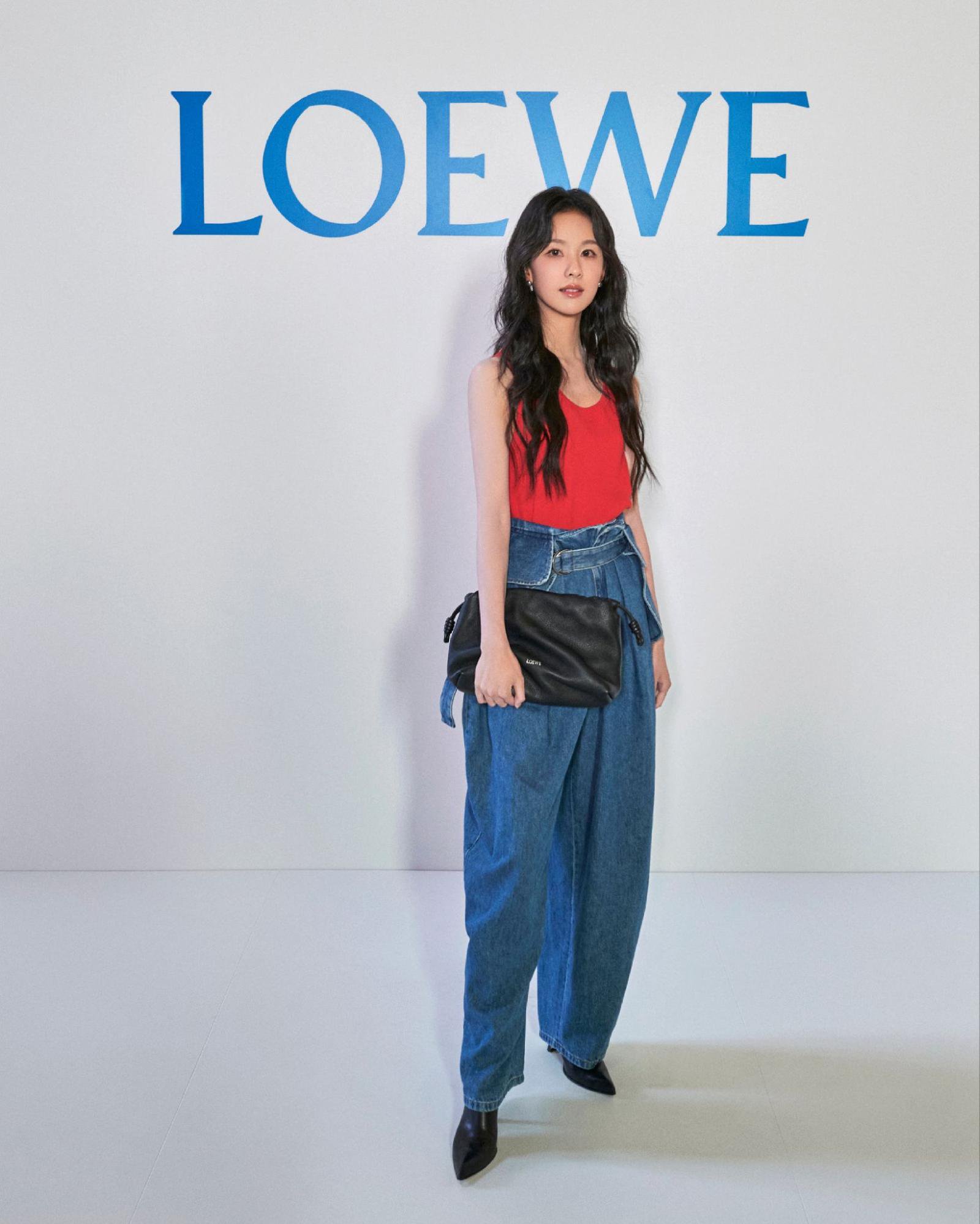 Lần đầu góp mặt trong show dưới vai trò đại sứ thương hiệu, Trần Đô Linh chọn tank top đỏ phối quần jeans ống rộng và túi Flamenco Purse đen gợi tinh thần casual chic nhưng vẫn tuân theo tính cấu trúc đặc trưng trong thẩm mỹ LOEWE.