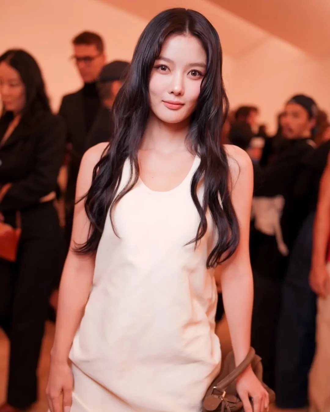 Diễn viên Kim Yoo Jung chọn váy slip dress màu kem tối giản kết hợp với túi Puzzle Featherlight, mang đến hình ảnh trong sáng và nhẹ nhàng quen thuộc của cô nàng.
