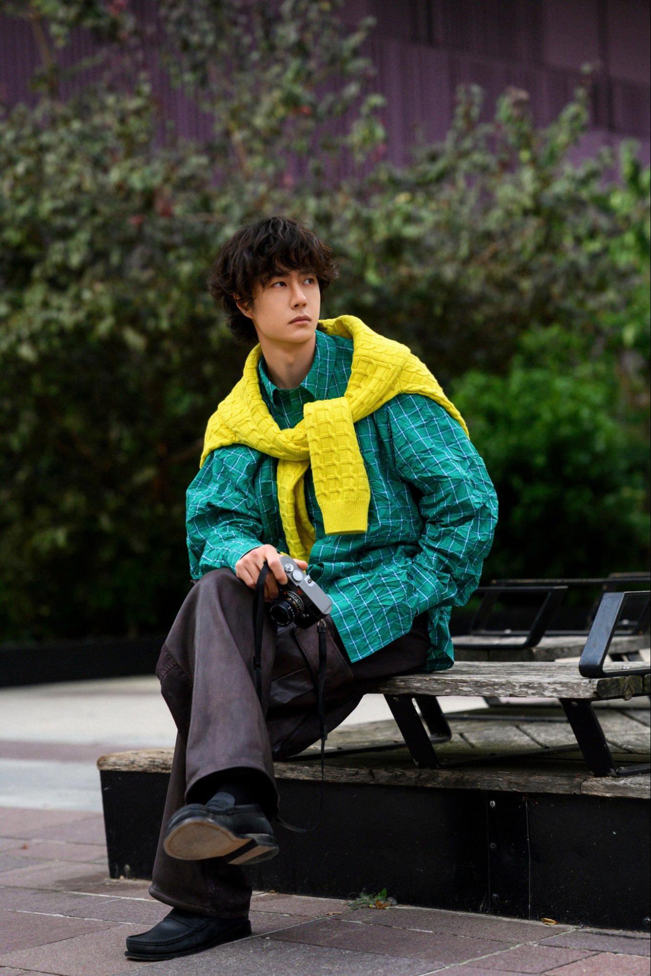 Vương Nhất Bác xuất hiện trong bộ trang phục mang tinh thần utilitarian, kết hợp sơ mi caro xanh lá với áo len vàng và quần cargo đen. Từ việc lựa chọn trang phục đến cách xử lý phom dáng, hình ảnh của anh cho thấy cách LOEWE định hình tính nam đương đại qua những chi tiết khá tối giản nhưng giàu tính ứng dụng.